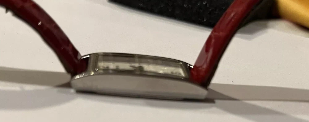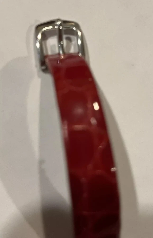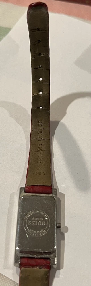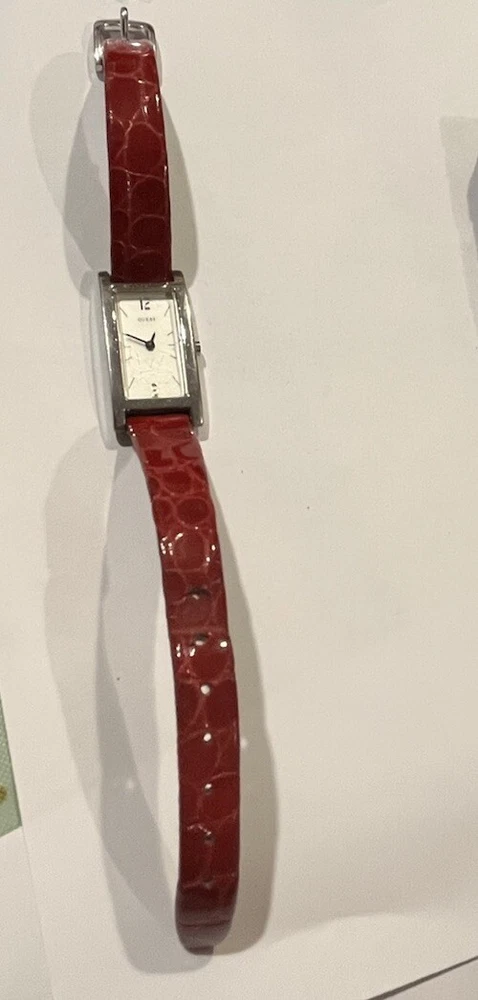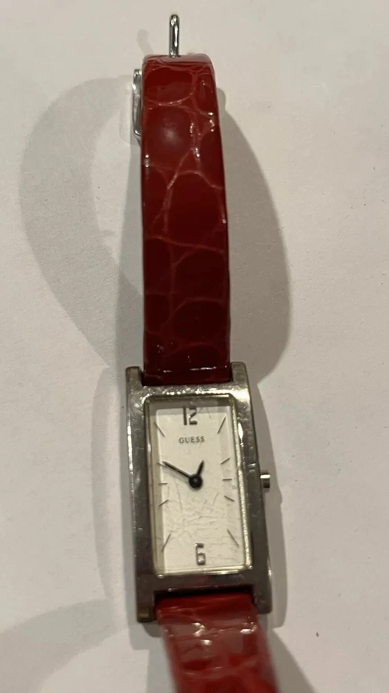 Ladies Vintage Analog Guess Watch, Red Leather Band , Silver tone Case, White Face, New Battery Works Great! Strap shows wear as you can see in photos but definitely wearable. Beautiful red color leather. Case measures approximately 28mm tall by 17mm wide