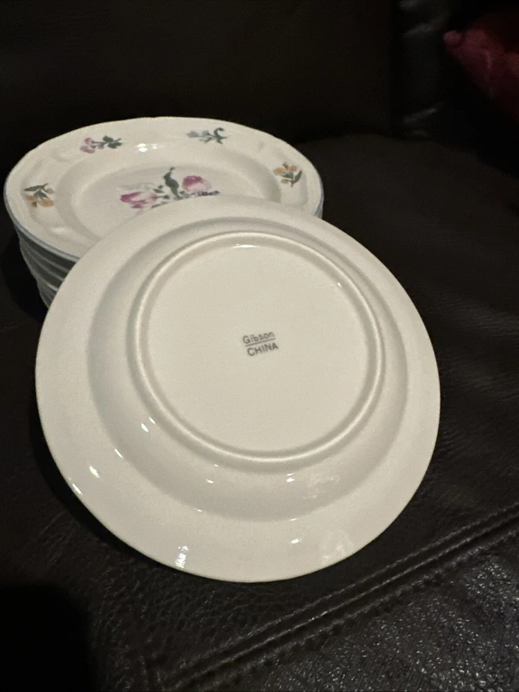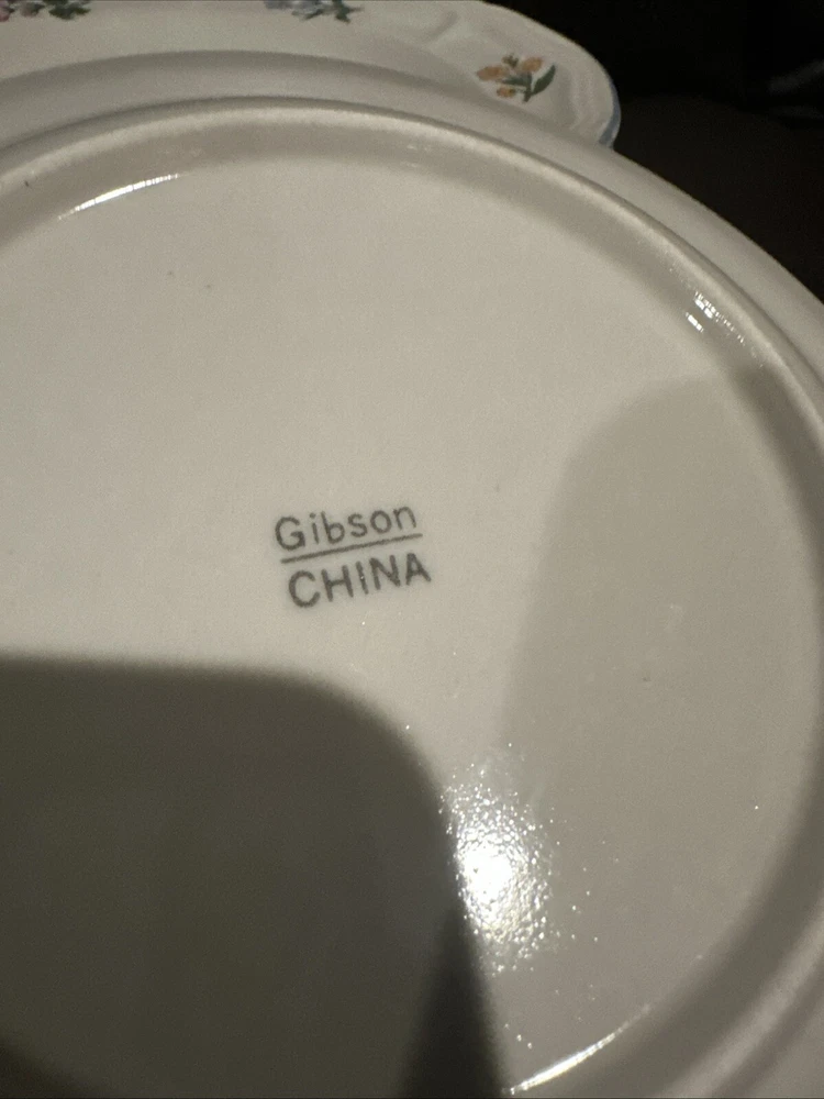 Theme: Flower Finish: Glossy Occasion: All Occasions Color: White with Blue Trim Number of Items in Set: Eight-Piece Material: Ceramic Original/Licensed Reproduction: Original Backstamp: Printed Set Includes: Dinner Plate, Salad Plate Features: Dishwasher Safe, Microwave Safe, Oven-Safe Brand: Gibson Pattern: Lafayette Vintage: Yes Shape: Round Type: Luncheon Plate Country/Region of Manufacture: China