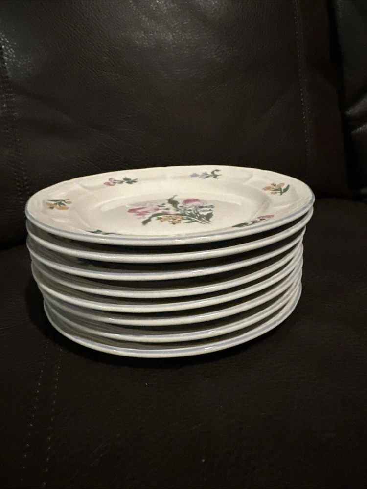 Add a touch of elegance to your table setting with these Lafayette by Gibson Tulip Floral Salad Lunch Plates. The eight-piece set includes round plates with a white ceramic material and blue trim, perfect for all occasions. These vintage plates are not only microwave, dishwasher, and oven-safe, but also feature a beautiful flower theme and a glossy finish. The set comes with both salad and dinner plates, making it ideal for any meal. The backstamp is printed and the plates are made in China. These original, licensed reproduction plates are sure to impress your guests and elevate your dining experience. Good used condition, normal wear chips or cracks!