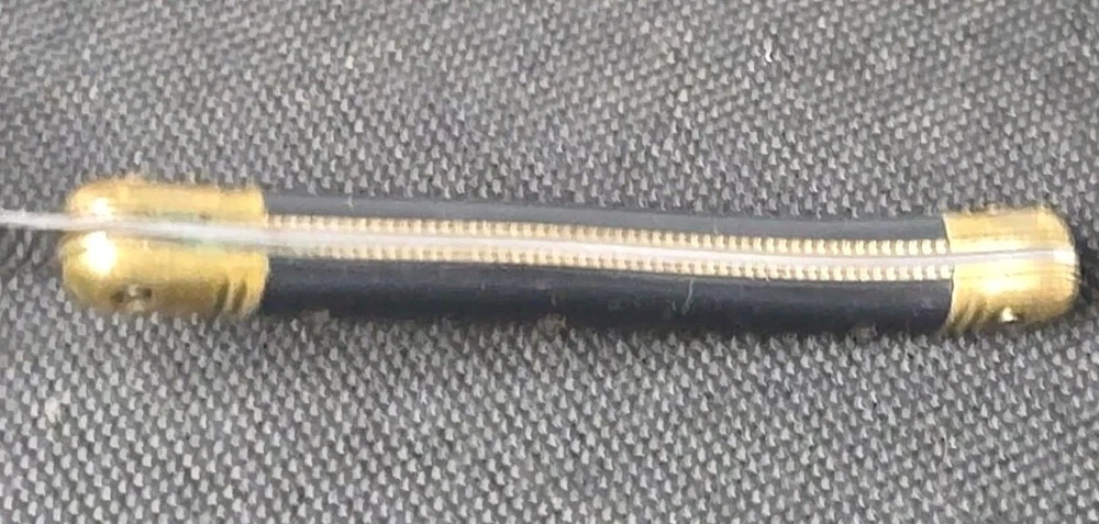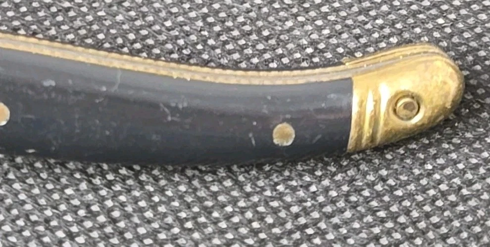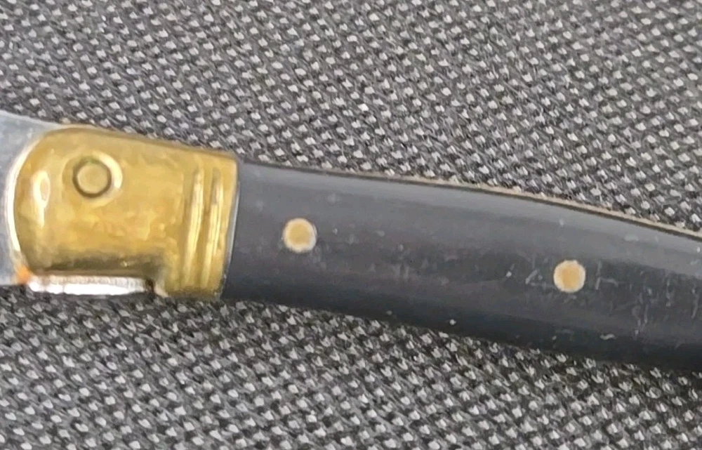 This Laguiole Cheese Knives Set of 2 features artisan craftsmanship from France, with brass blades and resin handles in cream and black colors. The knives have a 4-1/3" blade with a straight and curled tip, making them versatile for cutting and serving cheese and meats. The set includes two multi-functional knives that are easy to clean, reusable, and rust-resistant, making them a practical and stylish addition to any kitchen or dining table. Made by the renowned brand Laguiole, these cheese knives are sure to elevate your dining experience. Artisian signed J. Veronica Maitre. Hand Made stainless set. Excellent quality.