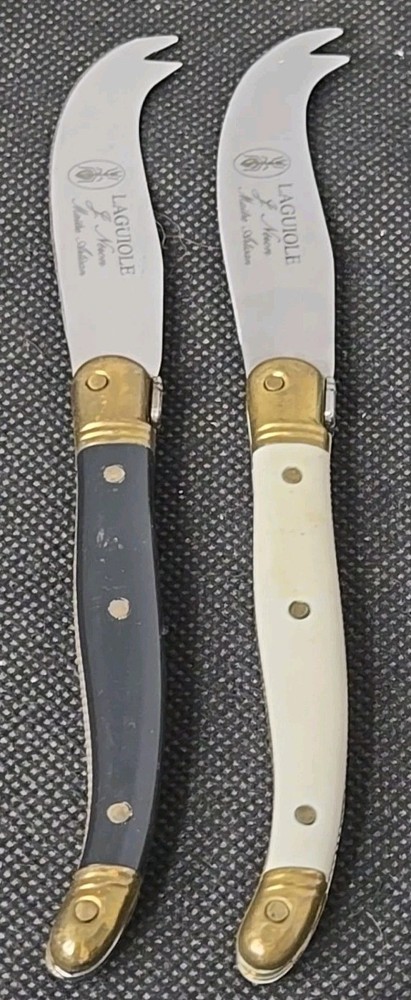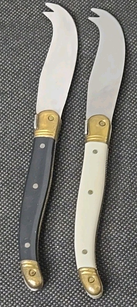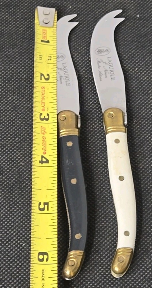Country/Region of Manufacture: France Features: Easy Clean, With Handles, Multi Functional, Reusable, Rust Resistant Material: Brass Type: Cheese Knife Set Set Includes: 2 Cheese Knives Handle Material: Resin Brand: Laguiole Food Compatibility: Cheese, Meat Number of Items in Set: 2 Blade Edge: Straight and curled at tip Color: Cream and Black Blade Length: 4-1/3"