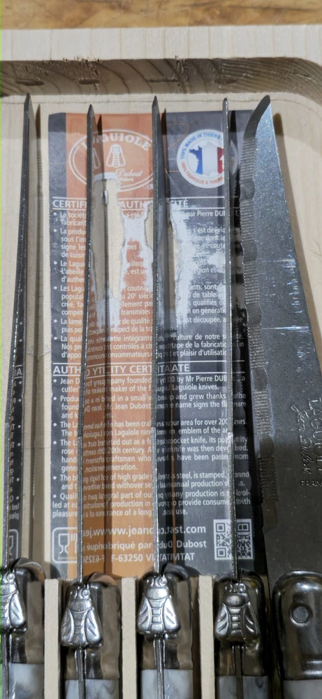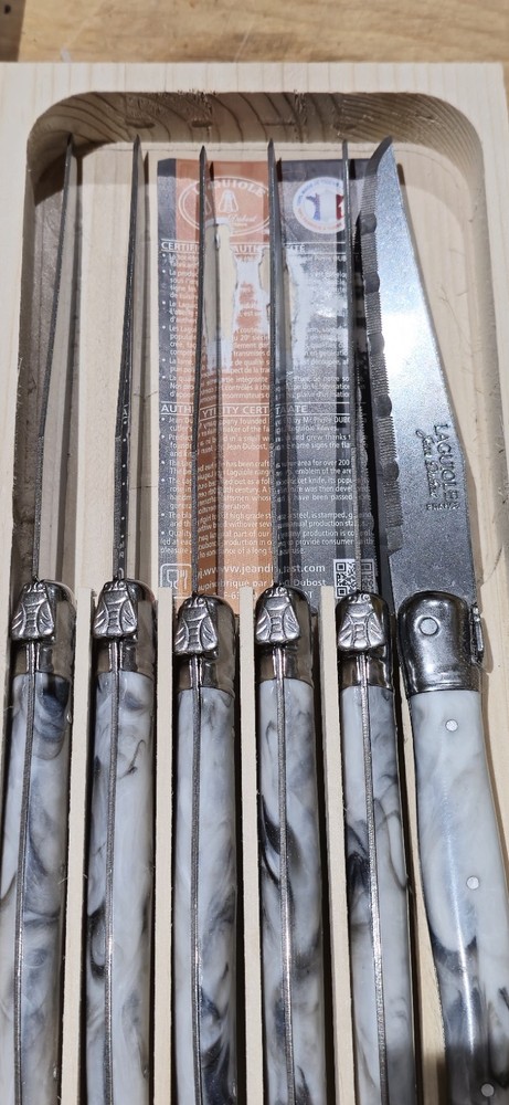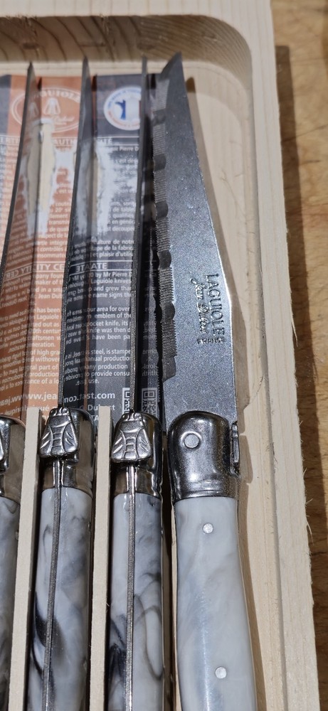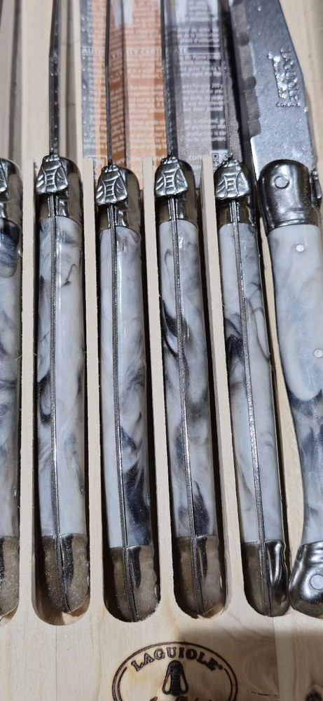 Retail $80 + tax Brand: Laguiole Type: Steak Knife Material: Stainless Steel Colour: Beige Handle Material: Composite Set Includes: Steak Knife Custom Bundle: No Features: Dishwasher SafeItem Height: 5 cm Item Width: 15 cm Item Length: 20 cm