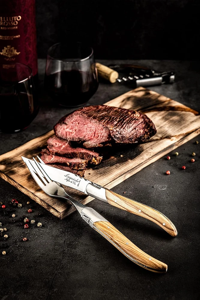 Laguiole Style de Vie Forks, Luxury Line, 6 pieces, Olive Wood, in Wood Product Details Material: Stainless Steel Color: Olive Wood Brand: Laguiole Style de Vie Handle Material: Wood Finish Type: Stainless Steel Is Dishwasher Safe: No Manufacturer: Style de Vie Authentique Package Dimensions: 10.08 x 5.79 x 2.72 inches Item Weight: 2.2 pounds Is Discontinued By Manufacturer: No This set contains 6 forks made of stainless steel. The handle is made of beautiful olive wood. These forks are the perfect addition to the Steak Knives of Laguiole Style de Vie Luxury Line. Each knife is decorated on the spine. The well-known Laguiole honey bee is present on the bolster of each knife Total length: 8.66inch. Metal thickness: approx 0.1 inches. The forks are not dishwasher safe. Laguiole is not a registered brand or trademark. The word "Laguiole" is a general term, not legally restricted to a single company or place of manufacture. Laguiole Style de Vie products are made in China with very high quality standards. This set of 6 forks from the Laguiole Style de Vie Luxury Line is the perfect addition to the Luxury Line steak knives. These beautiful forks are just as high-quality as the steak knives and of course equipped with the famous honey bee on the top of the fork. The forks come in a luxury wooden box. This is an original Laguiole Style de Vie product and comes with a certificate of authenticity.