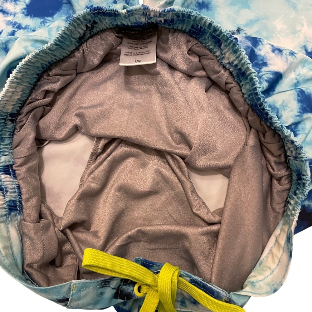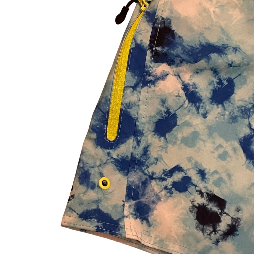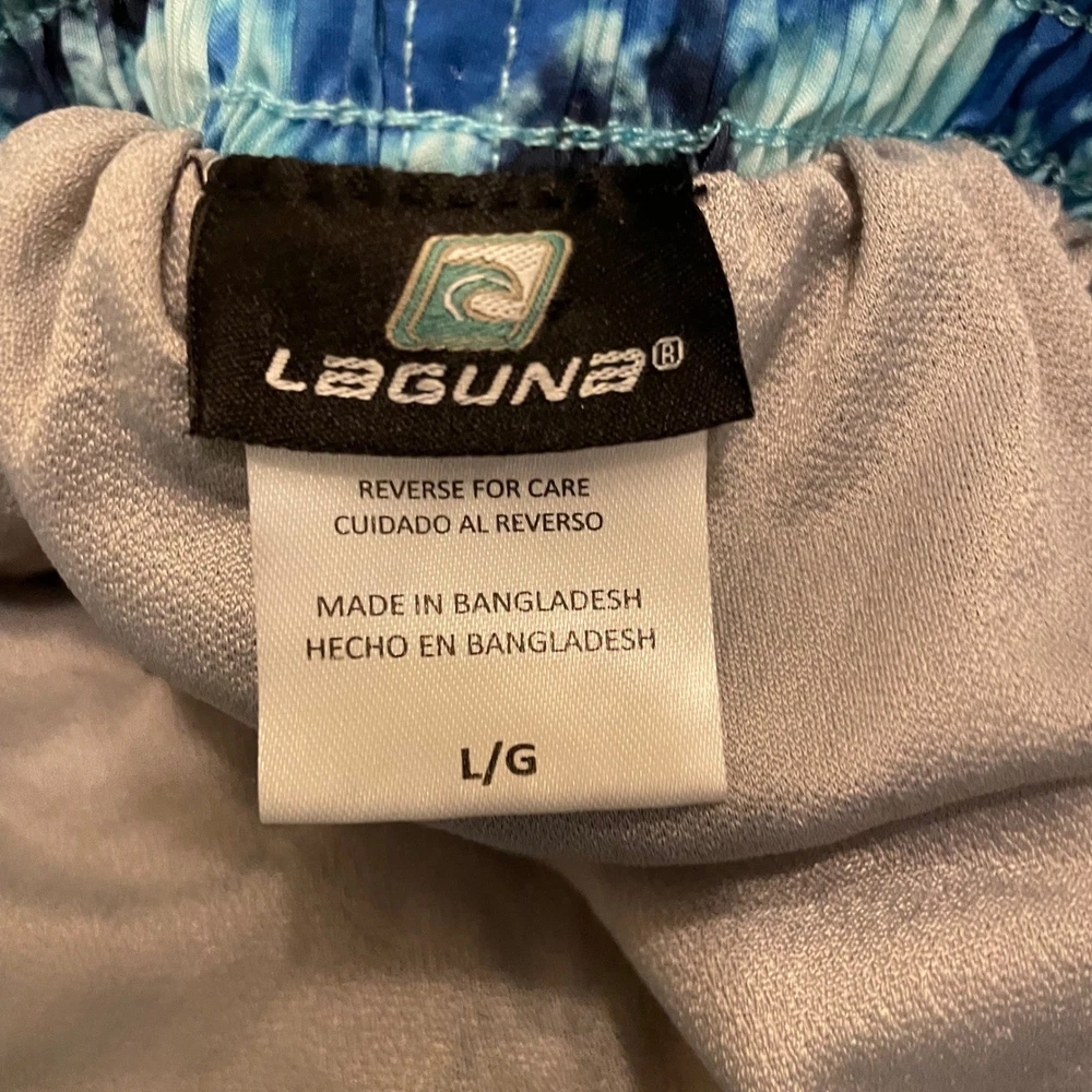Dive into summer fun with these eye-catching Laguna swim trunks. A vibrant blue tie-dye pattern creates a splashy, modern look, perfect for making a statement at the beach or pool. The comfortable elastic waistband with a neon yellow drawstring ensures a secure and adjustable fit, while the convenient zipper pocket keeps your essentials safe and sound. These swim trunks are designed for both style and practicality, allowing you to move freely and confidently. Picture yourself lounging by the pool, playing beach volleyball, or enjoying a casual day at a water park in these stylish and functional swim trunks. Measurements: • Waist: 15.5 in • Inseam: 7.5 in Color: Blue Type: Bottom Swim Bottom Style: Swim Shorts Department: Men Pattern: Tie Dye Features: Elastic Waist, Drawstring, Pockets, Quick Dry Material: Polyester, Spandex Performance/Activity: Surfing, Recreational Keywords: mens swim trunks, swim shorts, blue tie dye, drawstring, zipper pocket, beachwear, pool attire, summer fashion, Laguna, large, swimwear, mens clothing, vacation, resort wear The Designer Clothing Exchange "Great Brands, Great Prices" - NEW ITEMS DAILY 5 STAR SELLER - FAST SHIPPING DAILY - AMBASSADOR II
