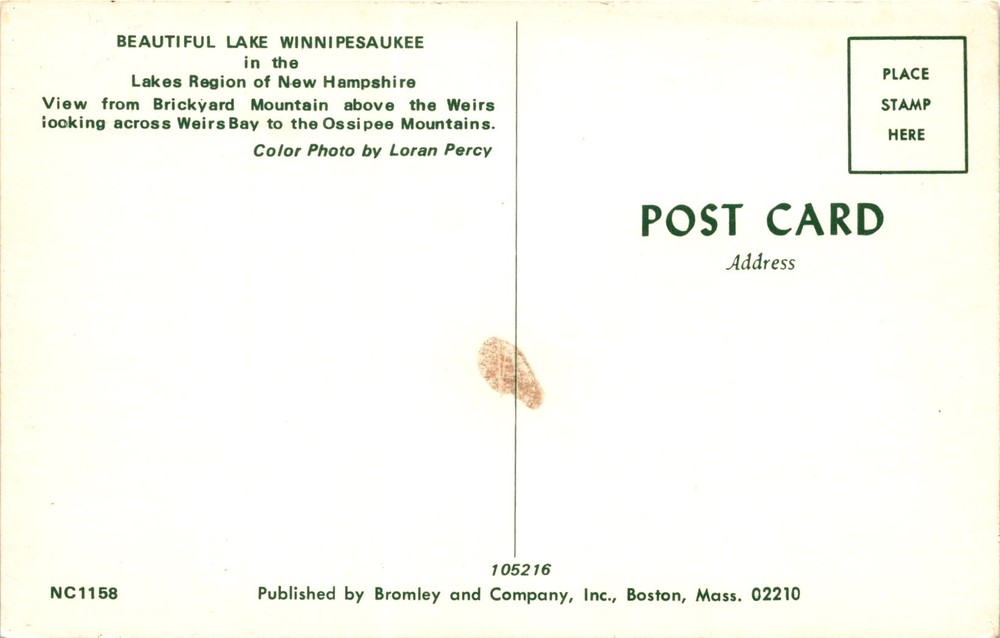 MAKE AN OFFER. THE MORE YOU BUY THE BETTER DEAL I WILL ACCEPT The postcard features a beautiful view of Lake Winnipesaukee in the Lakes Region of New Hampshire, taken from Brickyard Mountain above the Weirs. The image captures a scenic view looking across Weirs Bay to the Ossipee Mountains. The photo was taken by Loran Percy and published by Bromley and Company, Inc. in Boston, Massachusetts.