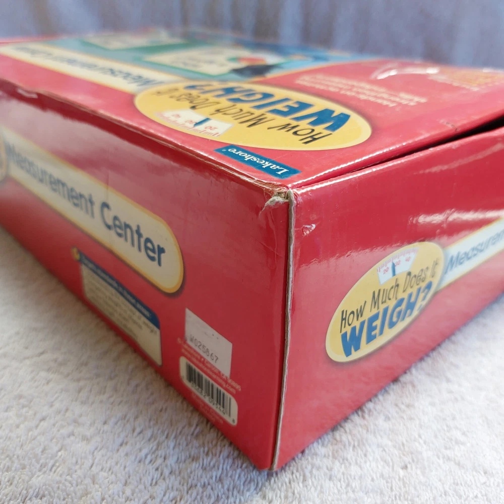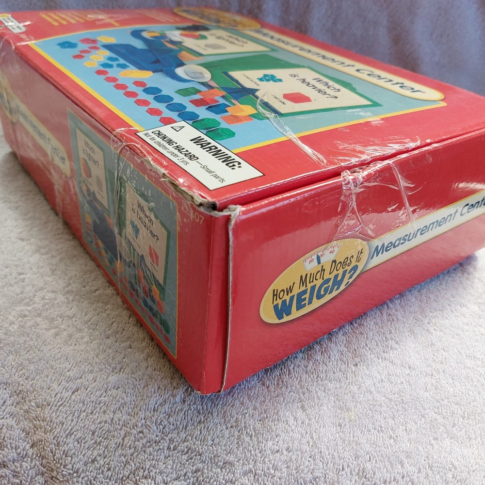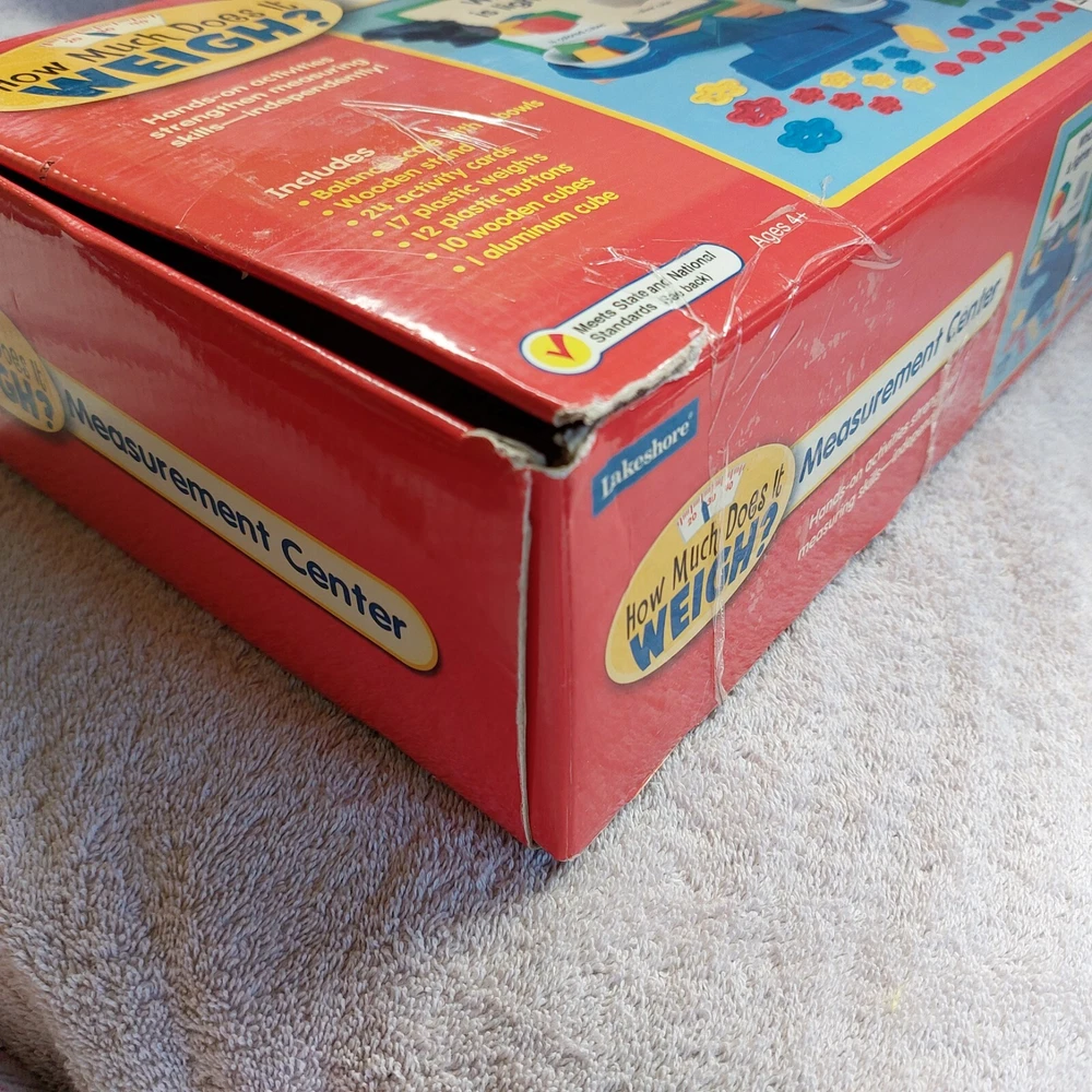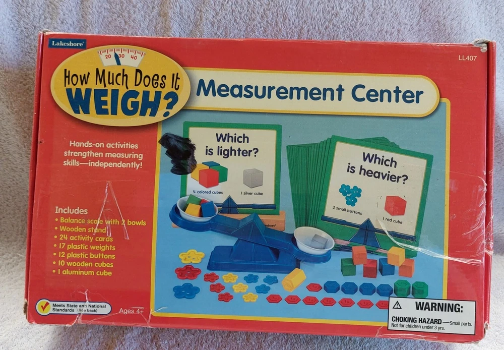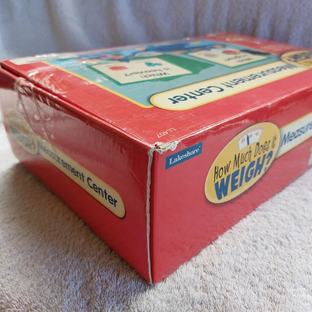 2008 Lakeshore How Much Does It Weigh? Measurement Center #LL407 Ages 4+ Pre-owned. Pieces are in great shape but the box has lots of shelfwear and tape. There is also black marker on the box lid. 24 large laminated color cards and instructions included. Only 2 plastic weights are missing. Currently retails for $59.99 on the Lakeshore website! Please ask questions in advance. Shipping via Priority Mail.
