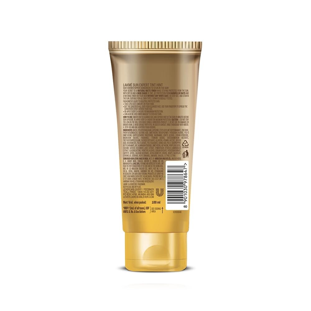 About this item Blends into your skin for an invisible|| natural finish SPF 50 shields up to 97% of UVB rays causing sunburn and PA+++ shields from UVA rays that cause dark spots|| premature aging and skin darkening. Feels light and non-sticky on skin and gives an even toned look this is perfect for everyday. Infused with cucumber and lemongrass extracts Helps fight dark spots|| premature aging and skin darkening that happen due to sun damage Gives a natural finish so that your skin does not look patchy Product description Sunscreens making your face look white and patchy? Lakmé Sun Expert brings to you a tinted sunscreen|| our revolutionary sun protection formula that blends into your skin for an invisible|| natural finish. SPF 50 shields up to 97% of UVB rays causing sunburn and PA+++ shields from UVA rays that cause dark spots|| premature aging and skin darkening. Infused with cucumber and lemongrass extracts this ultra matte|| tinted sun screen feels light and non-sticky on skin and gives an even toned look this is perfect for everyday. How to use: 1) Smooth on to cleansed face and exposed part of the skin 20 minutes before sun exposure. Re-apply every 3-4 hours for maximum protection. Avoid contact with eyes. In case of eye contact rinse thoroughly with clear water. Consult a doctor if irritation persists. For complete sun care|| try our full regime with Lakmé Sun Expert De tan Scrub to reduce tan and dark spots & Lakmé Sun Expert After Sun Gel to soothe your sun exposed get a refreshed and glowing look. Lakmé Sun Expert SPF 50 PA +++ Tinted Sunscreen has natural finish|| is suitable for all skin types. It is safe to use and is dermatologically tested.*OLD From the manufacturer