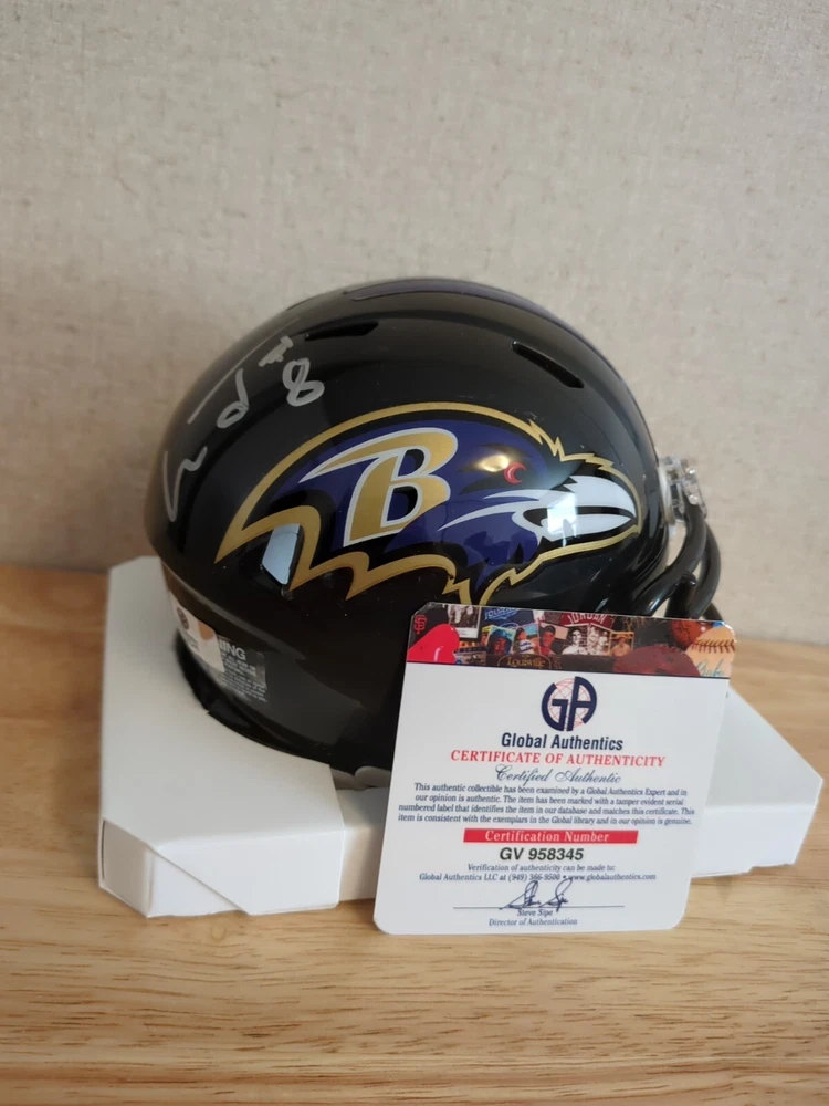 This is a Baltimore Ravens mini helmet signed by Lamar Jackson. It comes with a Certificate of Authenticity from Global Authentics.