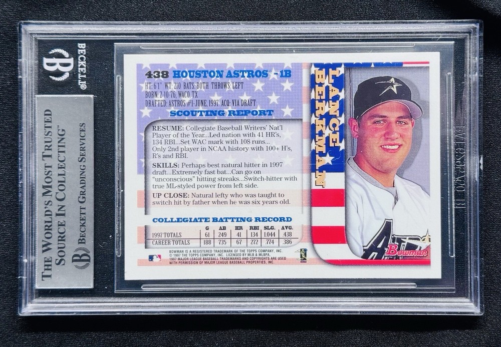 Secured packaging, bubble mailer USPS First Class Tracking This authentic 1997 Bowman baseball trading card features Lance Berkman, a Major League Baseball player for the Houston Astros. The card is a first-year international rookie card made of standard card stock and is an original, licensed reprint. It has been hard signed by Berkman and authenticated by Beckett Authentication Services (BAS) with a certification number of 00016355729. The card is a valuable addition to any collection and perfect for fans of the Astros or Berkman. It is in excellent condition and has been well-preserved. Don't miss your chance to own this rare and unique collectible.