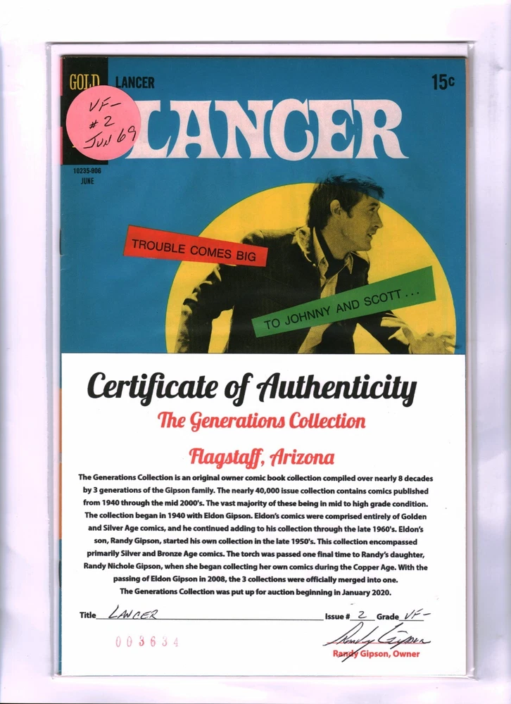 Grade: 7.5 Very Fine- Publication Year: 1969 Publisher: Gold Key Comics Genre: Western Features: 1st Edition, Certificates of Authenticity (COA) Included Inscribed: No Intended Audience: General Audience Personalized: No Cover Artist: Photo Cover Signed: No Era: Silver Age (1956-69) Style: Color Tradition: US Comics Country/Region of Manufacture: United States Language: English Type: Comic Book Vintage: Yes Series Title: Lancer