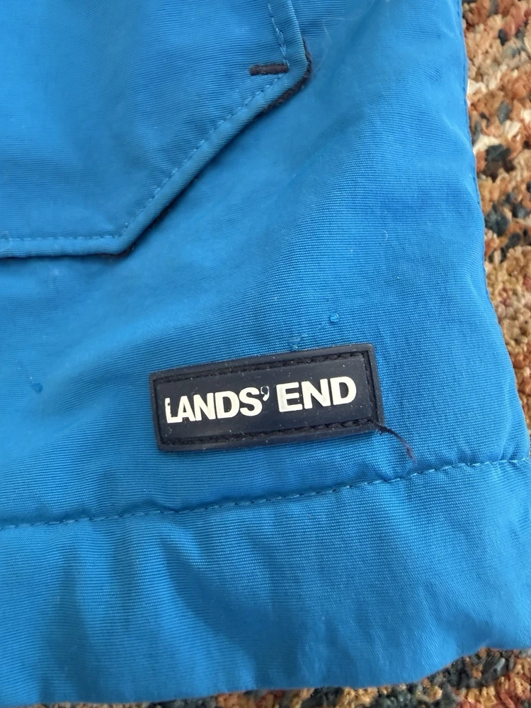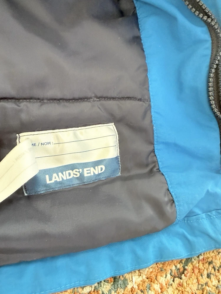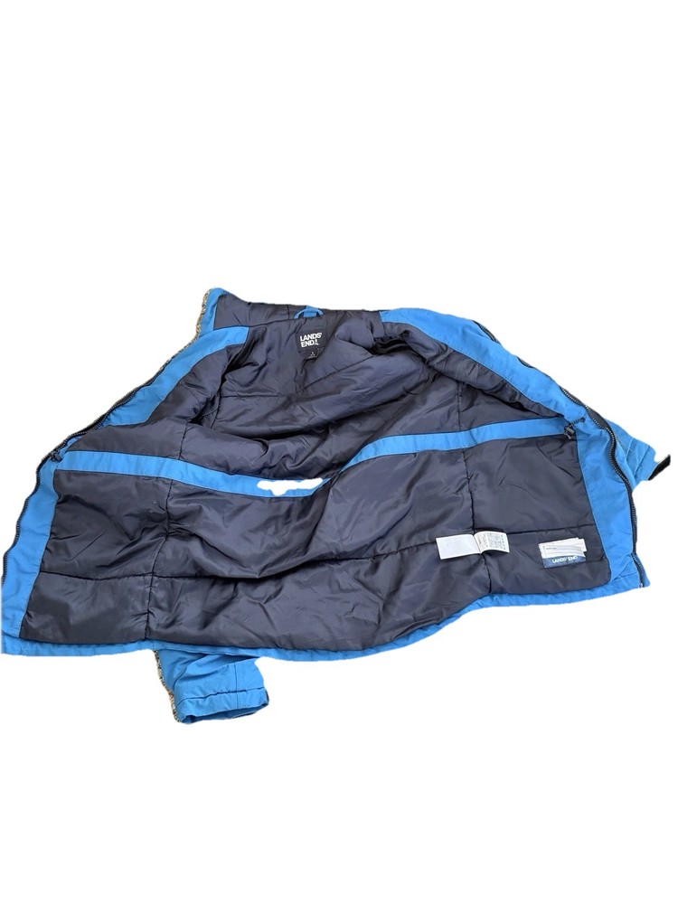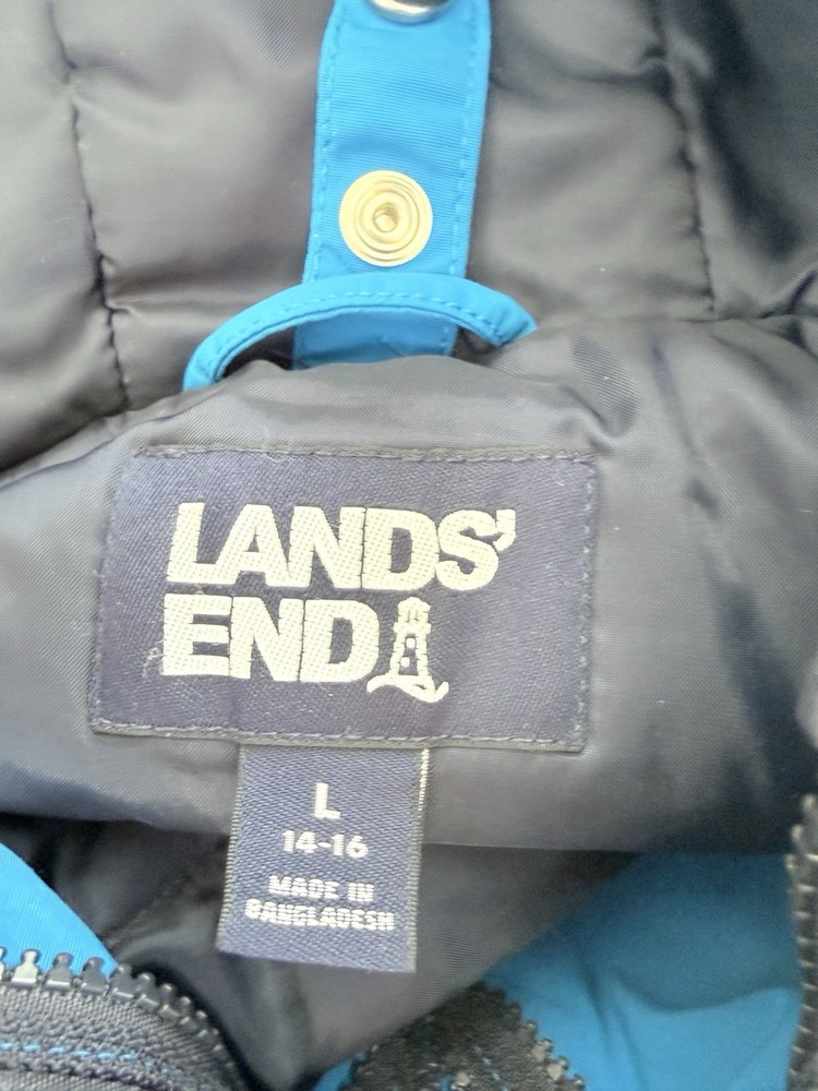 The Land Ends Blue Boys Winter Jacket in size 14-16 is a stylish and functional outerwear piece for boys. Made with 100% nylon outer shell and 100% polyester lining, this mid-length jacket features long sleeves, zip closure, and accents like zipper and logo detailing. With a solid blue color and a theme of ski, outdoor, and classic, this waterproof jacket is perfect for winter activities like walking, school, and skiing. The regular fit and blended fabric make it comfortable for everyday wear, while the Lands' End brand ensures quality and durability. #049