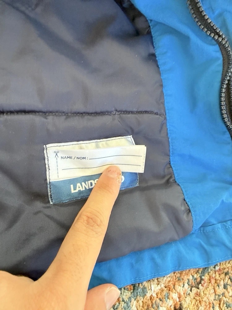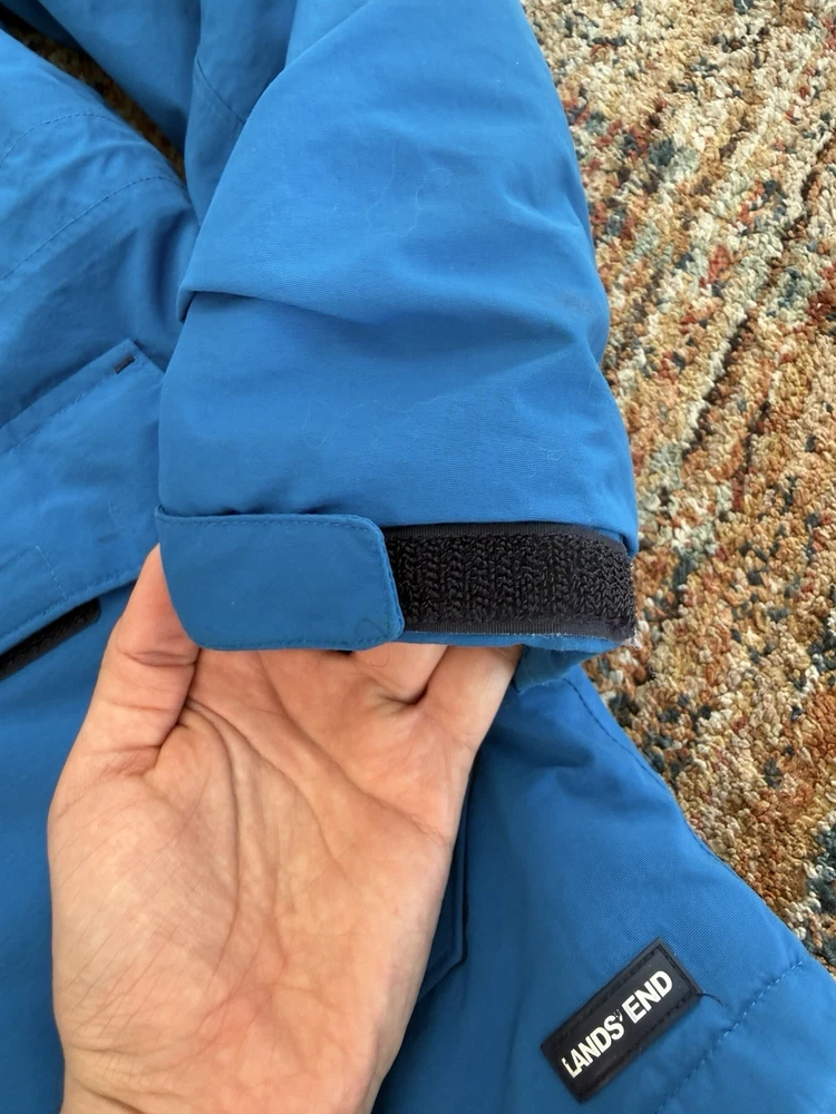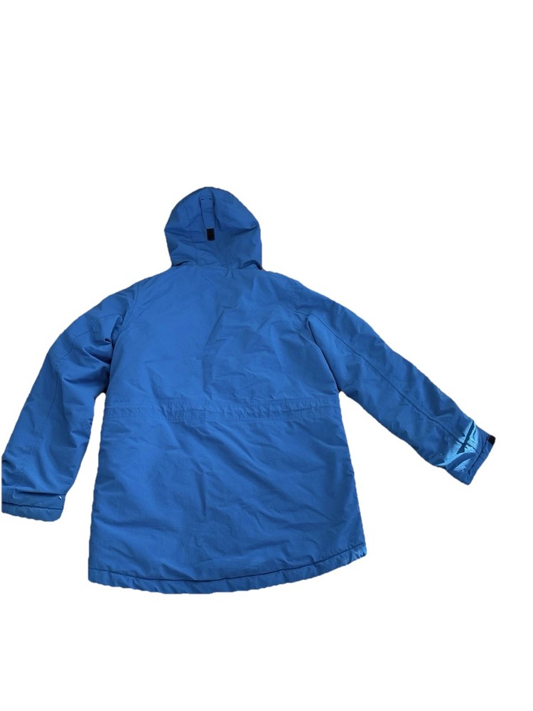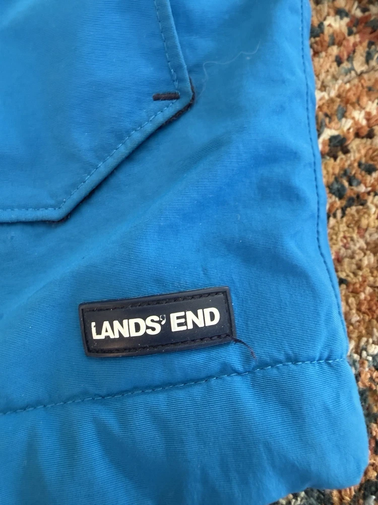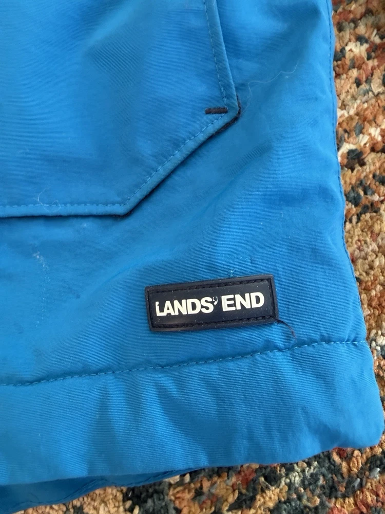 The Land Ends Blue Boys Winter Jacket in size 14-16 is a stylish and functional outerwear piece for boys. Made with 100% nylon outer shell and 100% polyester lining, this mid-length jacket features long sleeves, zip closure, and accents like zipper and logo detailing. With a solid blue color and a theme of ski, outdoor, and classic, this waterproof jacket is perfect for winter activities like walking, school, and skiing. The regular fit and blended fabric make it comfortable for everyday wear, while the Lands' End brand ensures quality and durability. #049