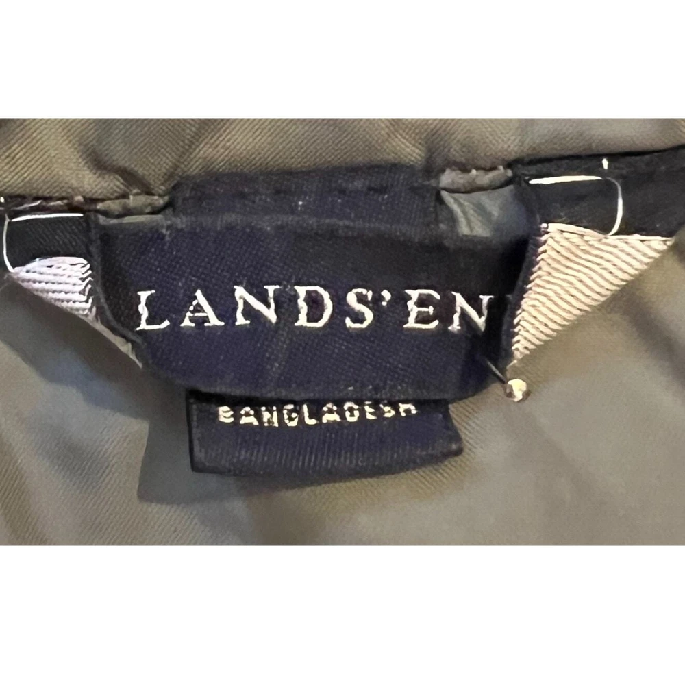 17" armpit to armpit 16" armpit to cuff 14" armpit to hem 23" shoulder to hem Lands' End softshell fabric type and quilted accents, short-length jacket zip front closure and long sleeves pockets made of nylon & polyester with a solid pattern color is a beautiful olive green ** all items stored in a smoke-free & pet free home