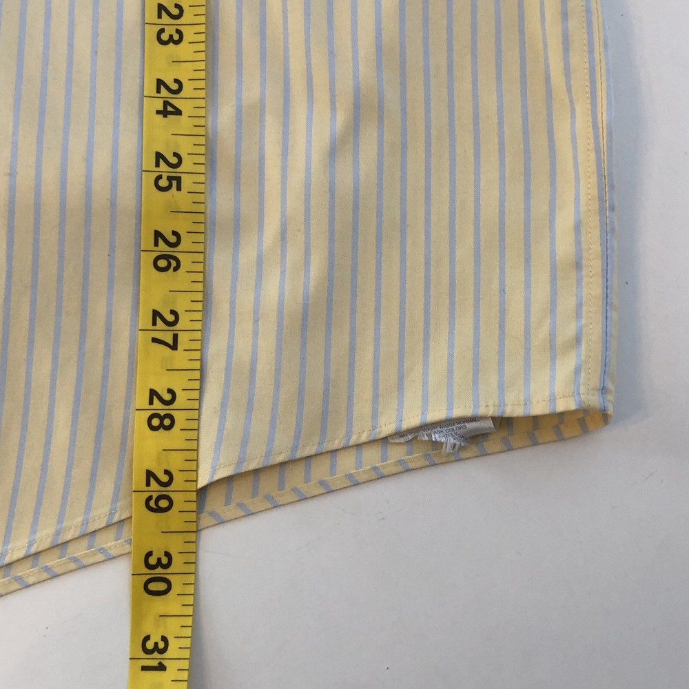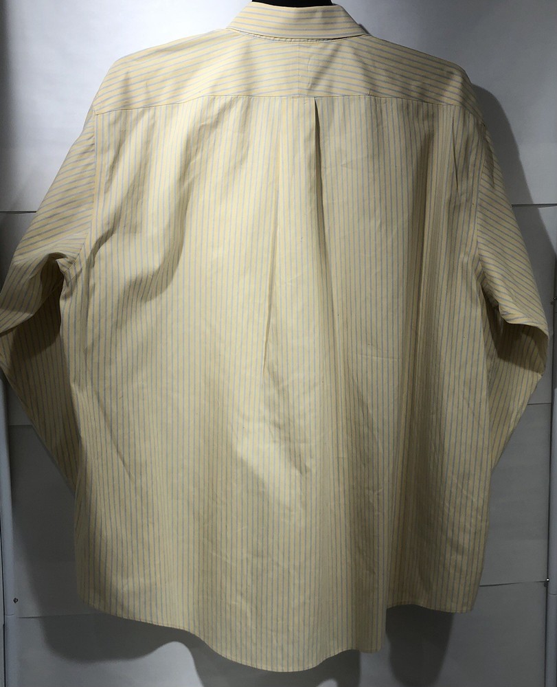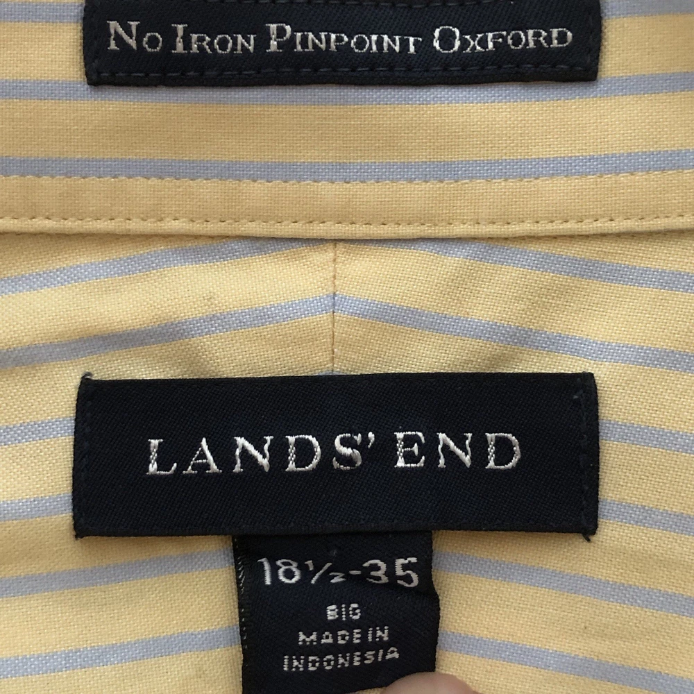 The Lands’ End Shirt No Iron Pinpoint Oxford is a classic and preppy men's dress shirt in size 18 1/2-35 Big Yellow Stripped. Made of 100% cotton with a woven fabric type, this shirt features a collared neckline, button closure, and long sleeves with a barrel cuff style. Perfect for travel, casual, or business occasions, this shirt is non-iron and has a chest pocket for added convenience. With its timeless design and quality construction, this Lands’ End shirt is a stylish and versatile addition to any man's wardrobe.