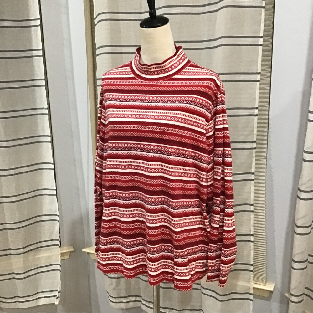 Lands End Women Size 3X Relax Fit Fair Isle Holiday Red Mock Neck Top Stripes