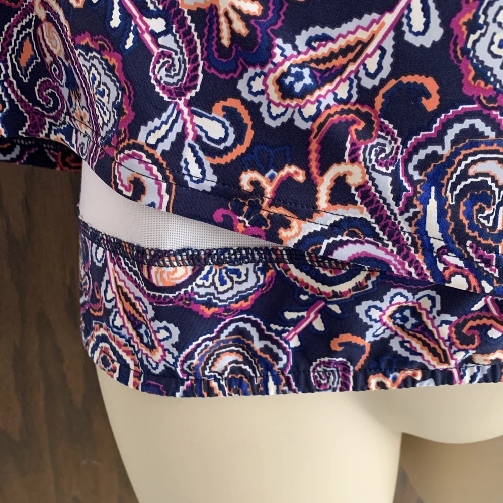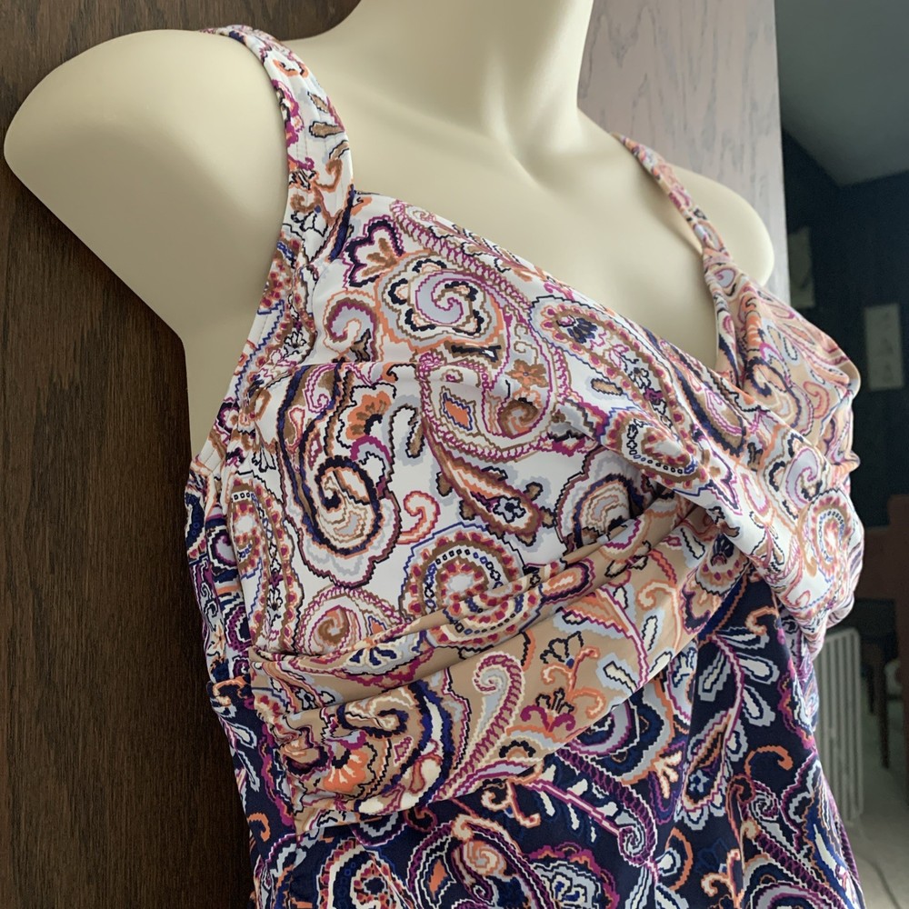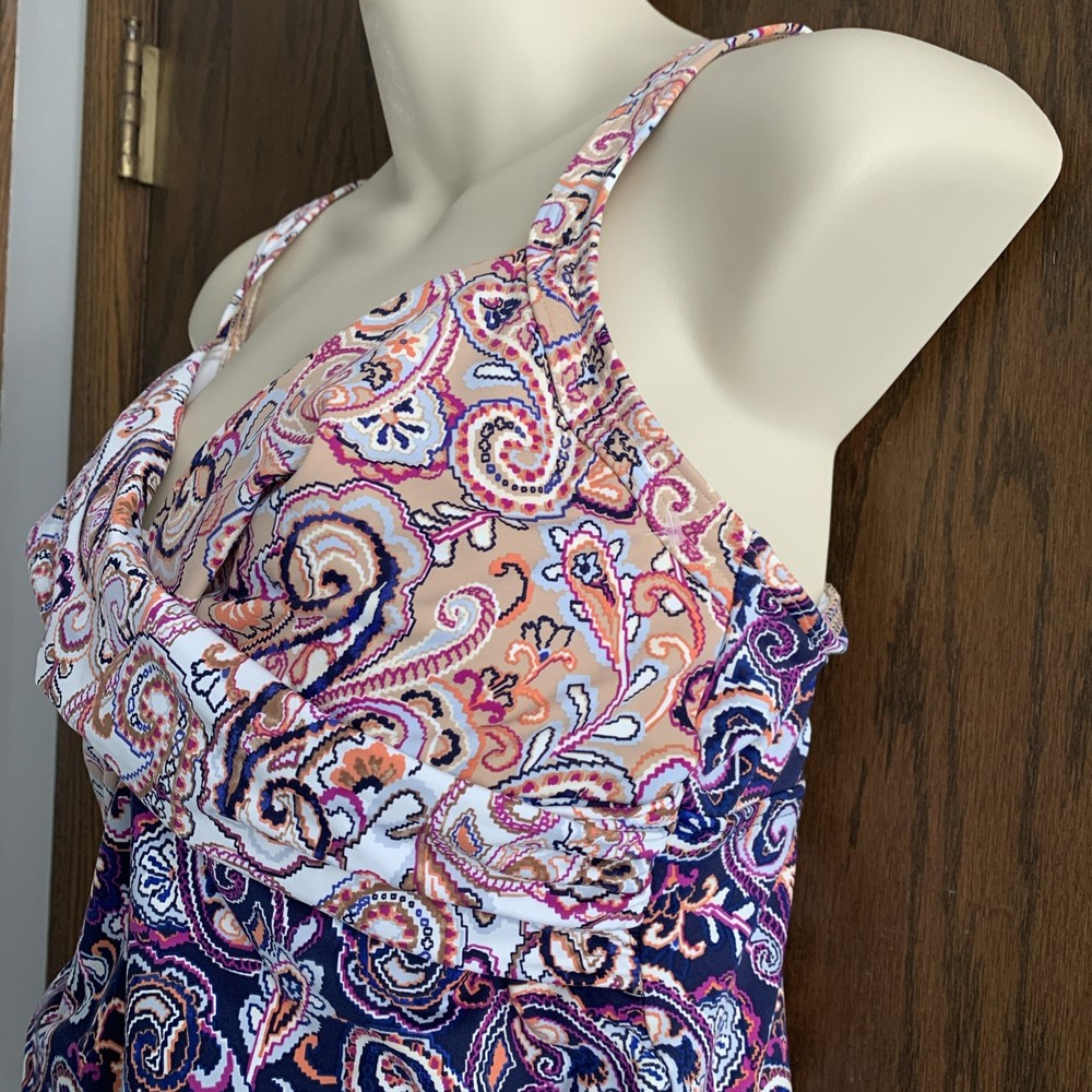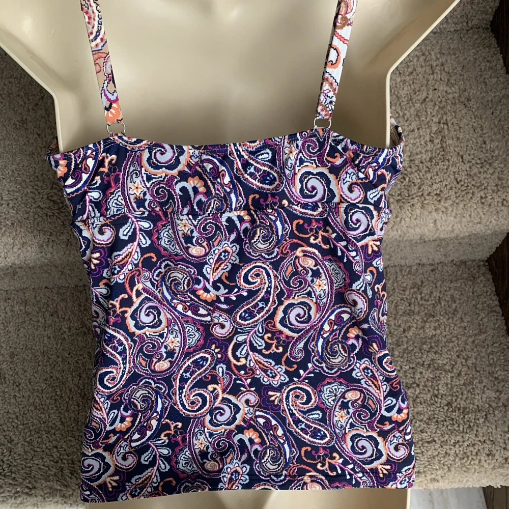 The Lands’ End paisley tankini swim top in size 8 features underwired support and a built-in bra, providing a comfortable and flattering fit. Made from a blend of polyester, nylon, and spandex, this top offers stretch and compression for a smooth silhouette. The paisley pattern in blue and beige adds a classic touch to your beach look, while the adjustable straps and padded cups ensure a perfect fit. Hand wash only to maintain the quality of this stylish swim top from Lands’ End. The underlayer has a compression panel that gently firms your torso.