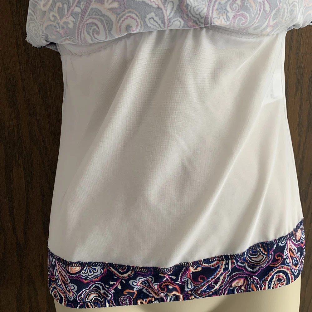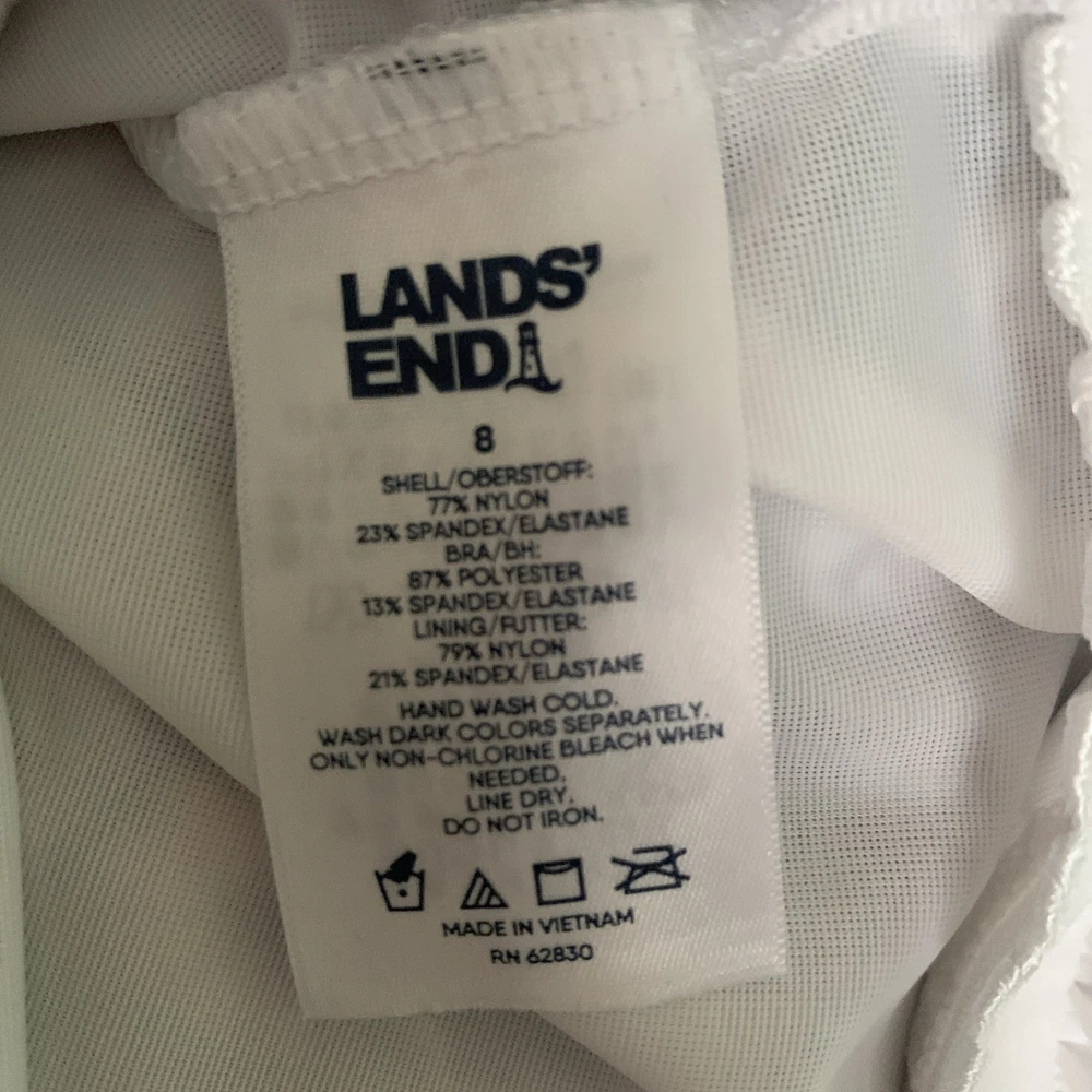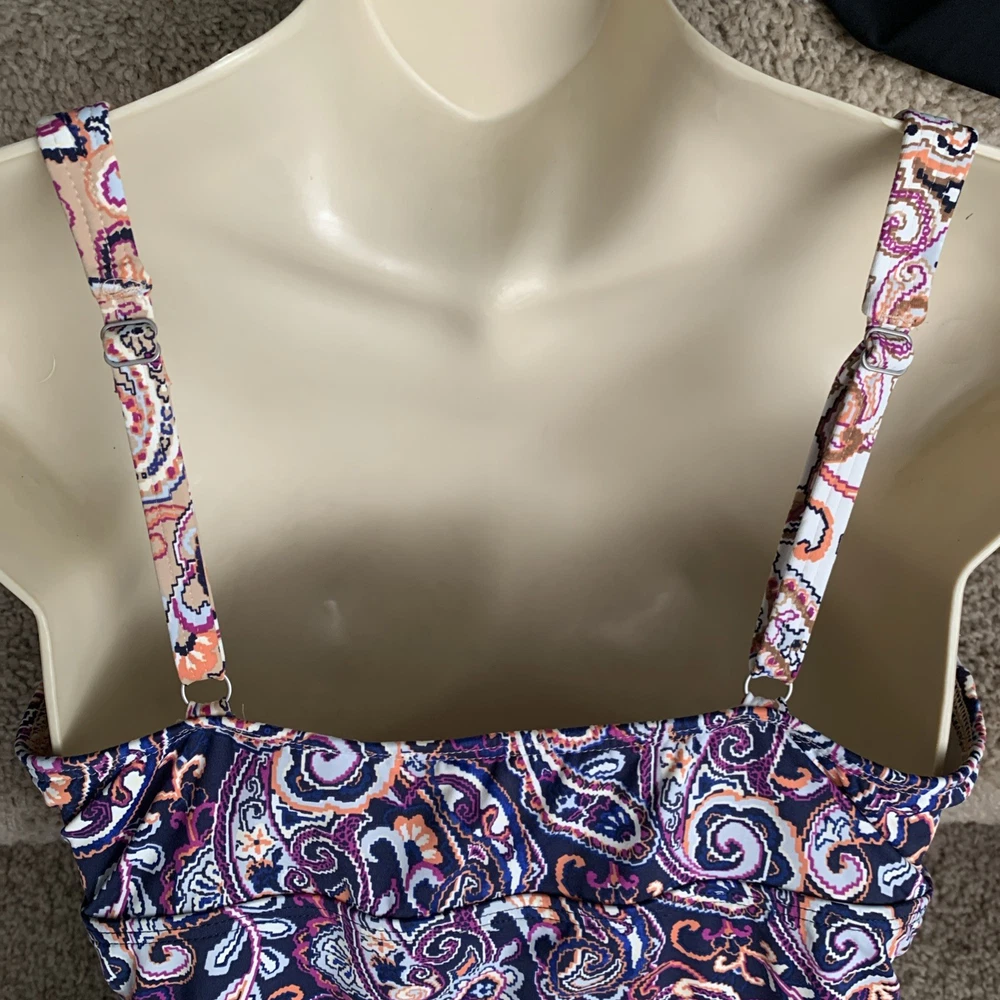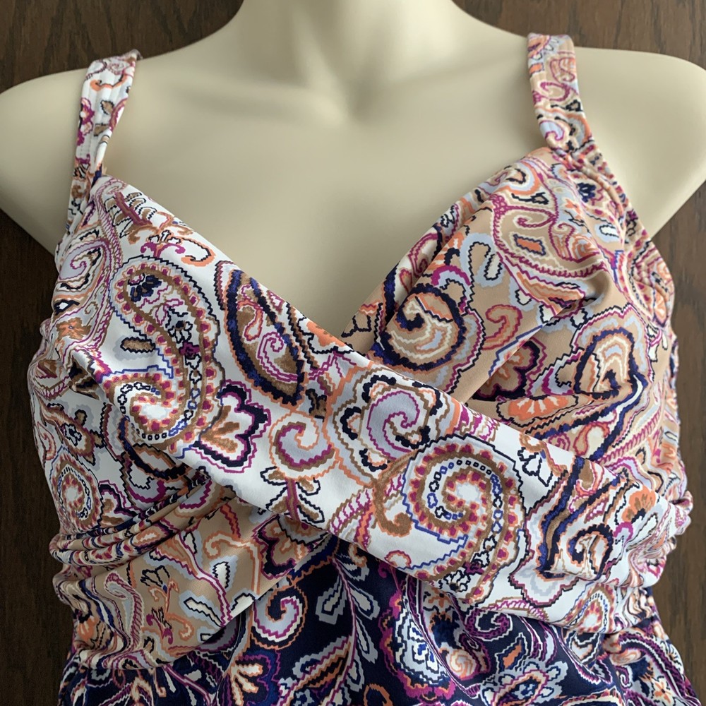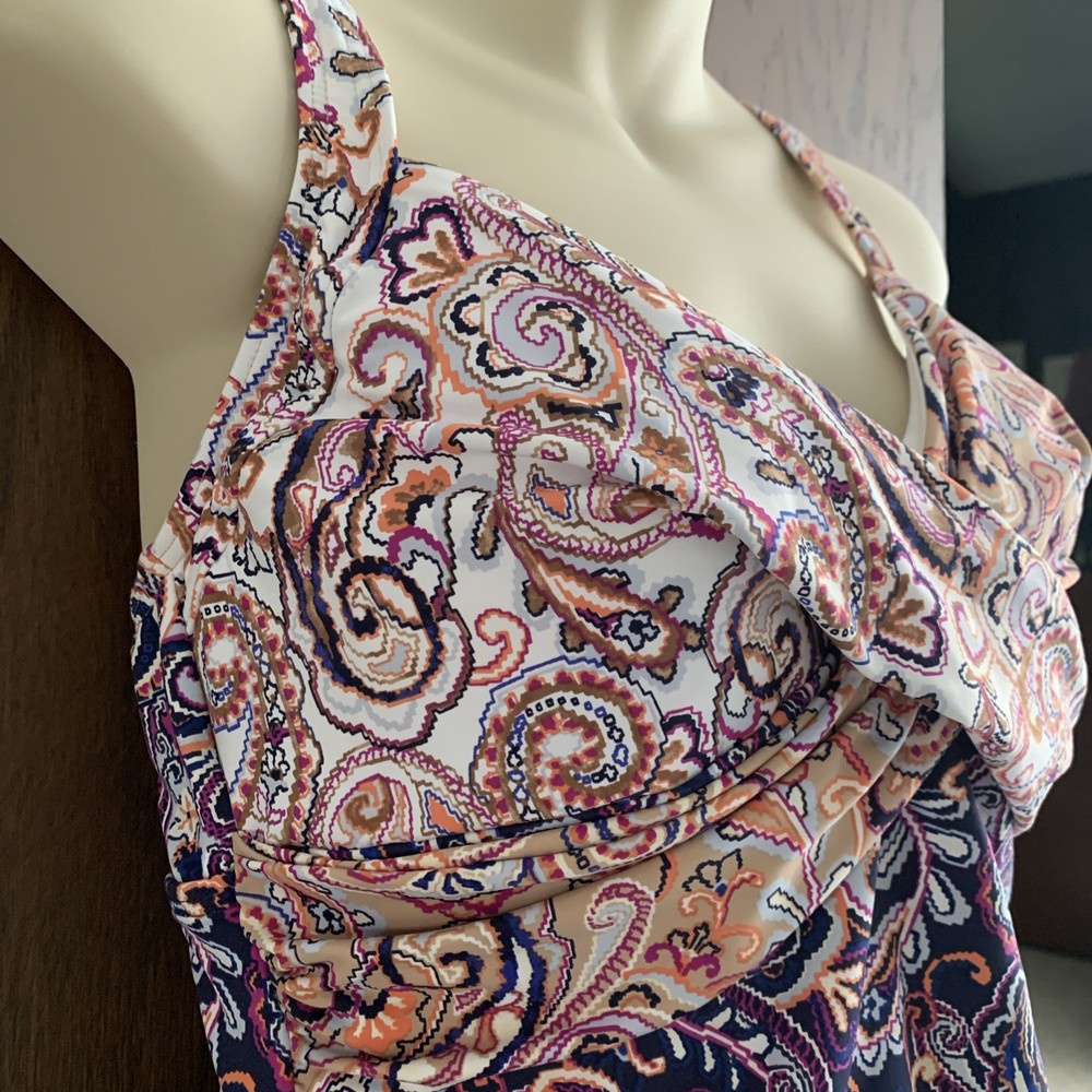 The Lands’ End paisley tankini swim top in size 8 features underwired support and a built-in bra, providing a comfortable and flattering fit. Made from a blend of polyester, nylon, and spandex, this top offers stretch and compression for a smooth silhouette. The paisley pattern in blue and beige adds a classic touch to your beach look, while the adjustable straps and padded cups ensure a perfect fit. Hand wash only to maintain the quality of this stylish swim top from Lands’ End. The underlayer has a compression panel that gently firms your torso.