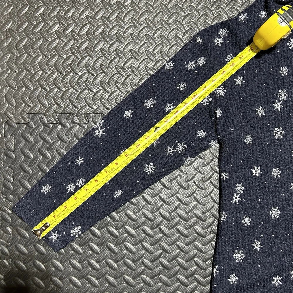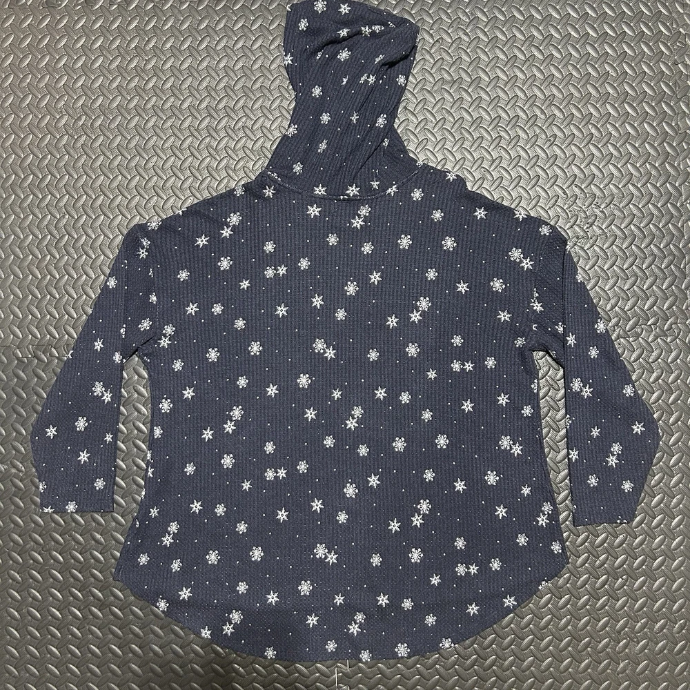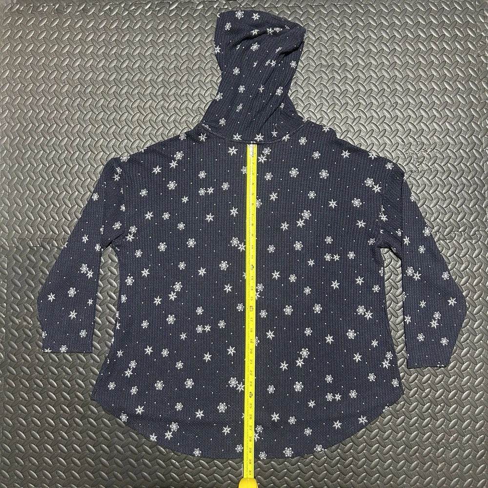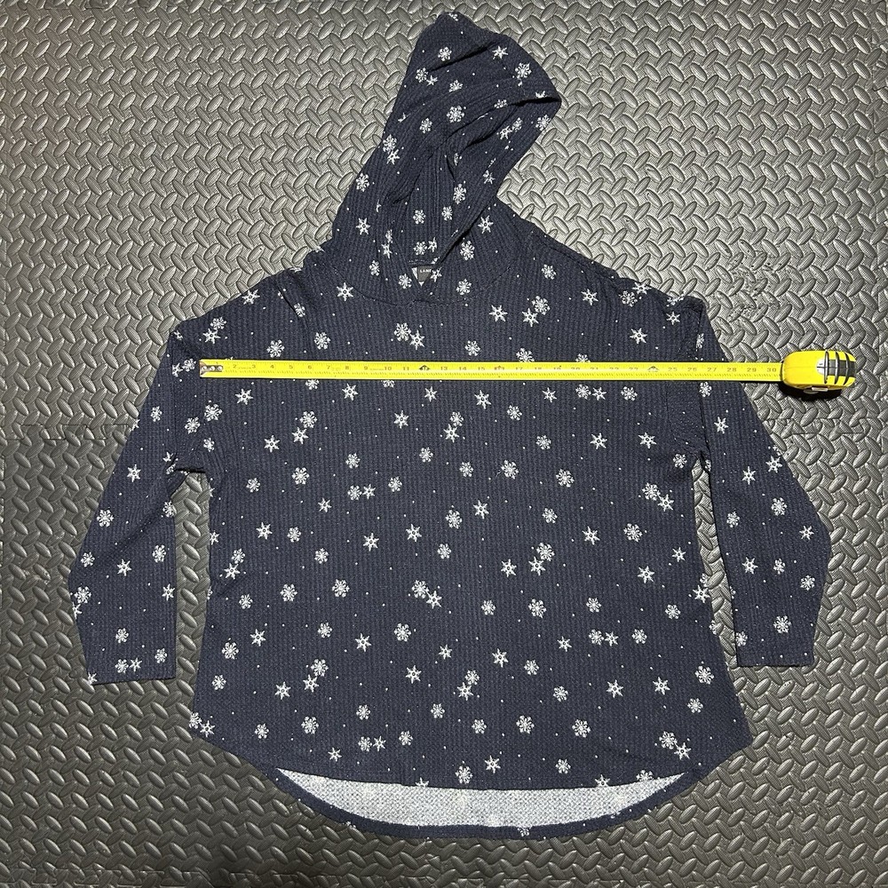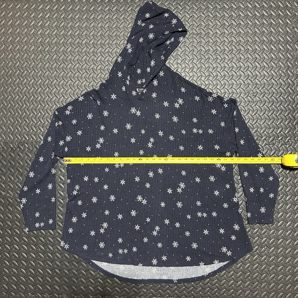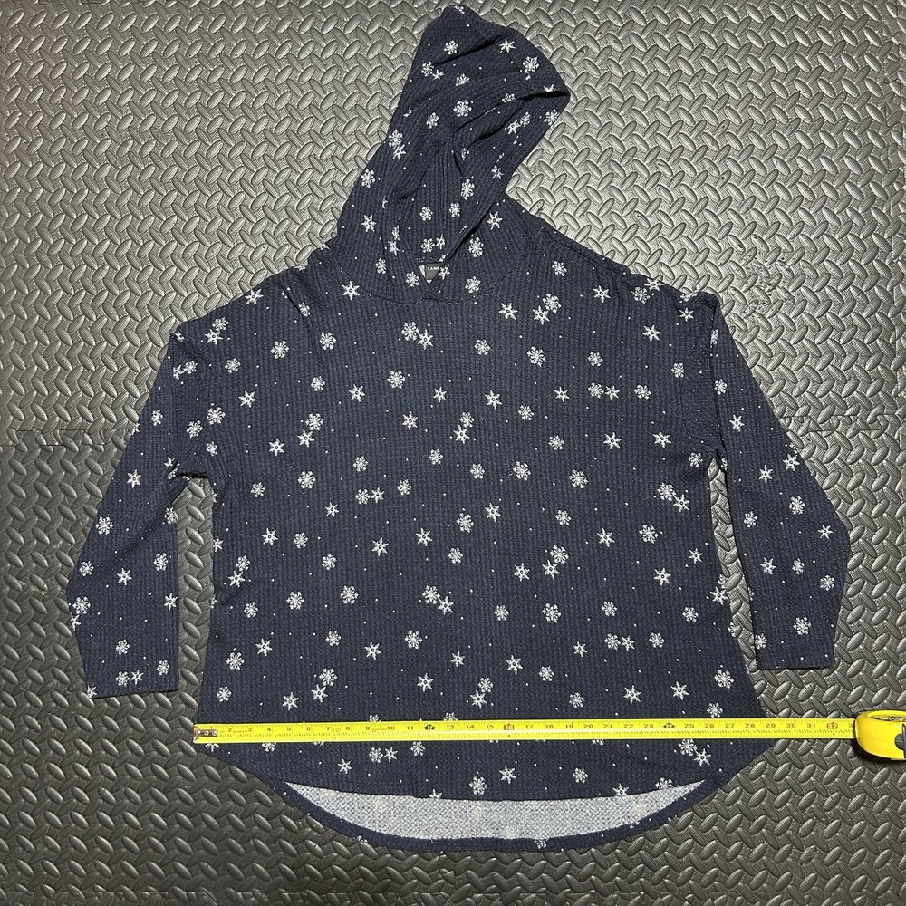 This long sleeve top features a V-neckline and a pullover closure for easy wear. Made from a comfortable knit fabric blend of polyester, spandex, and rayon. The curved hem adds a touch of flair, while the hooded design and stretch material ensure a comfortable and flattering fit. The double-sided print of snowflakes gives it a festive touch, making it ideal for holiday gatherings or casual outings. 100% Authentic. In-Hand Ready to Ship. No rips/holes/tears seen. No Major Flaws Seen. May see minor signs of fading/previous use. Please see pics above for a closer look at product & measurements. All measurements are a close approximate. Legit Seller. Measurements: (Each is a real close approximate) Pit to Pit: 26.25” Shoulders: 25” Sleeve Length: 18.5” Hem: 29” Length: 29.75”