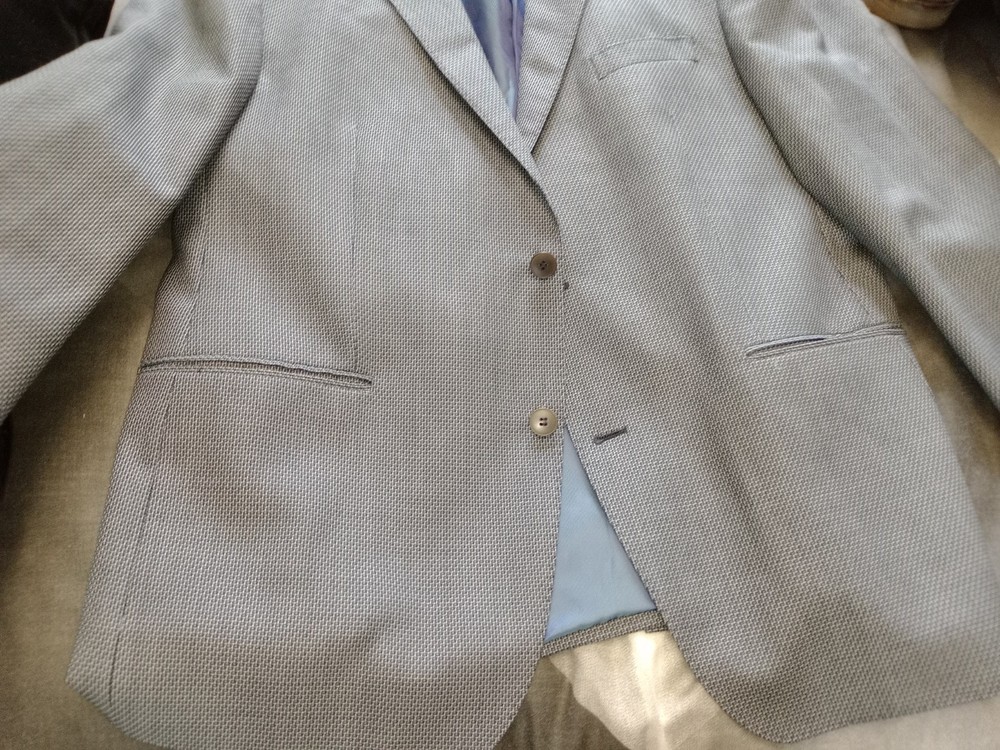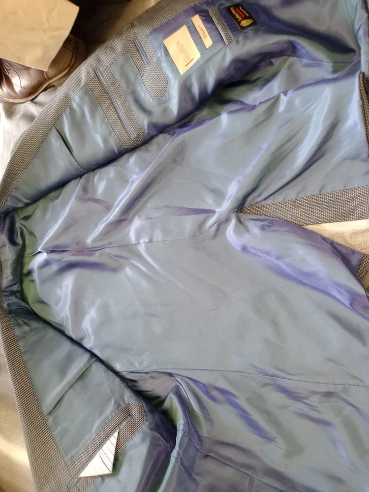 Lanificio campore collezioni mens blazer jacket 44S blue black check, two working front pockets, inner pockets, virgin wool tweed, excellent condition throughout 31 inches in length and 24 inches arm length
