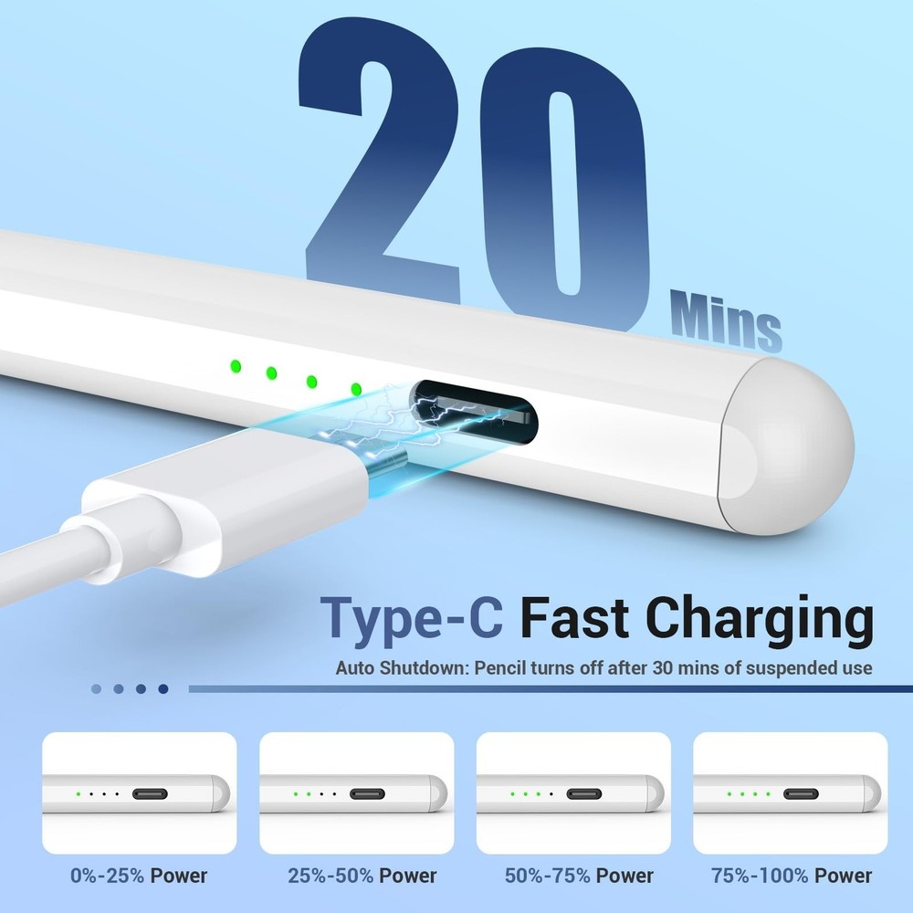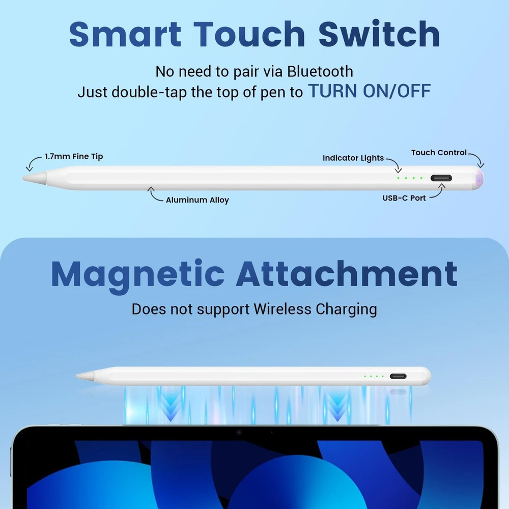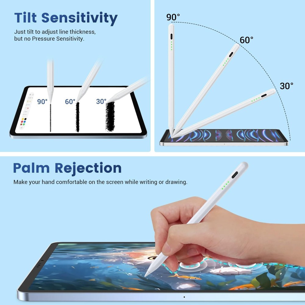 Lanteso Stylus Pencil for iPad 2018-2024, Tilt Sensitivity, Palm Rejection, Compatible with iPad 6/7/8/9/10th, Mini 5/6th, Pro 11/12.9", Air 3/4/5th/M2, White Product Details Color: white Brand: Lanteso MPN: Does not apply UPC: Does not apply EAN: Does not apply Color: white Brand: Lanteso Material: Aluminum Number of Batteries: 1 Lithium Polymer batteries required. (included) Compatible Devices: ipad Are Batteries Included: Yes Batteries Required?: No Manufacturer: Lanteso Compatible Tablet Computer Models: Apple iPad (6th generation), Apple iPad mini 5, Apple iPad Air (3rd generation) Package Dimensions: 7.24 x 2.28 x 0.63 inches Item Weight: 1.13 ounces Batteries: 1 Lithium Polymer batteries required. (included) Date First Available: September 5, 2024 Manufacturer: Lanteso Compatibility Check Needed : Supports iPad 2018 and later versions: iPad Pro 12.9"(3/4/5/6th), iPad Pro 11"(1/2/3/4th), iPad Air 3/4/5th/M2, iPad 6/7/8/9/10th, iPad Mini 5/6. Note:Not applicable to mini 7. Please confirm your devices before placing an order Tilt Sensitivity&Palm Rejection: Make your hand comfortable on iPad without leaving wrong marks, as natural as using a real pencil. Tilt the tip, you can adjust line thickness easily while drawing, sketching, or marking. Note: no pressure sensitivity Fast Charge&Auto Shutdown: Fully charged in 20 minutes and allows 4-8 hours of continuous use. It auto shuts down after 30 minutes of inactivity to save power. Four indicator lights provide battery usage, avoiding shutdown due to lack of power during use Magnetic Attachment:The upgraded built-in magnets make the pencil firmly attached to the side of your iPad, avoiding rolling and dropping, and more convenient to carry and use. (Only magnetic attachment function, not magnetic charging.) No Need Bluetooth:No Bluetooth is required, double-touching the top of the stylus pen to turn it on/off, then enjoy a smooth and accurate writing experience. If your iPad was paired with a pencil before, please unpair it before using