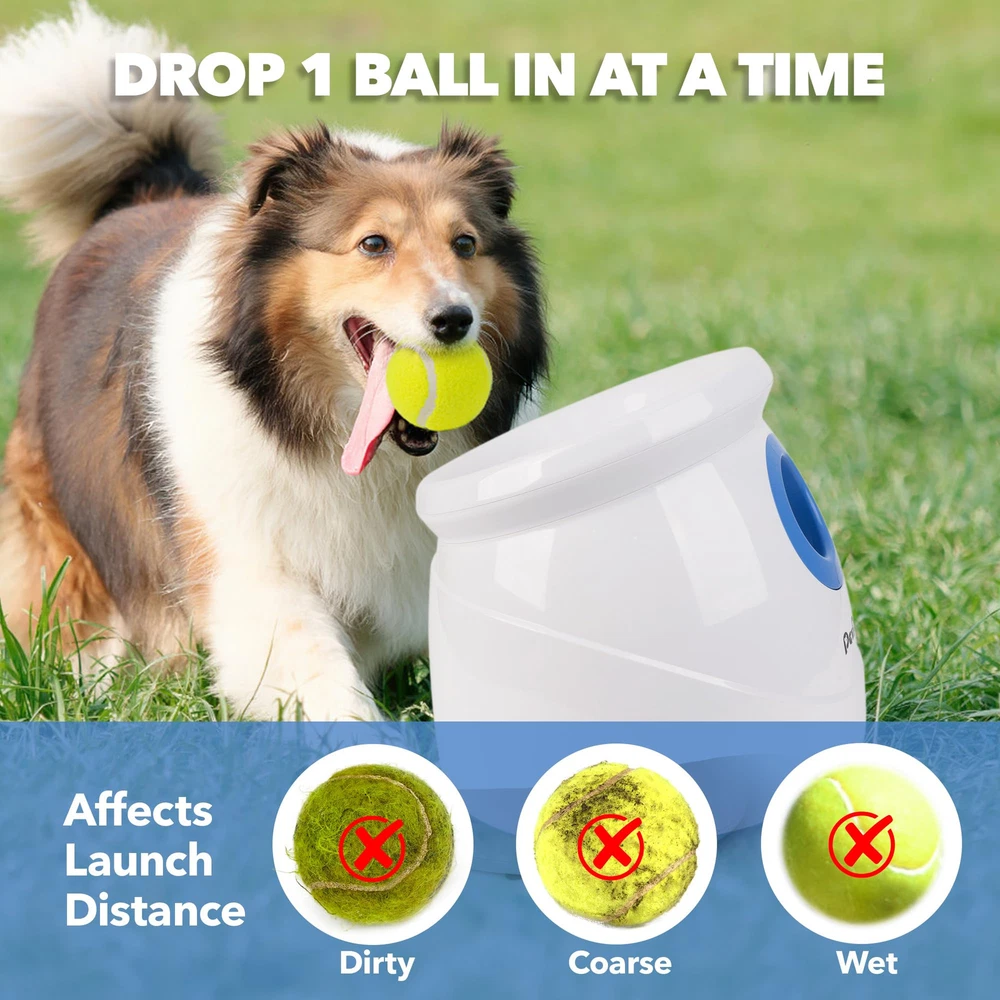 The Ultimate self throwing ball machine for dogs: Keep your furry friend entertained and active with our auto ball thrower for dogs. Perfect for indoor and outdoor play, this dog fetch ball thrower is your dog's new best friend Adjustable Launch Distance: Choose from 3 different launch distances (approximately 10ft, 25ft, or 40ft) to suit your dog's needs.Attention:Please fully recharge the battery before first use Permissible variance in launching distance: Plus or minus 10%, affected by battery power, tennis ball condition, and weather, wind speed,land,room these environmental factors Fun and Exercise: Our ball thrower for dogs is the perfect way to play and train with your dog. It's a great way to release energy, improve your dog's IQ, and reduce obesity Complete Set: Our package includes 1 dog ball launcher, 1 AC adapter, 6 tennis balls (2.5''), and 1 instruction manual. The tennis ball thrower for dogs is easy to operate and can be recharged. Product Size: 12''x11.8''x9.8'' Please always inspect the ball shooter for dogs' tube for cleanliness, clear any debris from the motor, and check for wetness or standing water on the dog fetch machine Attention: When you receive the product and find missing accessories,please let us know,we will send the accessories to you immediately; or If you have any issues with your purchase, please let us know and we'll be happy to help