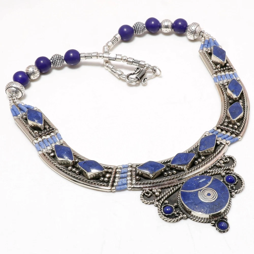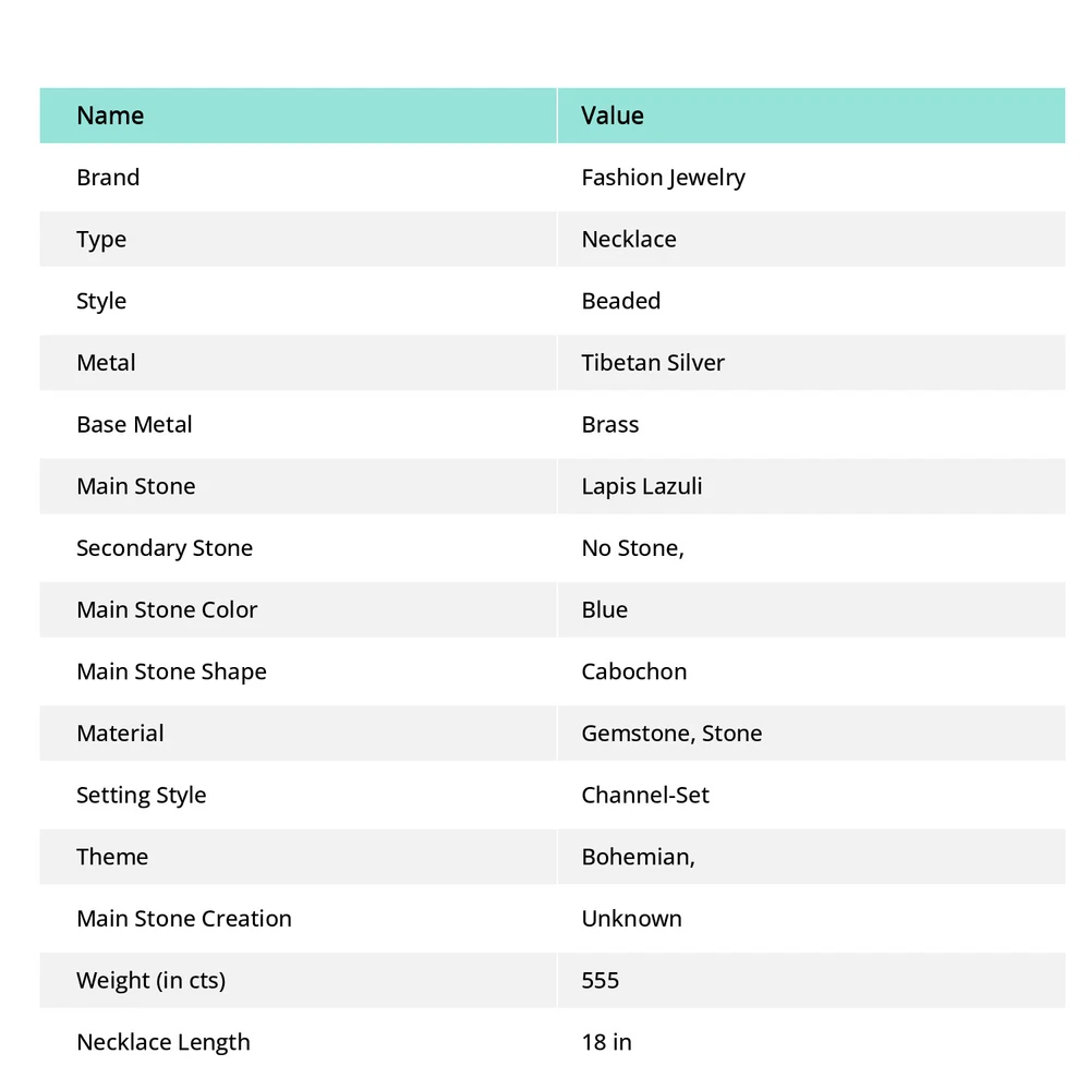 Country/Region of Manufacture: India Customized: No Signed: No Material: Gemstone, Stone Main Stone Color: Blue Handmade: Yes Theme: Bohemian gtin13: does not apply Features: Engraved Weight (in cts): 555 Cut Grade: Good Brand: Fashion Jewelry Main Stone Creation: Unknown UPC: does not apply Style: Beaded Wholesale: Yes Antique: No Gemstone Clarity Grade: Eye Clean Seller Warranty: Yes Necklace Length: 18 in Number of Gemstones: As Seen In Picture Vintage: No Country of Origin: India Setting Style: Channel-Set Personalize: No Chain Type: Ball/Bead Main Stone Treatment: Not Enhanced Era: Undated Closure: Hook Seller Notes: “"Gemstone Handmade Fashion Jewelry Products"” Pendant Shape: Cabochon Secondary Stone: No Stone Pendant/Locket Type: Charm Main Stone: Lapis Lazuli Metal Purity: Unknown Type: Necklace Color: Blue Occasion: Anniversary, Birthday, Christmas, Engagement, Wedding Main Stone Shape: Cabochon Metal: Tibetan Silver Base Metal: Brass