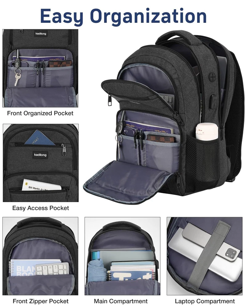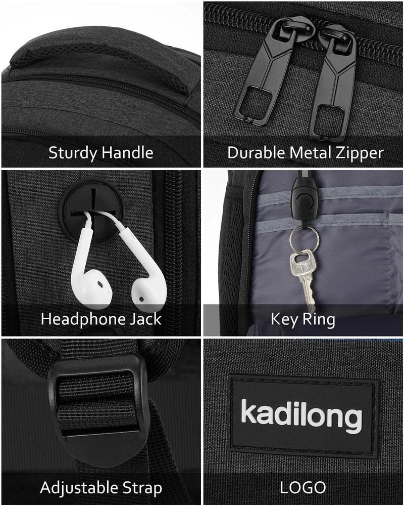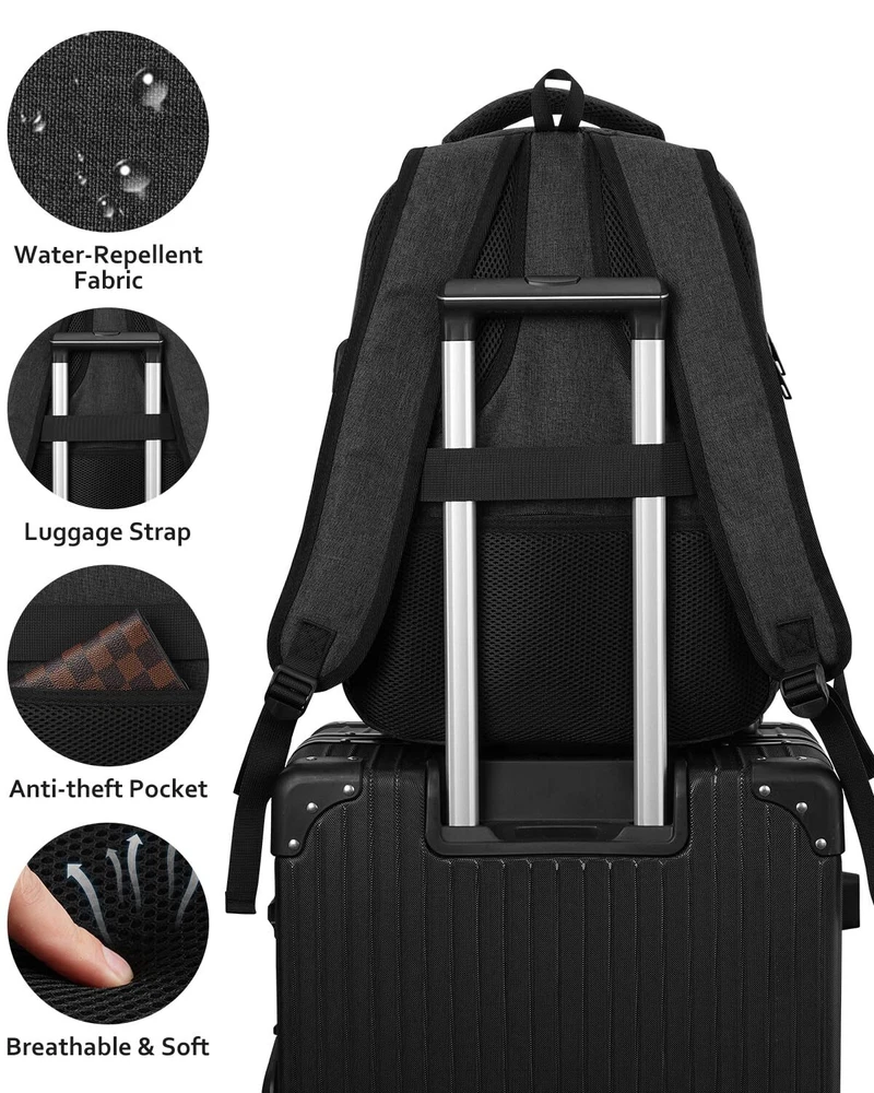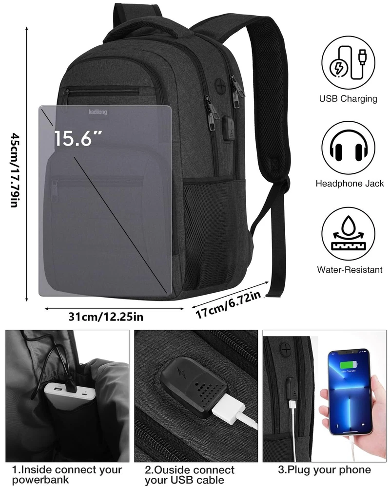 LOTS OF STORAGE SPACE&POCKETS: One separate laptop sleeve hold 15.6 Inch Laptop as well as 15 Inch,14 Inch and 13 Inch Macbooks or Notebooks. Multipurpose slots and front compartment with key fob hooks roomy for daily necessities and school stuff, makes your item organized and easier to find. USB & HEADSET PORT DESIGN: With built in USB charger outside and built in charging cable inside,this USB backpack offers you a more convenient way to charge your phone while walking. And the headphone interface frees your hands when enjoying music. STURDY & SOLID MATERIAL: Made of water resistant and sturdy Polyester fabric, this bagpack ensures a secure & long-lasting usage. Durable metal zippers keep everything neat and orderly. CONVENIENT: Luggage strap allows travel backpack slide over the suitcase upright handle tube for carrying. Anti-theft pocket on the back protect your valuables from thieves. COMFORT: the straps and the back are cushioned for comfort to wear. Serve you well as professional office workout bag, back to school backpacks, travel backpack for men and boys teens.(Age: above 3 years old)