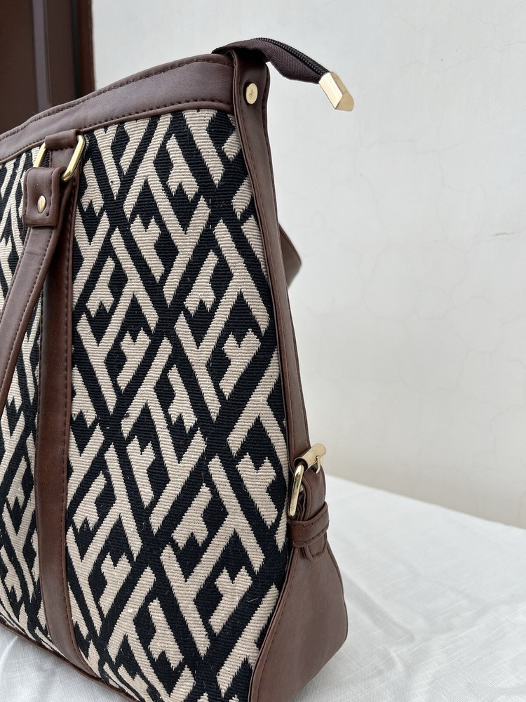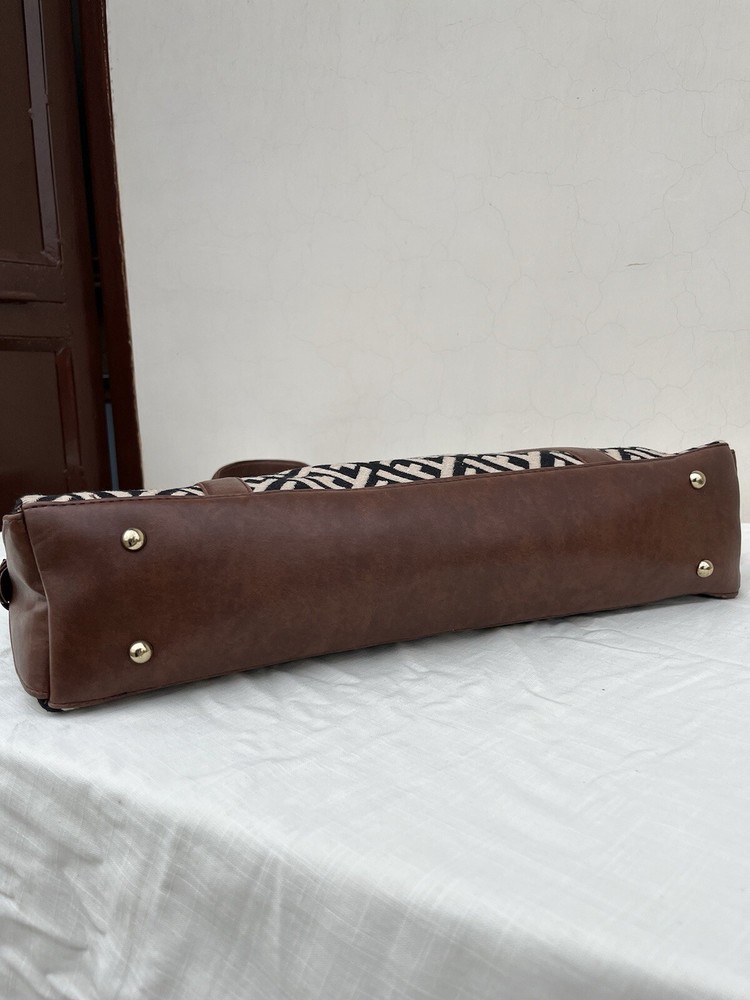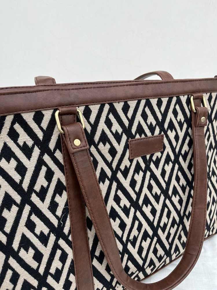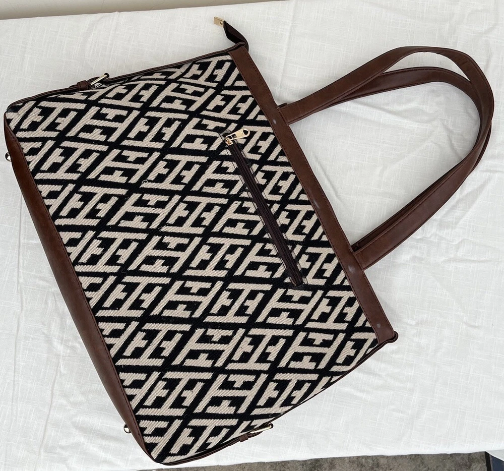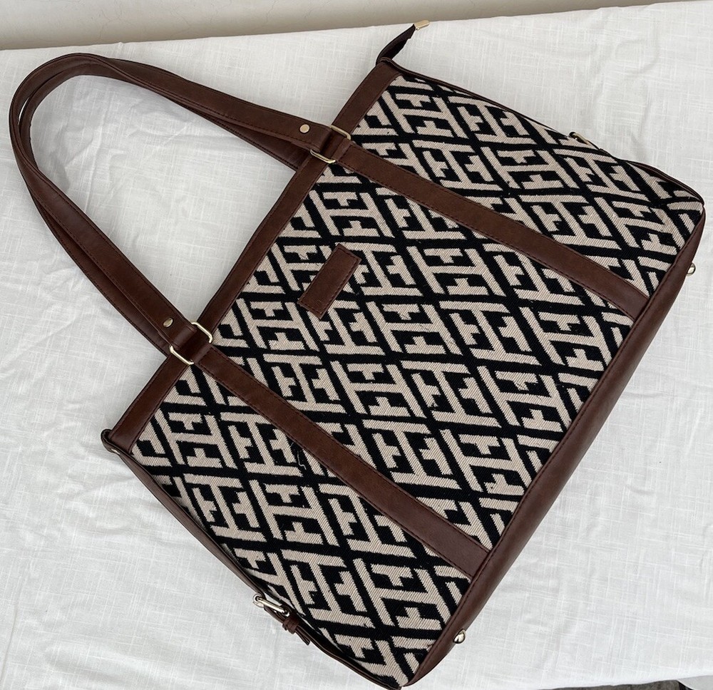 This laptop bag is perfect for any woman who needs to bring their computer to work. The exterior is made of a beautiful jacquard and leather material, with a brown handle and strap made of faux leather. The bag is spacious, with a large size of 16 inches in width, 13 inches in height, and 10 inches in depth. The interior is lined with a gray color, and the bag is designed to hold a laptop, making it perfect for work. The brand is OFFICE, and the bag is classified under the Clothing, Shoes & Accessories, Women, Women's Bags & Handbags categories. This laptop bag is a stylish and functional accessory for any woman who needs to bring their computer to work.