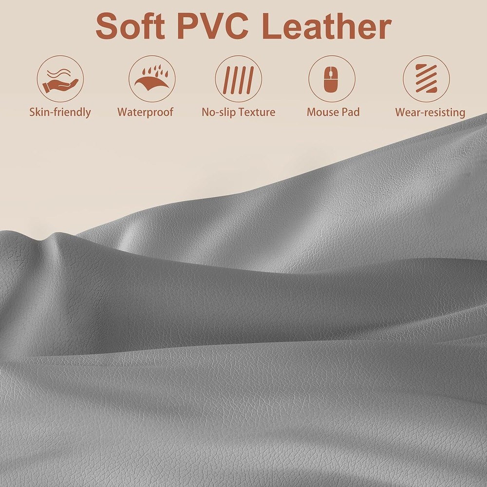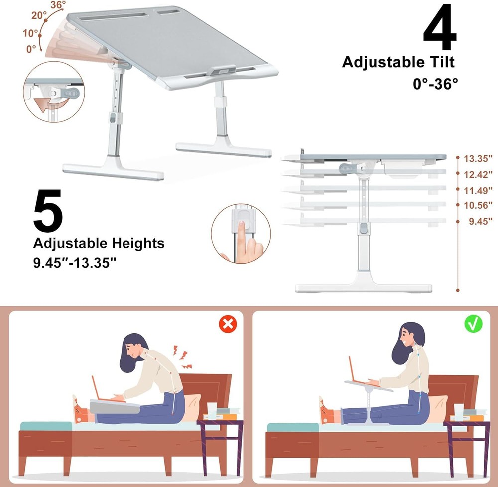 Material Engineered Wood, Solid Wood Particle Board, PVC Leather, Aluminum Product Dimensions 15.7"D x 23.6"W x 9.45"H Color Gray Special Feature Adjustable Height and Angle, Luxurious PVC Leather Desktop, Extra Large Size, Drawer for Storage About this item UPGRADED 30% STRONGER BED DESK - New upgraded laptop bed table with 30% thicker aluminum legs and weighs 5.5 lbs. It is stable whether you use it on the bed, couch or floor. NOTE: Please put the phone into the slot when the desktop is flat or slightly tilted to avoid falling! ADJUSTABLE LEGS AND DESKTOP - The laptop bed desk can be adjusted to 5 heights(9.45”-13.35”) and 4 angles(0°-36°) to accommodate all body types and relieve neck and spine strain. Easily adjust legs for height by simply lifting, then check the pins to ensure they are secure before use. COMFORTABLE LEATHER DESKTOP - The adjustable lap desk is made of high-quality PVC leather, friendly to touch, non-slip and durable, no mouse pad required. Enjoy a superior experience compared to traditional laptop lap desk, combining comfort and practicality. EXTRA LARGE AND WIDE - Measuring 23.6" x 15.7", laptop desk for bed fits all laptop sizes, mice, and tablets. Leg spacing of 23.6" ensures ample legroom. Features a drawer for storage and slots for phones/tablets. Please verify dimensions before purchase to ensure fit. SAFE AND USER-FRIENDLY - Rounded corners of the bed desk for laptop and writing prevent injuries, suitable for kids and adults. The U-shaped edge contours to your abdomen for comfort. The inner edge slopes down, reducing arm strain compared to traditional right-angled edges. Material Engineered Wood, Solid Wood Particle Board, PVC Leather, Aluminum Product Dimensions 15.7"D x 23.6"W x 9.45"H Color Gray Special Feature Adjustable Height and Angle, Luxurious PVC Leather Desktop, Extra Large Size, Drawer for Storage Style Modern Finish Type PVC Leather Age Range (Description) All Assembly Required No Item Weight 4.6 Pounds Included Components Drawer for Storage UPC 733063662839