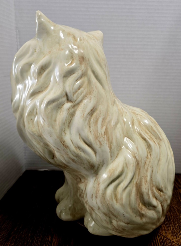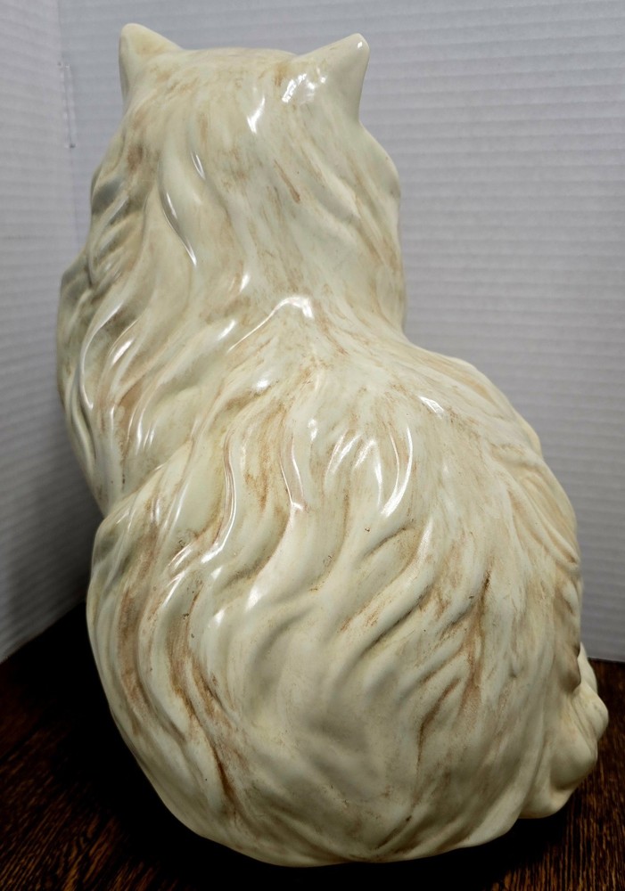 This Large 15" Ceramic Persian Cat Statue from the 1960's-1970's Era features hand-painted details and striking yellow eyes, making it a unique and collectible piece for cat lovers and collectors alike. The ceramic material adds a touch of elegance to this vintage figurine, depicting a lifelike Persian cat in a timeless style that is sure to be a standout in any home decor or display.