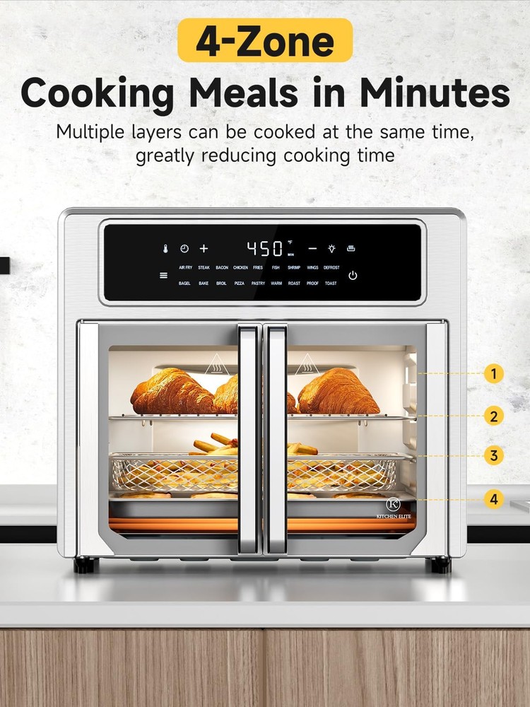 Optimized Cooking & 85% Less Oil: Harnessing 360° turbo-air technology combined with 6 heating elements and a dual-speed fan, you can achieve perfectly golden and crispy food while reducing oil consumption by 85%. 18 Function Presets & 1 Preheat: This product seamlessly integrates the capabilities of an air fryer and an oven, simplifying your cooking experience to meet daily needs. Featuring specially customized Bagel presets, you can enjoy effortless breakfasts without any hassle Fast Cooking & Time Saving: This product enables consumers to save over 50% of cooking time compared to traditional ovens. For instance, French fries cook 22% faster, steak 37% faster, and chicken 27% faster Easy to Clean Material & Dishwasher Safe: Made from high-quality stainless steel and other non-stick materials, this product includes accessories such as an air fry basket, a wire rack, a baking pan, and a slag pan for added convenience