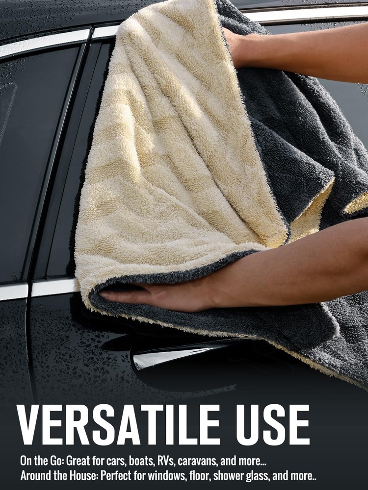 The Premium Super Soft Microfiber Dryer Towel is a luxurious extra large, super absorbent microfiber towel measuring at 26 inches by 20 inches. Made of a blend of 80% polyester and 20% polyamide. The Net Weight of the single towel is 439g (0.96lb). The towel is wrapped in a soft edge which extends the life of the towel, and against light swirls and scratches. This towel is designed to deliver maximum absorbency, a single towel can hold 8 times its weight in water. The towel is machine washable with easy care. As with all microfiber products, never expose them to fabric softener. Fabric softener will reduce their static properties and cause the microfiber to clean/spread less effectively. They can be line dried or machine dried on low setting, again, separately from other laundry. [Drying Like a Pro] The luxurious dual-sided microfiber drying towel, designed car enthusiasts and meticulous detailers alike. The net weight of the single towel is 15oz. Come with 2 towels and a storege box [Slash Drying Time by 80%] The large microfiber towel (26'' by 20'', 1100 GSM), acts like a water magnet, 5X more absorbent than ordinary towels. With the ability to hold up to 1 gallons of water, you can effortlessly dry your entire car, truck, or RV in just one pass [Innovative Fabric] The towel features a unique blend of twisted-loop and coral-fleece fibers on 2 sides. The plush, fluffy surface ensures that the towel makes optimal contact with liquid, while the twisted fibers work diligently to absorb it, which result in both ultra-gentle drying and exceptional absorption [Completely Flawless] With over 500,000 fibers per square inch, the shaggy cloth absorb without scratches. Get your ride looking fresh: clean glass, shiny paint so slick you can check your teeth in it [Versatile Application] This dual-color premium towel glides effortlessly over your paint, glass, and trim, offering an instant, smooth drying experience. Perfect for both household and vehicle drying tasks, it’s a must-have accessory for anyone looking to maintain a pristine appearance