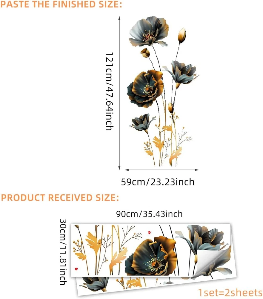 LARGE 3D FLOWERS WALL DECALS-Exquisite printed designs are amazing. Decorating them on a blank background wall can create a unique style and atmosphere. WHAT YOU WILL RECEIVE - Large 3D wall sticker set contains 2 pieces of 11.81 inch * 35.43 inch gold and black themed flower art wall stickers. The modern design style and exquisite black and gold combination can meet the decoration needs of most spaces and can improve the grade of the room background wall. HEALTHY AND SAFE MATERIAL - We use good vinyl material to make it, which is sticky and not easy to fall off, durable. Use it as a room decoration material, it is safe, non-toxic, waterproof and can be used in various environments. WIDE USE IN ENVIRONMENTS: These decorative decals are perfect for any flat surface and are suitable for a variety of environments - baby bedrooms, living rooms, nurseries, playrooms and more. They can also be installed on windows, tables, flat-panel appliances and flat-panel furniture, adapting seamlessly to different environments while also being easily removed and leaving no trace. EXCELLENT CUSTOMER SERVICE: We prioritize your satisfaction with comprehensive after-sales support. If you have any questions before or after your purchase, our customer service is available 24 hours a day. If you encounter any product issues after purchase, we offer hassle-free returns and exchanges to ensure you a worry-free shopping experience. Elevate your decor with our Large Flower Wall Stickers in bold black and gold. These striking blooms infuse elegance and sophistication, transforming any space into a chic floral masterpiece. The rich contrast adds a touch of luxury and modern flair, turning your walls into a stunning visual centerpiece. - Why choose us - Our products are diversified and we focus on product quality and service. Every product is carefully designed and produced by me. Unonede Provide a sincere after-sales experience. Money back guarantee! Warm notice: Please allow measurement error. The colors may exist slight difference due to different screens. Finally, thank you for browsing, if you think it's good, please gently put it in your cart and have i