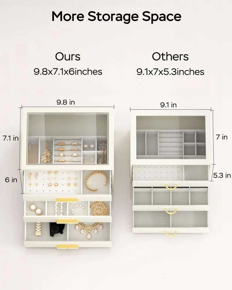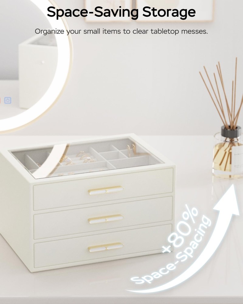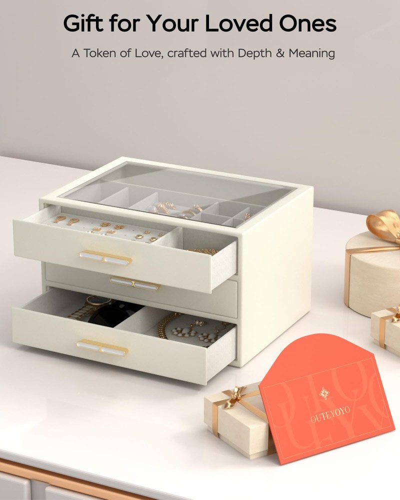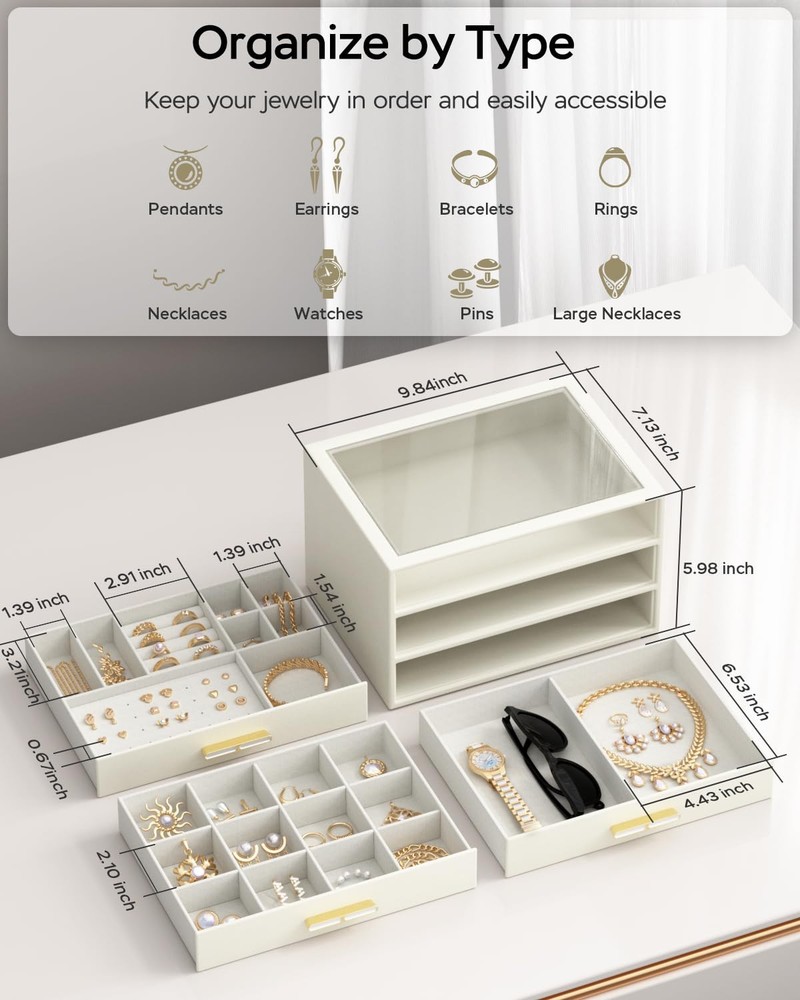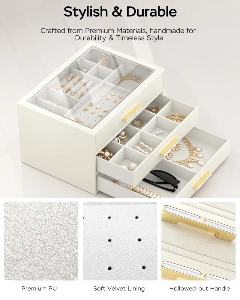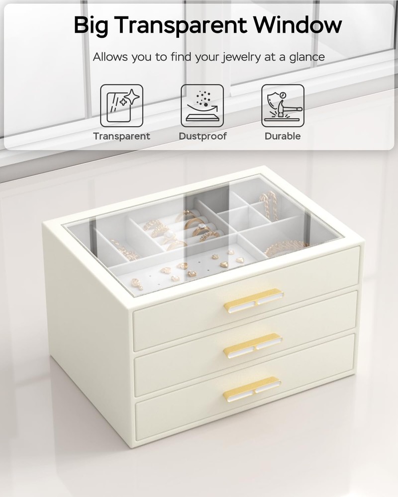 Clear Glass Lid: Our transparent lid design for jewelry boxes offer a dust-free, ready-to-wear display, enabling you to easily find your favorite jewelry piece at a glance without having to open the box 3-Tier Design: This jewelry box keeps all your jewelry neatly organized, with designated slots for smaller pieces on the top tier and two drawers for larger jewelry at the bottom, providing ample storage space and ensuring effortless access Sturdy Electroplated Hardware: Equipped with electroplated hardware, including hinges and latches, our drawer jewelry organizer offers secure closure and easy opening. The electroplated finish adds a touch of elegance while ensuring durability and resistance to corrosion Versatile Use: Enhance your storage solutions with this sleek and modern jewelry holder! Display it on your bedroom dresser or in your entryway closet to effortlessly organize pins, necklaces, rings, bracelets, and all your favorite accessories. Ideal for any lifestyle, this must-have organizer will keep your jewelry collection looking its best! Ultimate Present Idea: This one-of-a-kind jewlery organizer is the perfect gift for your special someone on their birthday or anniversary and Christmas , Valentine's Day, or Mother's Day; Alternatively, spoil yourself with this elegant jewelry box—you've earned it!