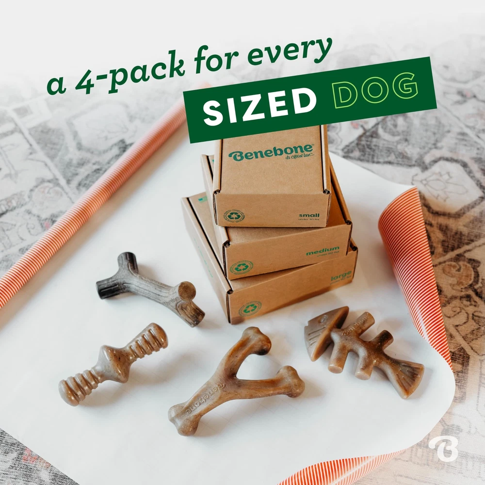 Large 4-Pack Dog Chew Toys for Aggressive Chewers, Made in USA, 90lbs and Under FOUR PACK! – You know what’s better than a ? A box of four of them. DURABLE, LONG-LASTING –Benebones are tougher than real bones and last for weeks. Super-chewer? Bring it on. REAL FLAVOR – We use only 100% REAL FLAVOR like bacon, fish and even wood. Trust us, dogs can smell a fake from a mile away. EASY TO PICK UP AND CHEW – Benebones are uniquely designed for a paw-friendly grip so your pup can quickly grab them and get a good chew going. Think about it: dogs don’t have thumbs. USA MADE – We make and source everything in the USA HAPPINESS, GUARANTEED – Have an issue? Want to chat with the elf who boxed yours? Reach out to us directly and you’ll get a real person whose sole job is to make you and your pup happy. At , we started with the premise that dogs experience scent and flavor in a way we can't even grasp. So, we ditched the neon colors and loud squeaks. Inspired by the dog's powerful sense of smell, we developed a long-lasting durable chew that's jam-packed with real flavor. Once your dog takes a bite of our USA-made chews, he'll be hooked.Instructions for Use and Safety Information: While recognizing that weight limit is a rough guide, our small products are for dogs under 30 lbs, our medium products are for dogs under 60 lbs, and our large products are for dogs under 90 lbs. Always choose the largest size your dog can handle. nylon chew toys carry risk. They are for dogs only and are not to be eaten. Chewing should always be supervised. Discard after reasonable wear. Benebones may cause an allergic reaction in humans or animals that are allergic to one or more components, such as nylon, peanuts, chicken, peppermint or pork. For more information, see Instructions for Use and Safety Information at .com/safety. Shipping We offer FREE shipping on all orders! We ship within Three business days of payment, usually sooner. We use a selection of shipping services such as UPS, FedEx, USPS etc. We only ship to the lower 48 states, no APO/FPO addresses or PO Boxes allowed. Local pickups and combined shipping options are not provided at this time. Return You can return a product for up to 30 days from the date you purchased it. Any product you return must be in the same condition you received it and in the original packaging. Please keep the receipt. Payment We accept payment by any of the following methods: PayPal Please pay as soon as possible after winning an auction, as that will allow us to post your item to you sooner! Feedback Customer satisfaction is very important to us. If you have any problem with your order, please contact us and we will do our best to make you satisfied. Contact Us If you have any queries, please contact us via ebay. We usually respond within 24 hours on weekdays. Please visit our eBay store to check out other items for sale! Thank you for shopping at our store.