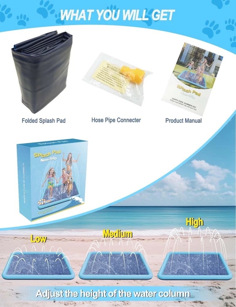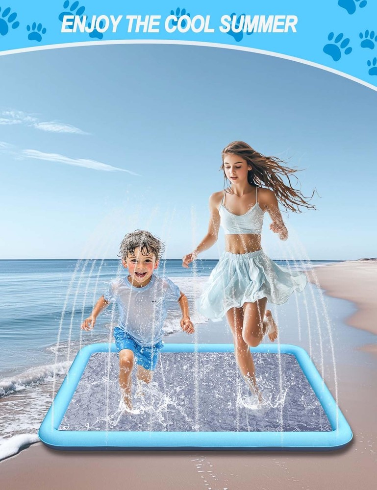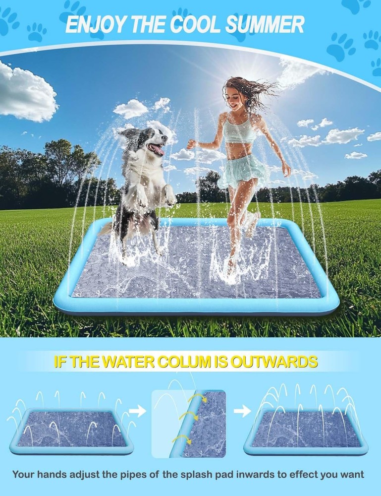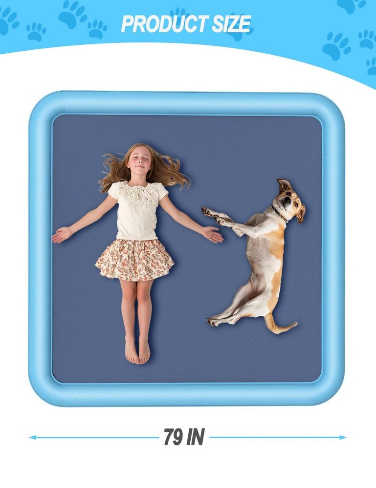 Experience endless outdoor fun with the 79IN Dog Splash Pad ! Spacious and versatile, it’s the ideal water activity pad for large dogs, small pets, and families. It provides ample room for jumping, running, and splashing. Constructed from 0.5mm thick PVC , this splash pad is built to endure energetic play, claws, and daily use. The tightly sealed seams and robust design prevent leaks, ensuring a hassle-free experience. Its vibrant blue square shape adds charm to any backyard setup. Safety meets style with its anti-slip surface , which minimizes accidents and provides secure footing during water activities. Effortless to set up, the splash pad connects to any standard garden hose, delivering instant refreshment. Thoughtfully packaged in a bright gift box, this product includes a detailed user manual , making it an excellent gift for pet lovers and families. Create unforgettable memories with the 79IN Dog Splash Pad—where fun meets functionality. 【Quick Installation】Easily connect it to your garden hose, adjust the water flow, and let the splashing fun begin immediately. 【Strong and Tear-Resistant】Made from premium 0.5mm PVC, this pad delivers superior durability compared to thinner alternatives. 【Designed for Safety】The anti-slip surface ensures dogs and kids can run and play safely without worry. 【Spacious Family Fun】With a 79-inch diameter, this splash pad accommodates larger pets and families, making summer gatherings extra memorable. 【Convenient Accessories Included】Comes with a gift-ready box, a brief instruction, ensuring an effortless user experience.