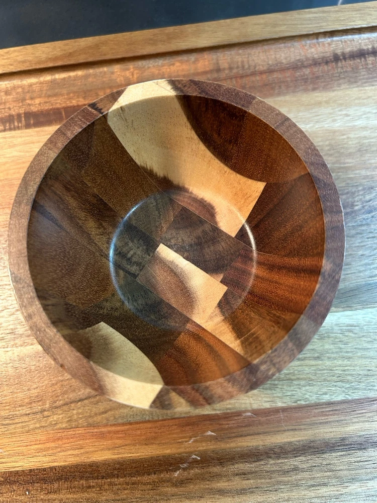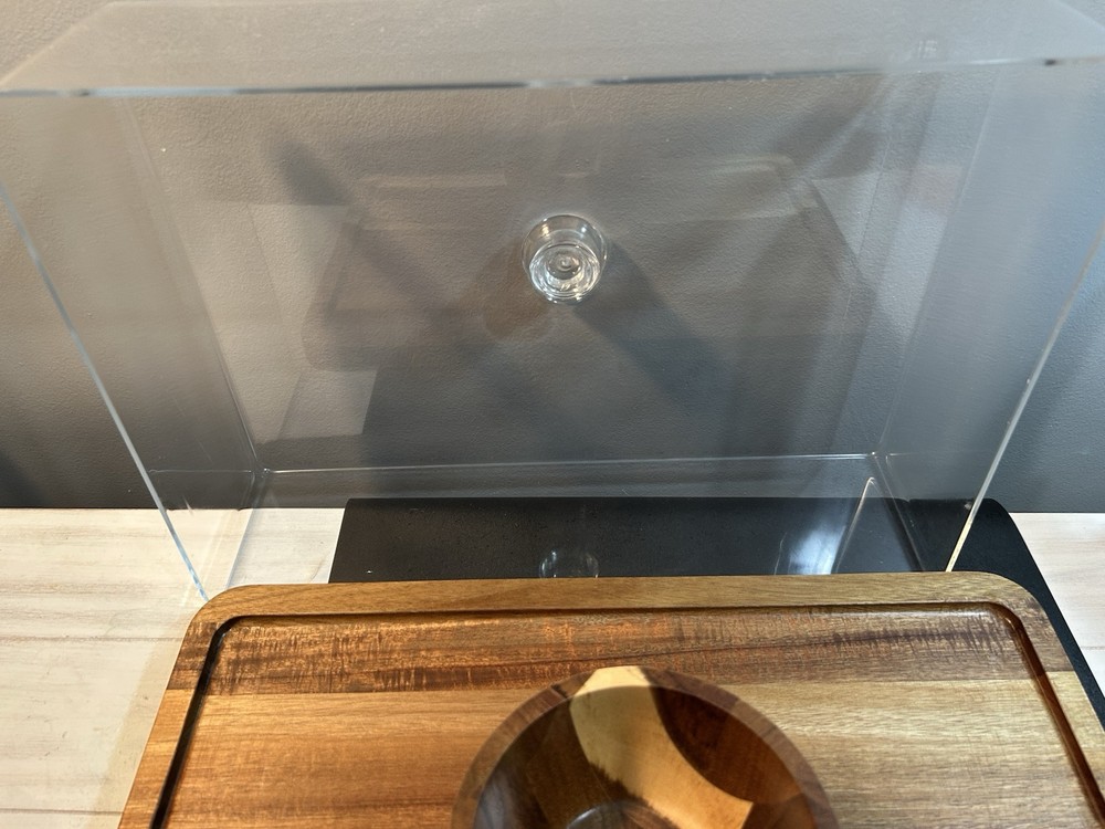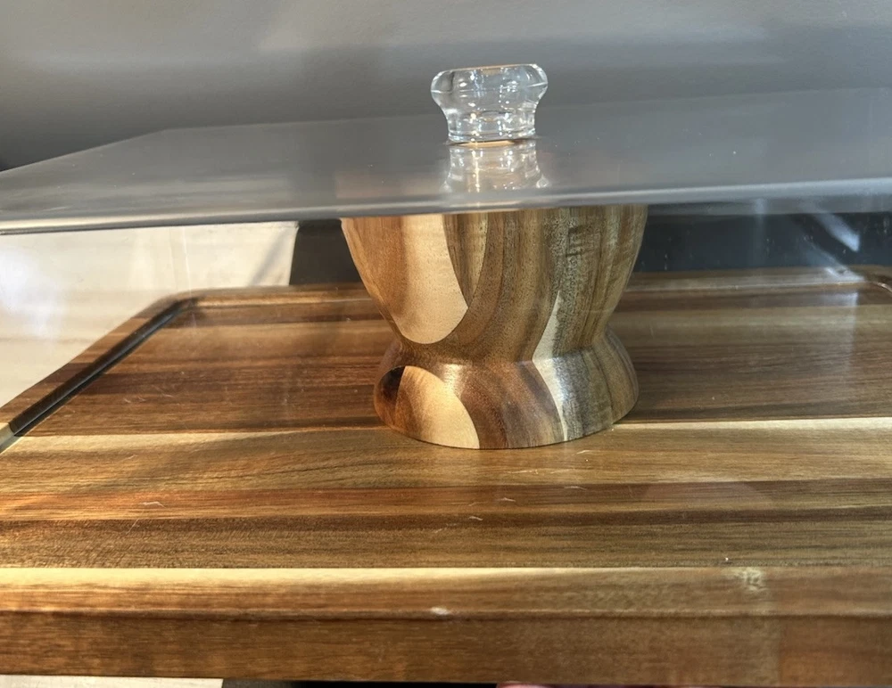 Large acacia wood Food Tray, Charcuterie Board With Dip Bowl And Acrylic Cover . Beautiful item in excellent condition. Board measures 17 inches long , 12.75 wide. Bowl is stationary and measures 3.5 inches tall, 5 wide, and 2.25 deep. The cover is 4 inches tall, 15.25 long and 11 wide.
