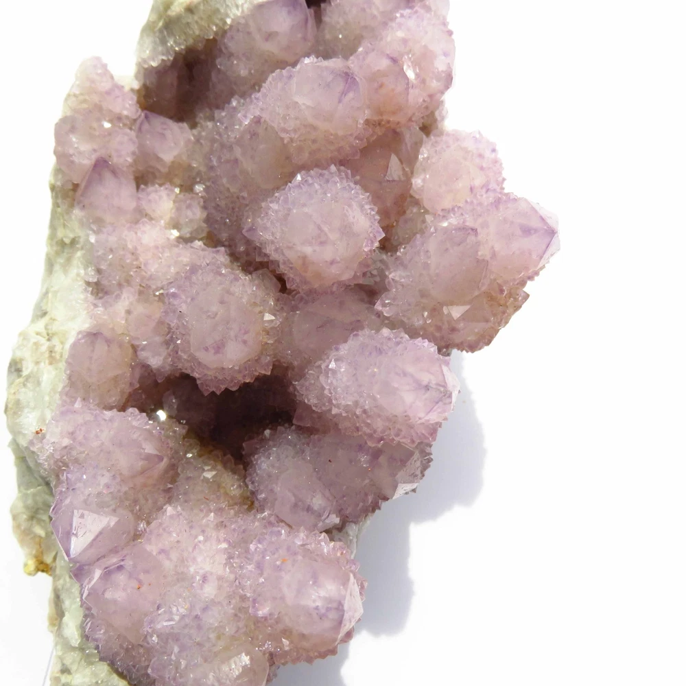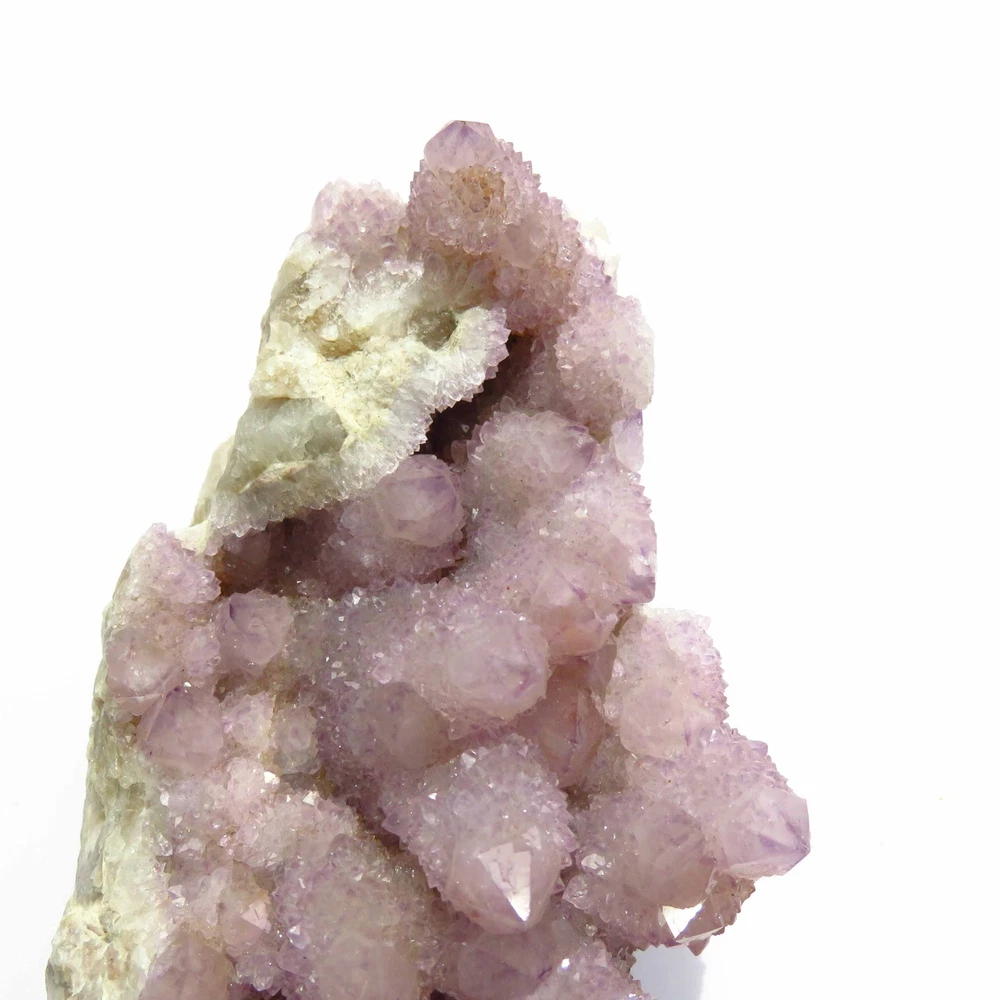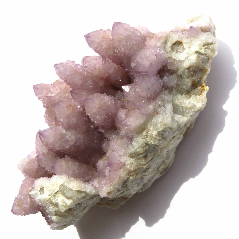 Cactus Quartz or Spirit Quartz Size Approximately 11 cm x 17 cm x 7 cm 907.1 g View My Other Items For Sale Visit My eBay Store Add me to your Favorite Sellers A cactus or spirit quartz is a quartz crystal that is encrusted by a second generation of smaller crystals grown on its prism faces. These crystals were first discovered in 1986 in the Magaliesberg Mountain Range near Pretoria, South Africa. It occurs as quartz, citrine and amethyst, and comes in a wide range of colors, including purple amethyst, violet amethyst, smoky, milky clear and golden citrine. FAQ/Tips Crystals are priced by quality, color and size. Purple amethyst is more highly prized and will cost more for a smaller lesser quality crystal. Lavender is the most common color and where you will find the best quality/value for price Crystals change colors with changes in type angle and intensity of light. Color may also vary between monitors. Pictures were taken in bright light. We do our best to give you many views so you can judge the quality of the given crystals. If you have questions, please ask before bidding or buying. Many of the crystals have special color properties: Many have phantoms, not just the ones we've indicated. Some have "floating" purple tips. The placement of darker purple against purple or white crystals appears to change as the crystal is turned. Many are a mixture of citrine and amethyst. The ones called "Golden Healers" or "Sunshine" have a rainbow effect on crystal faces. We value your feedback please contact us with problems. Items are returnable. Track Page Views With Auctiva's FREE Counter