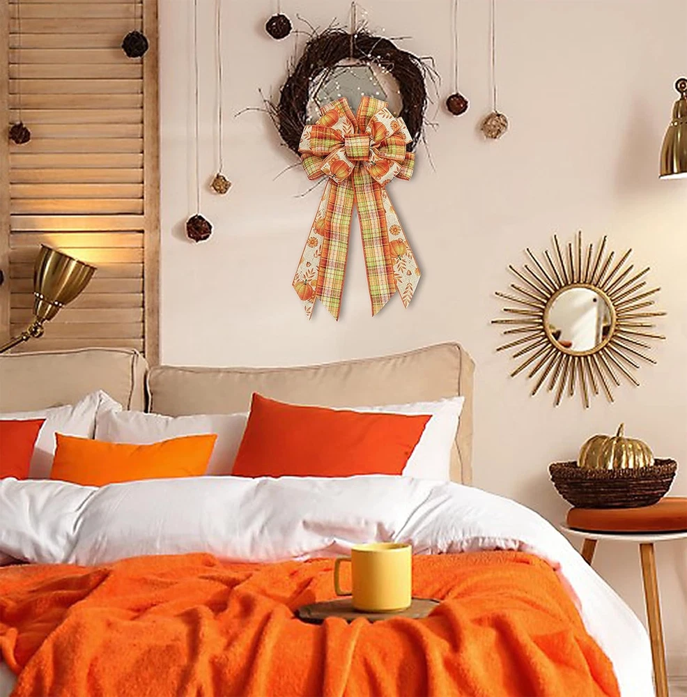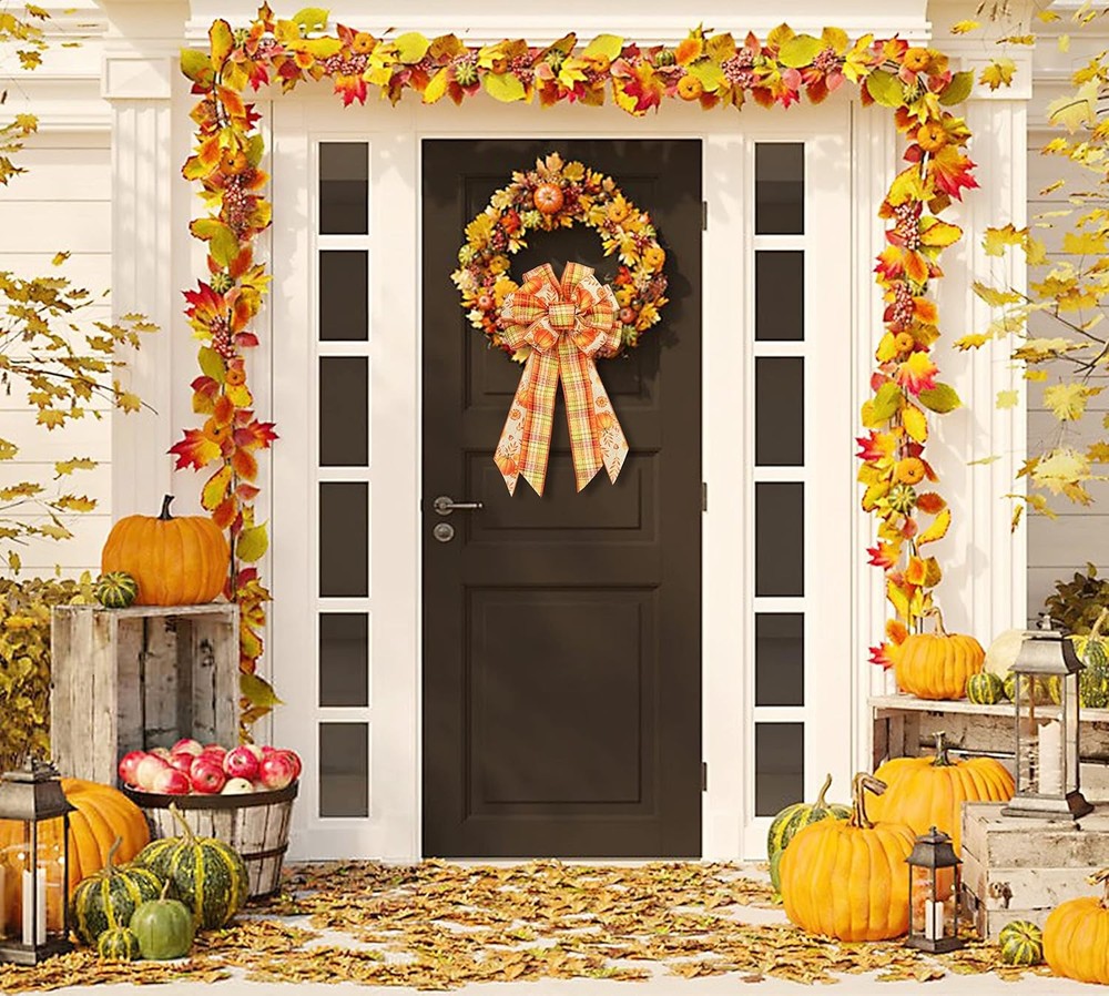 This gorgeous fall wreath bow is an absolute must-have for autumn decor! The rich orange, green, and red buffalo plaid pattern pops beautifully, and the burlap material feels sturdy yet soft. I love how the pumpkin and leaf accents add festive charm to my front door. The colors stay vibrant, and the bow holds its shape perfectly. It arrived well-packaged with no damage, and the size is ideal for making a statement. So easy to attach to wreaths, garlands, or even gift packages. Definitely adds that cozy, seasonal touch to my home—highly recommend!