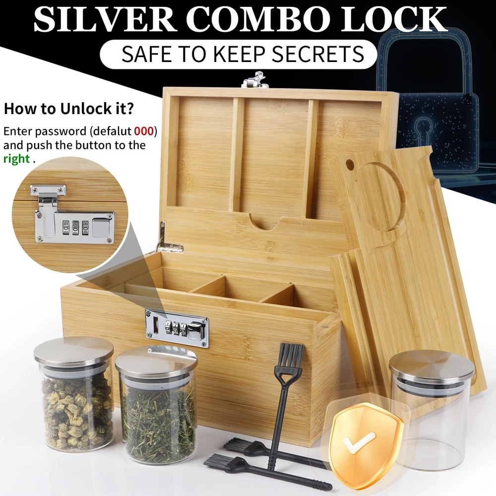 πBOX DIMENSION :The storage box measures 10.2''(L) Γ 7β'(H) Γ 5.5''(W) ,the whole kit comes with glass jars Γ 3οΌcleaning brushes Γ 3 , sufficient accessories satisfy your needs. πPREMIUM NATURAL BAMBOO BOX : The decorative box is made of premium sustainable bamboo., heavy-duty Bamboo thatβs strong enough to keep them study and safe. Bamboo Box is definitely a home essentials organizing choice. π₯SLIDING TRAY & REMOVABLE COMPARTMENT - The sliding out tray offers a customizable layout for your stored items. Adjust the detachable compartments to accommodate different sizes and types of belongings, providing you with a versatile and adaptable storage solution. ππππππππππππ ππππ ππππ ππππ πππππππ: Default password is 0-0-0 of combination lock ,we have video instruction of code setting in the product page and manual instruction in the package to ensurr that you can quickly establish a secure combination without any complicated procedures. Creat a private space and enjoy a straightforward/user-friendly experience πOUTSTANDING DETAILS -The bamboo box is crafted well by master craftsman . Strong hinges ensure easy opening and closing of the lid.Bambo surface ismooth and well polished.In addition ,there are four rubber mat on the bottom to protect the box. πA GREAT GIFT FOR ENTHUSIASTS - . What could be better than to help them preserve the essentials meanwhile keeping everything neat and organized?