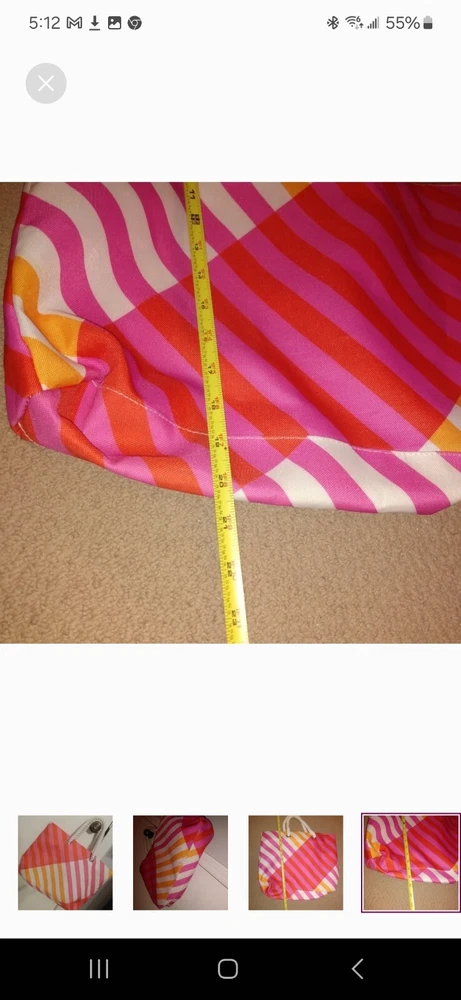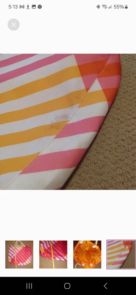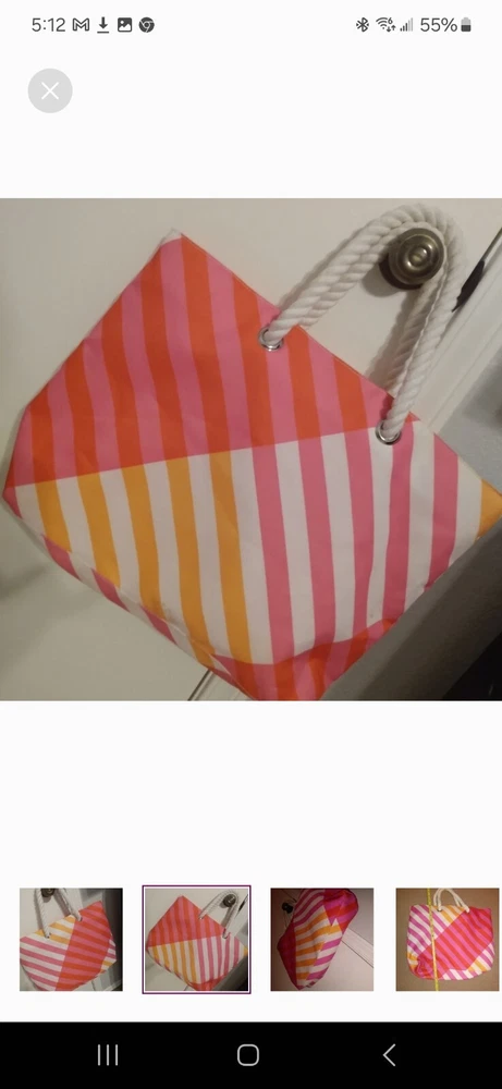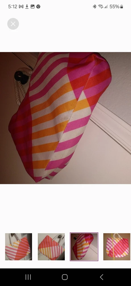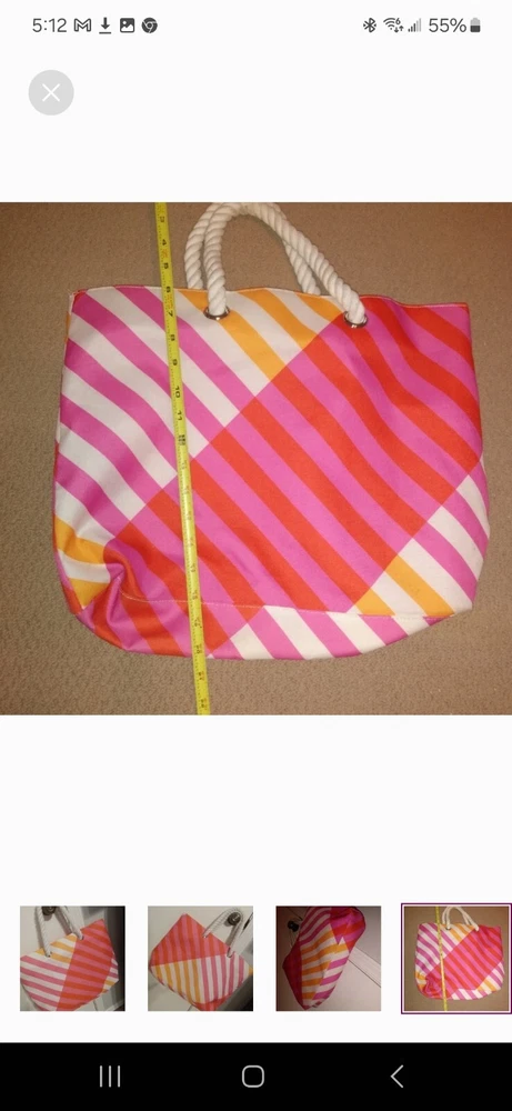 Orange, pink and white tote great for beach or pool. Very large. Orange lining inside in perfect condition. Rope shoulder strap. Some wear on bottom which is pictured. A little dirt spot on handle which is also pictured.