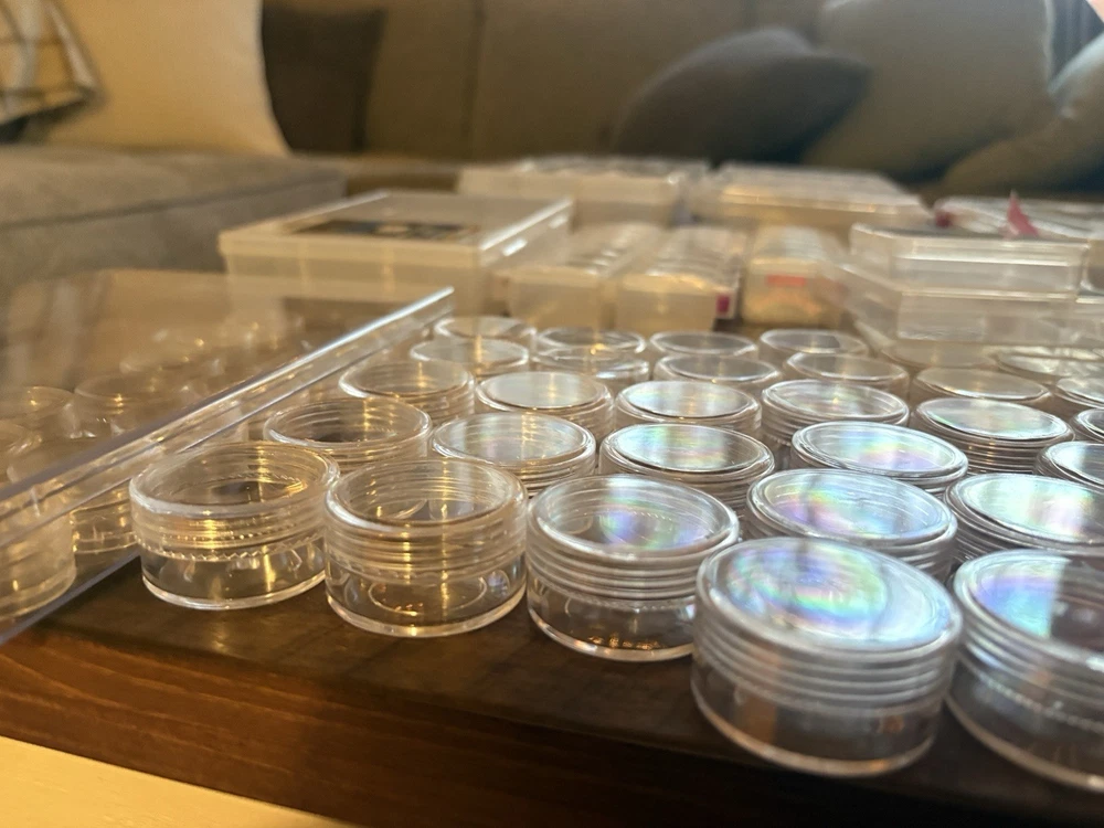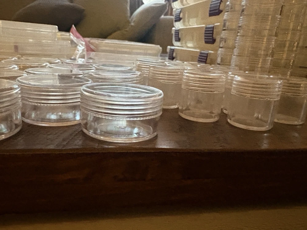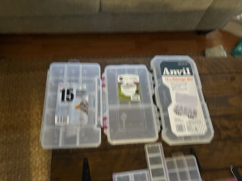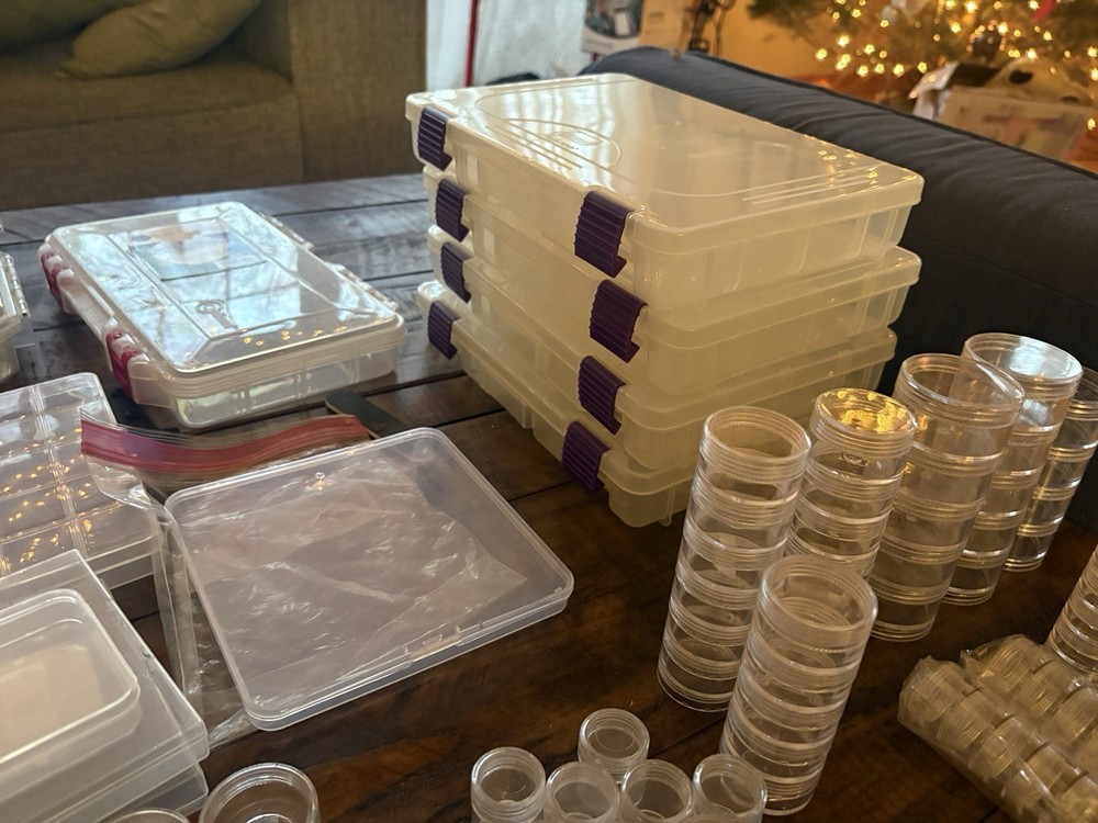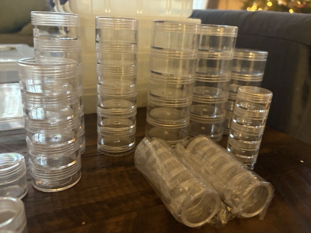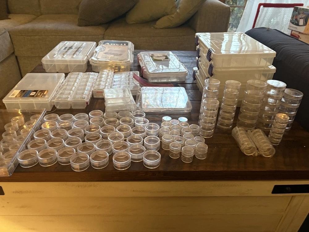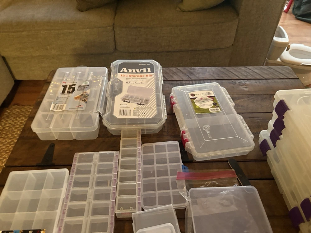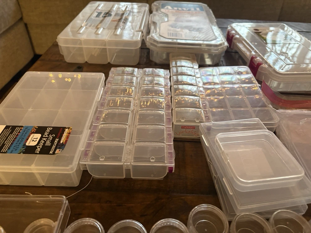 New & Used (Some containers appear unused; others may show light storage wear) ⸻ Description (copy/paste ready) Large mixed lot of bead and jewelry storage containers. Perfect for beaders, jewelry makers, crafters, or anyone organizing small parts. Lot includes (approximate): • Multiple clear plastic bead organizers with adjustable compartments • Stackable storage boxes with secure latches • Screw-top clear plastic jars in multiple sizes (great for beads, findings, gemstones) • Anvil brand 12” storage bin • Slim multi-compartment cases for seed beads or findings • Small square snap-lid containers All items are shown in the photos and sold as one lot. No beads included — containers only. Great for: • Beads & gemstones • Jewelry findings • Diamond painting drills • Craft supplies • Hardware or small parts
