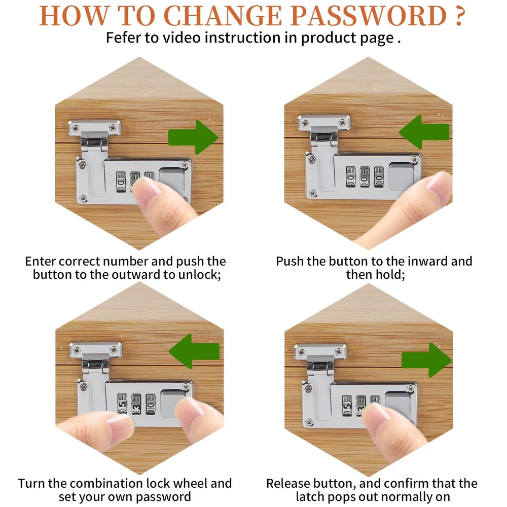 πBOX DIMENSION :The storage box measures 10.2''(L) Γ 7β'(H) Γ 5.5''(W) ,the whole kit comes with glass jars Γ 3οΌcleaning brushes Γ 3 , sufficient accessories satisfy your needs. πPREMIUM NATURAL BOX : The decorative box is made of premium sustainable ., heavy-duty thatβs strong enough to keep them study and safe. Box is definitely a home essentials organizing choice. π₯SLIDING TRAY & REMOVABLE COMPARTMENT - The sliding out tray offers a customizable layout for your stored items. Adjust the detachable compartments to accommodate different sizes and types of belongings, providing you with a versatile and adaptable storage solution. ππππππππππππ ππππ ππππ ππππ πππππππ: Default password is 0-0-0 of combination lock ,we have video instruction of code setting in the product page and manual instruction in the package to ensurr that you can quickly establish a secure combination without any complicated procedures. Creat a private space and enjoy a straightforward/user-friendly experience πOUTSTANDING DETAILS -The box is crafted well by master craftsman . Strong hinges ensure easy opening and closing of the lid.Bambo surface ismooth and well polished.In addition ,there are four rubber mat on the bottom to protect the box. πA GREAT GIFT FOR ENTHUSIASTS - . What could be better than to help them preserve the essentials meanwhile keeping everything neat and organized?