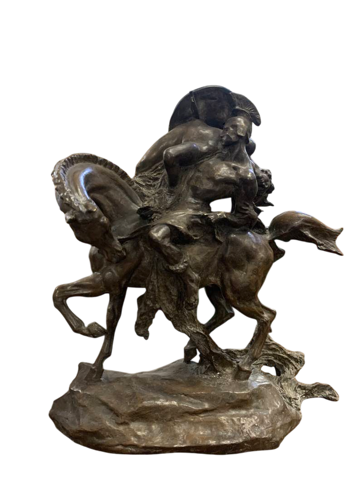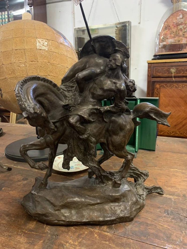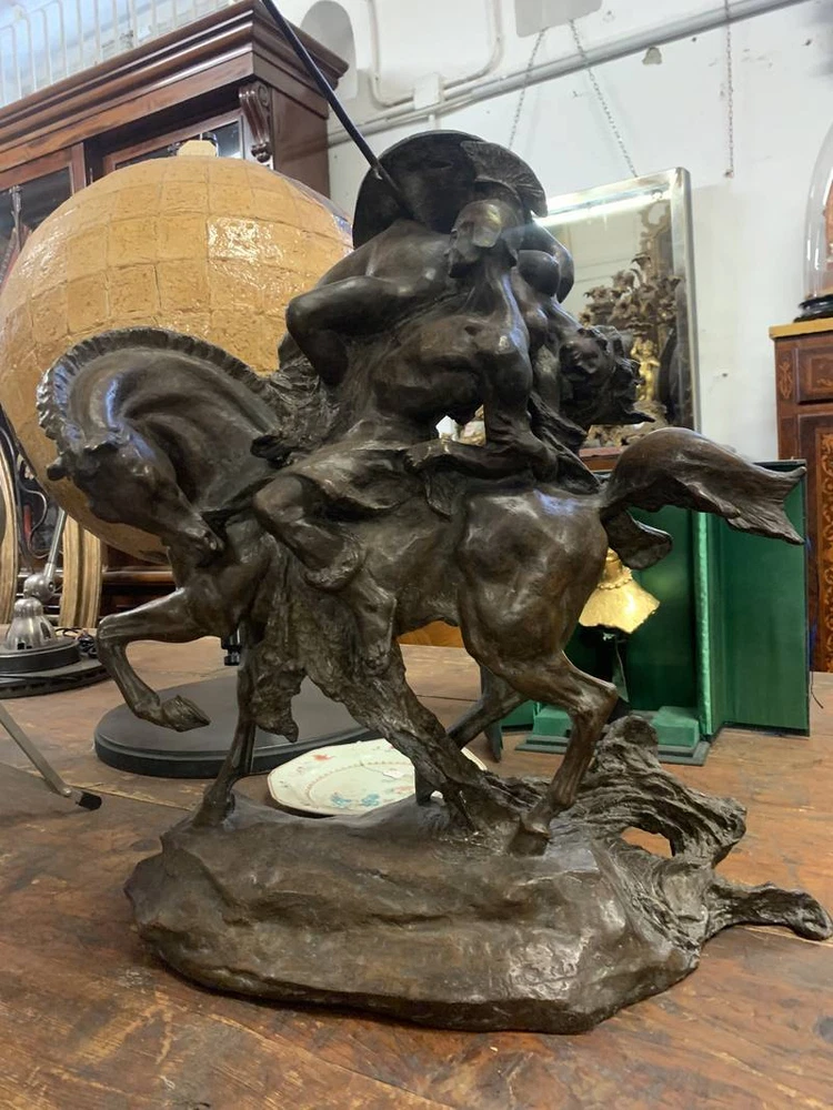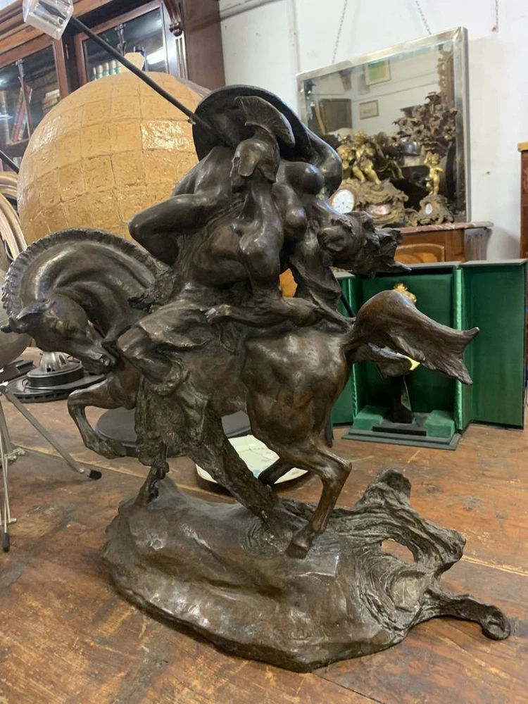 Grande scultura in bronzo Il ratto Firmato Ezio Ceccarrelli 1865 - 1927 Importante grande scultura in bronzo scuro in patina Ezio Ceccarelli . (1865 - 1927). Biografia : Ezio Ceccarelli (1865-1927), nato a Montecatini Val di Cecina, è stato uno scultore italiano che ha iniziato il suo apprendistato presso l'Academy di Rivalta e Bortone a Firenze, città che amava particolarmente, diventando poi lui stesso insegnante presso la Scuola Industriale d'Arte di Volterra. Oltre alla sua attività di insegnante, ha fondato uno studio di scultura a Firenze, accogliendo studenti e collaboratori. Grazie a questo laboratorio e ai riconoscimenti che ne derivano, partecipa a numerosi concorsi, tra cui quello per la statua di Re Carlo Alberto a Roma, vince il primo premio Curlendese a Bologna nel 1899 e, soprattutto, la medaglia d'oro per la statua Ecce Homo al concorso Gregoriano di Roma. Il suo virtuosismo e la sua fama si sono diffusi in lungo e in largo, grazie alla partecipazione a numerosi concorsi internazionali, tra cui quelli di Liegi, Copenaghen e Atene. An He rappresentò l'Italia all'Esposizione Universale di Parigi, esperienza che ripeté nel 1904. Forte di questo successo, scolpì o progettò diverse sculture civili per città italiane, tra cui un Garibaldi per Massa nel 1905, un Carlo Montanari per Verona e un Christopher Designs per La Plata in Sud America. Bibliografia : A.Panzetta, Dizionari Degli Scultori Italiani Dell'Ottocento, Torino, ed. Umberto Allemandi, 199 199 Concorso Gregoriano di Roma ottiene con Noli me tangere il primo premio medaglia d'oro Nel 1902 Ceccarelli torno' a Torino per partecipare all'importante 1 Esposizioe Quadriennale che fu significativa vetrina del Simbolismo italiano , vi aderirono Pelizza, Innocenti, Kienerk e Previati, i consensi suscitati nell'ambiente piemontese sono altresi ' documentatei da due sculture bronzee conservate presso la Galleria Reinaudo di Torino Codice prodotto : BL_497761