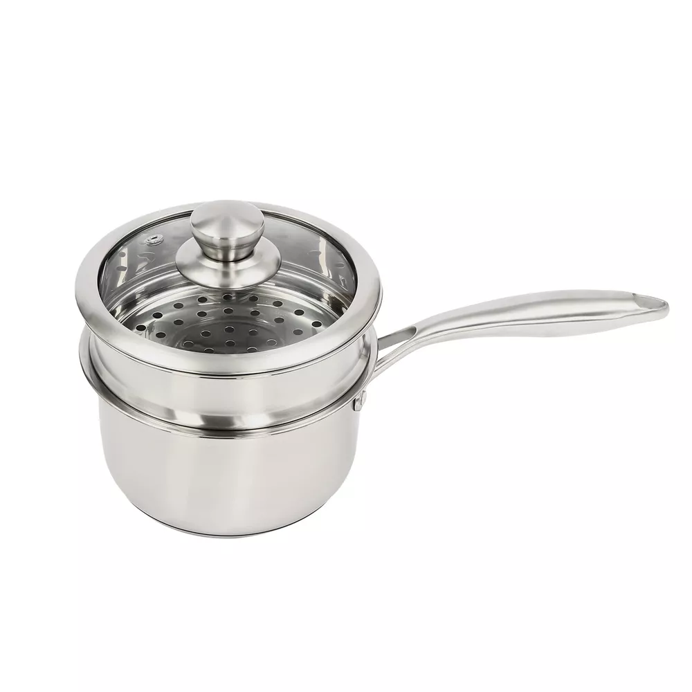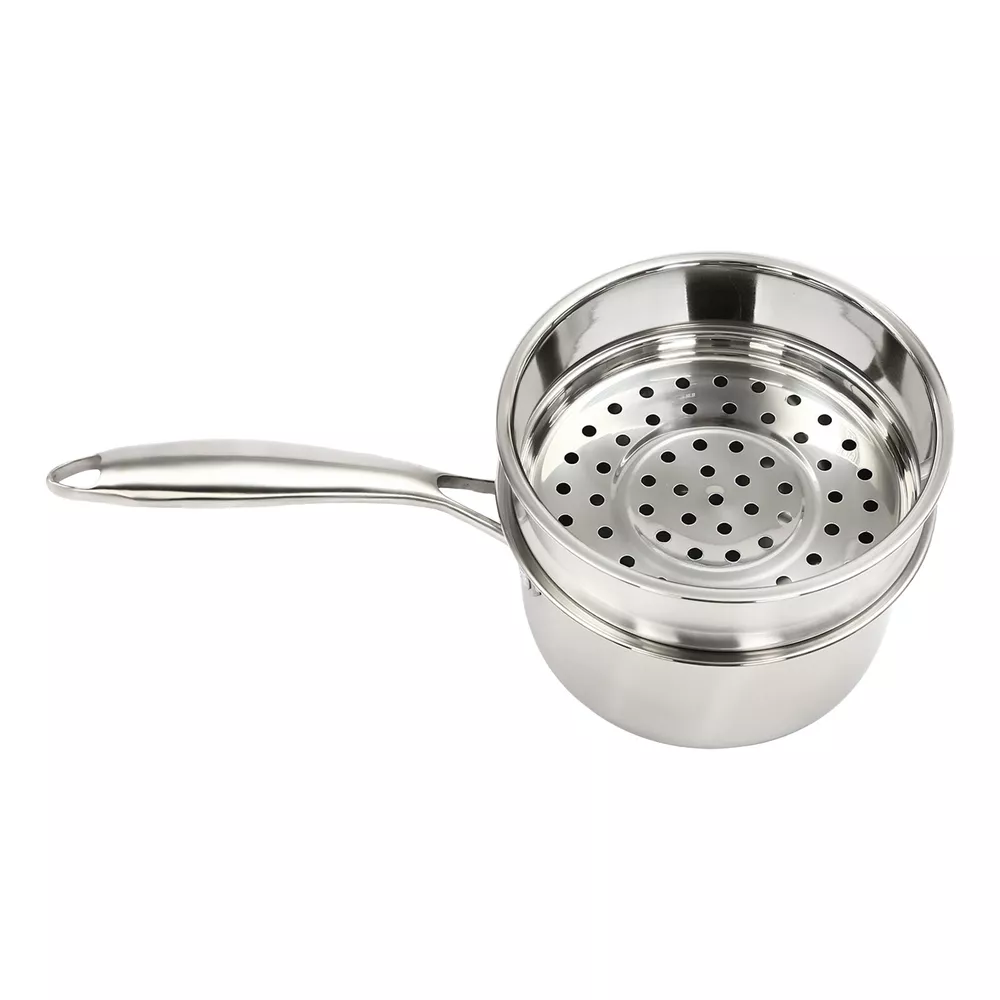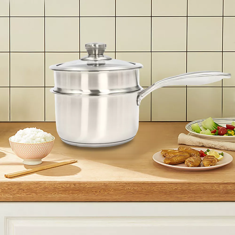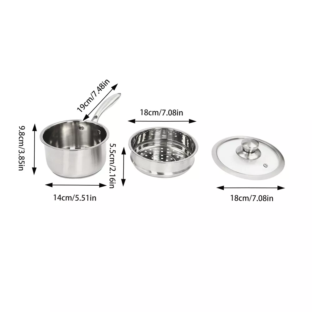 Package Included 1* Saucepan with Handle 1* Steamer 1* Lid Large Capacity Sauce Pan For Cooking With Handle Double Layer Steaming Pot Description If you like to cook food at home, then this steamer pot made of high-quality stainless steel is ideal for you. It can be used to make soups and steam a variety of foods at the same time, and its excellent heat conductivity provides you with increased cooking efficiency. One pot for two purposes, you should not miss such a convenient cooking prop, come and enjoy the fun of cooking! Specification Material: 304 Stainless Steel, 201 Stainless Steel, 430 Stainless Steel, Glass, Aluminum Process: Wire Drawing, Polishing Color: Silver Shape: Round Style: Modern Assembly Required: No Is Dishwasher Safe: Yes Is Oven Safe: Yes Capacity: 1297ml/ 1.37qt Steamer Size(D*H): 18*5.5cm/ 7.08*2.16in Saucepan Size(D*H): 14*9.8cm/ 5.51*3.85in Handle Length: 19cm/ 7.48in Thickness: 0.5mm/ 0.02in Gross Weight: 1.8kg/ 3.97 lbs Net Weight: 1.6kg/ 3.53 lbs Package Size: 35*12*18 cm/ 13.78*4.72*7.09in Package Included 1* Saucepan with Handle 1* Steamer 1* Lid Key Features Long Service Life: This product is mainly made of 304 stainless steel and 210 stainless steel and adopts wire drawing and polishing processes, making it bright and resistant to abrasion, heat, rust, and deformation and ensuring a long service life. Additionally, it adopts an uncoated design to take care of your family's health. Steaming and Cooking: This product includes a saucepan for cooking, stewing soup, making Congee, etc., and a steamer for steaming seafood, dumplings, egg custard, etc. while preserving the nutrients and flavors of the dish for a healthier and tastier dining experience. They can be used simultaneously to improve cooking efficiency. Good Heat Conductivity: The three -layer composite pot bottom design (304 stainless steel + aluminum + 430 stainless steel) can conduct heat quickly and evenly to improve the efficiency and quality of cooking without a long waiting time. Visual Design: The clear glass lid allows you to easily observe the status of the food inside the pot without removing the lid. Large Capacity: Its 1.37qt capacity can handle your breakfast, lunch, and dinner and allow you to enjoy every meal you have. Its deepening design allows you to cook more comfortably without worrying about food overflowing out of the pot. Space Saving: The overlapping design allows you to place the steamer and saucepan together, which saves tabletop space and makes your kitchen more organized. Easy to Clean: The smooth surface of the stainless steel makes it very easy to clean. After use, you can easily clean it with water and detergent or put it in the dishwasher. Good Customer Service: We stand behind all our guests and look forward to assisting you with your purchase. It is our pleasure to answer your confusion and questions. The end of the story between us is not "we sell and you buy". Details Practical Lid: This lid with a handle and ventilation hole can effectively prevent dust and insects from entering, reduce internal air pressure, and make it easy for you to open and close. Safe Handle: The 7.48" long handle is fixed with rivets and features a hollow design, ensuring firmness, providing a comfortable grip, preventing burns, and improving safety in use. Moreover, the hanging hole design at the handle end facilitates hanging the saucepan on the wall for storage. Smooth Edge: The rounded and smooth edges not only add to the aesthetics of the product but also improve the safety of use. Application It is suitable for homes, restaurants, hotels, fast food stores, and other places. It applies to a ll kinds of stoves, such as induction, electric, ceramic, or gas stoves. Notes Please note that the newly purchased product needs to be scrubbed clean with detergent and white vinegar, and should not be put into use by simply rinsing with water. The black substance washed out is the residue produced after the metal mirror treatment, which is not a product quality problem. If you can't clean it, please use hot water and white vinegar to clean it at a ratio of 10 to 1 (white vinegar shouldn't be too much), and then wash it and dry it with boiling water. Please note that washing the product with water for a long time will make the surface dull and lose its proper luster. Please avoid contact with sharp objects and strong acids and alkalis to ensure the surface is not scratched and food hygiene and safety. Please wash and dry it thoroughly after each use and place it in a dry place to avoid food grease residue, which may cause rust. Please use lukewarm water for a better cleaning effect. Sponge, dishcloth, and detergent/detergent can be used as cleaning tools. It is not recommended to use wire brushes salt and other large particles to scrub the product, which will cause the mirror surface to darken and become old. In case of sticking, it is recommended to use lukewarm water until it is soft and easy to clean. Please allow the slight color difference caused by the shooting light and the 1-3 cm error due to manual measurement, and make sure you do not mind before ordering. Payment Delivery details Terms of sales About us Contact us Payment We accept ebay payment 。 Fees such as import duties, taxes are not included in the item price or shipping costs. These charges are the buyer's responsibility. Delivery details Shipping: 2-9 working days to: USA Terms of sales We maintain high standards of excellence and strive for hundred percent customer satisfaction. Feedback is very important to us. We hope that you contact us immediately before you give neutral or negative feedback, so that we can address your concerns. It is impossible to address issues if we do not know about them! About us Your satis faction is our ultimate goal. We work hard to earn your trust and future business. Our certified technicians have tested each item before shipping. The unit comes with 1 year limited warranty on all manufacturing d