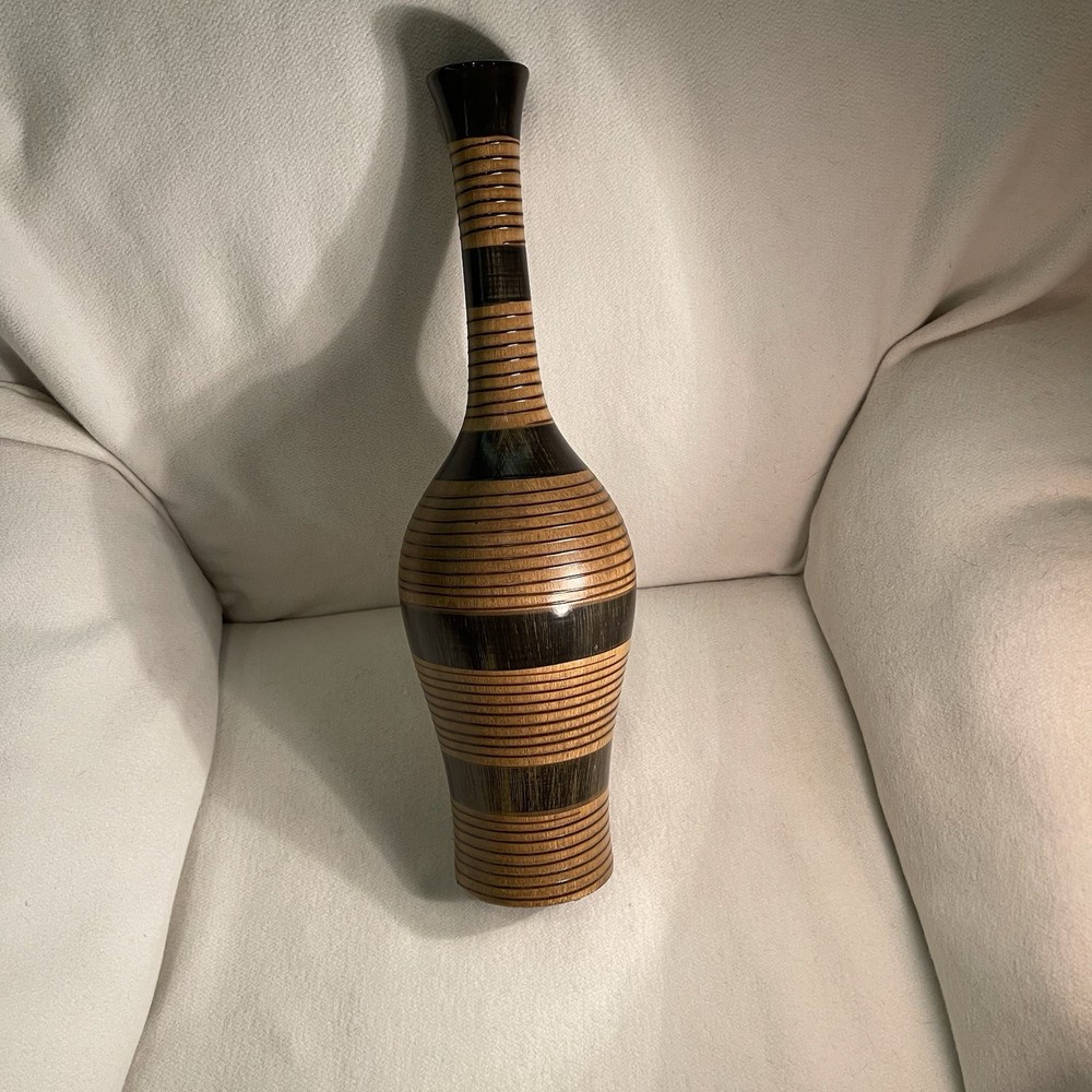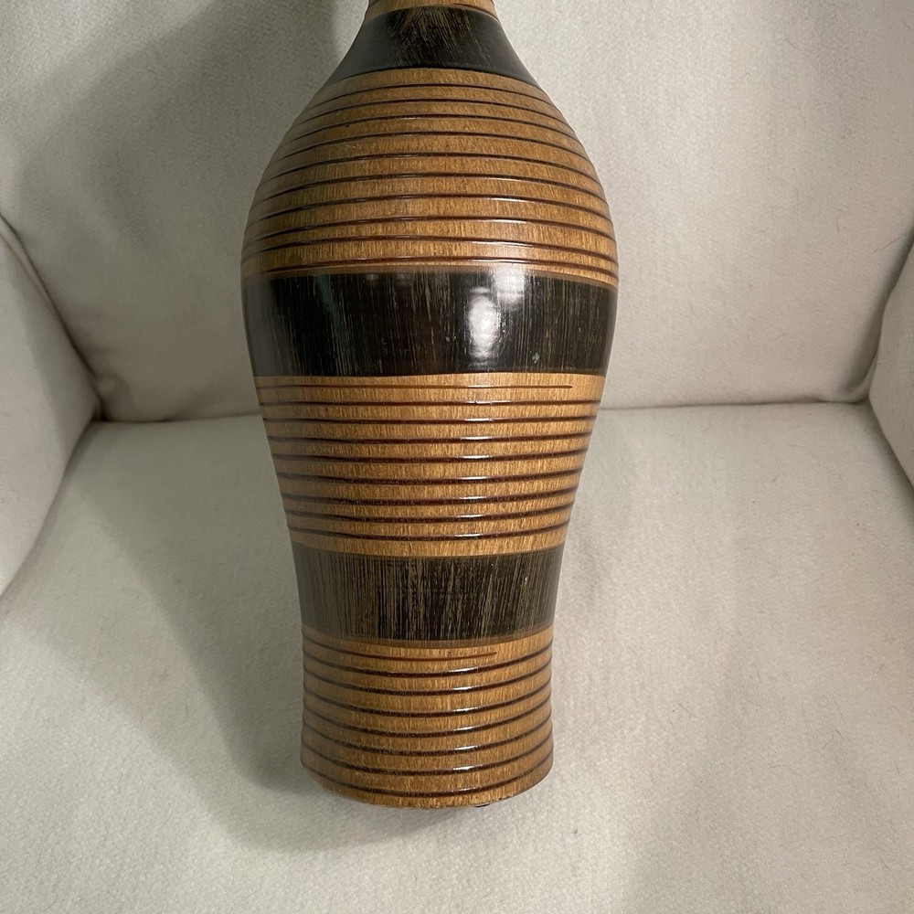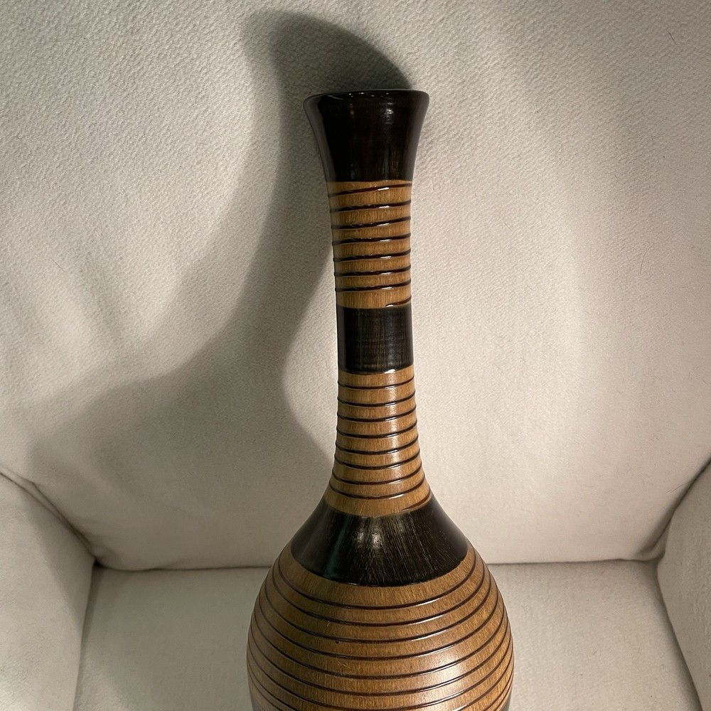 Elevate your space with a touch of rustic elegance. This 19-inch ceramic vase offers a unique wooden texture that brings the beauty of nature into any room. Its brown color scheme and circular pattern evoke a country-style charm, perfect for those who appreciate the simplicity of the earthy aesthetic. Designed to serve as a decorative piece, this art vase is both versatile and eye-catching. The varying width dimensions of the top, middle, and bottom provide a dynamic visual appeal, while its sturdy weight of 2.1 lbs ensures it stands firm as a centerpiece or on a mantel. Ideal for anyone looking to add a vintage-inspired, nature-themed accent to their decor collection. Excellent condition. No chips or cracks.