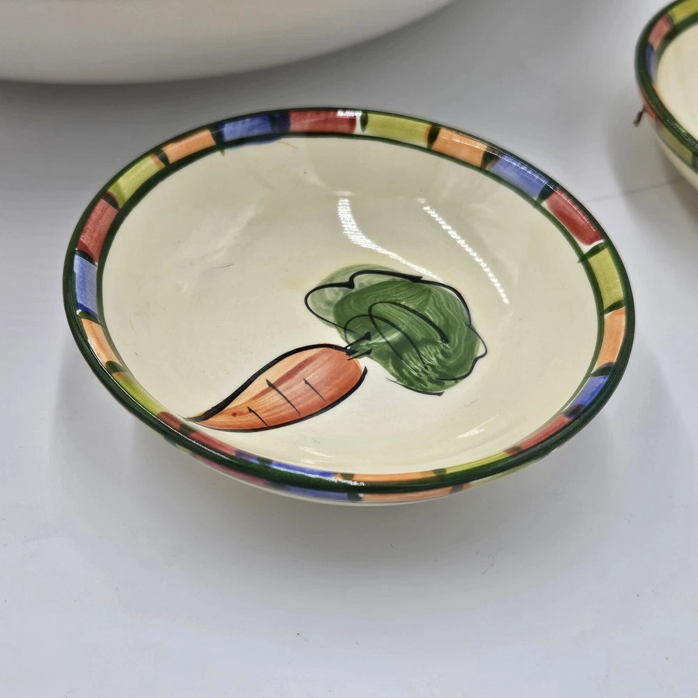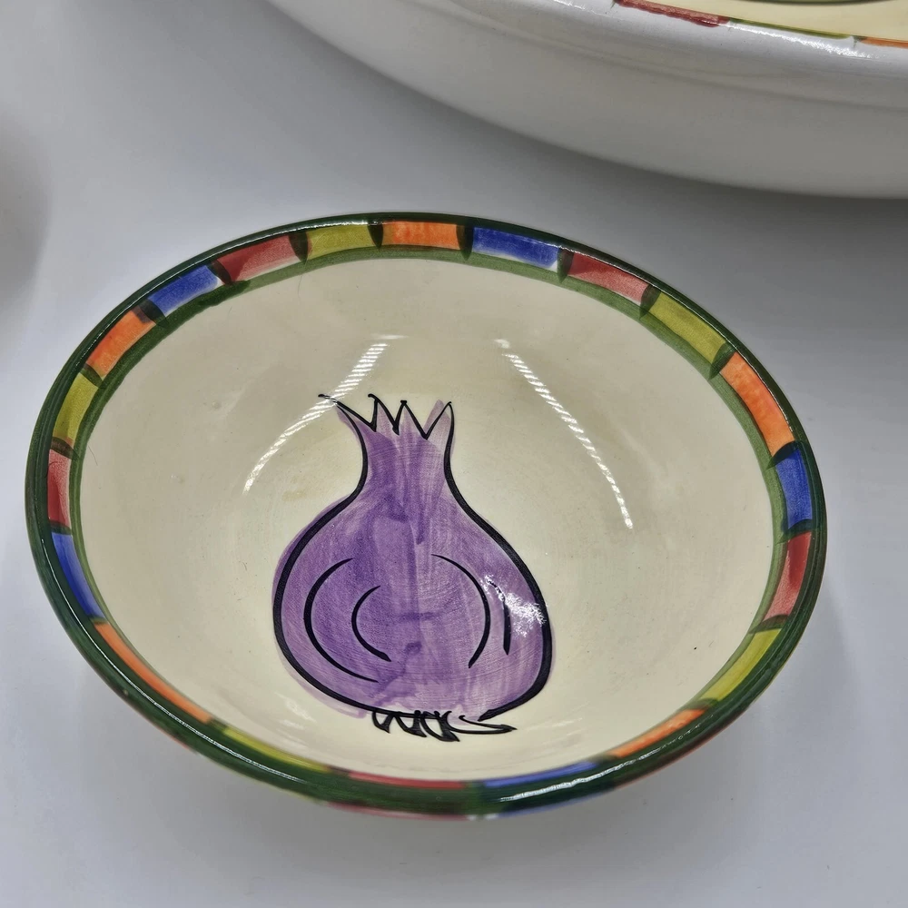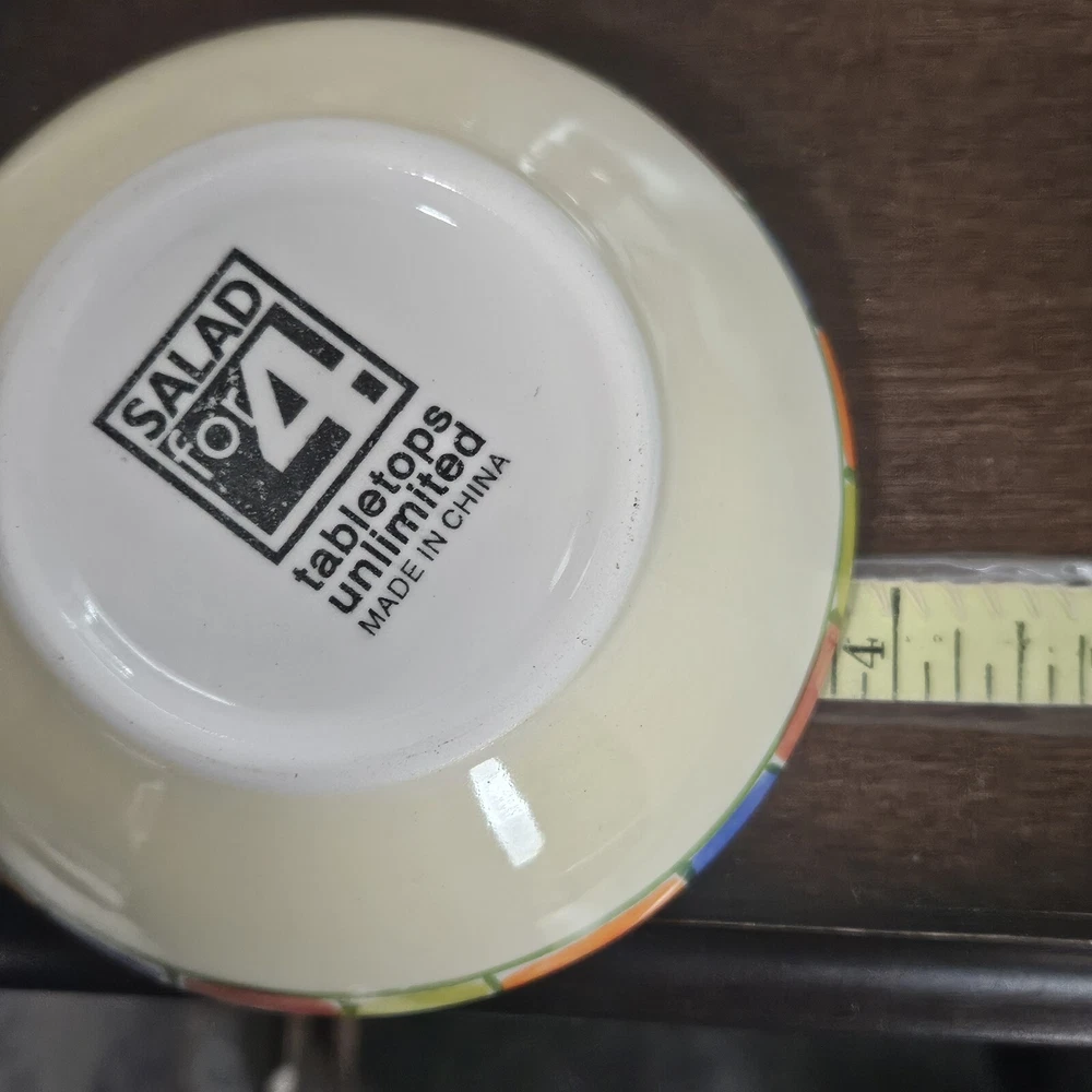 Finish: Shiny Personalize: No Year Manufactured: 2002 Shape: Round Number of Items in Set: Seven-Piece Theme: Food/Kitchen, Garden, Bottle Item Diameter: 6 in Country/Region of Manufacture: China Occasion: Anniversary, Birthday, Adult, Bridal Shower, Christmas, Easter, Engagement, Housewarming, Mother's Day, Spring, Summer Type: Salad Bowl Style: Farmhouse Color: Multicolor Model: 4 Brand: Table Tops Unlimited Item Height: 8.5" Pattern: Novelty Department: Adults Material: Ceramic