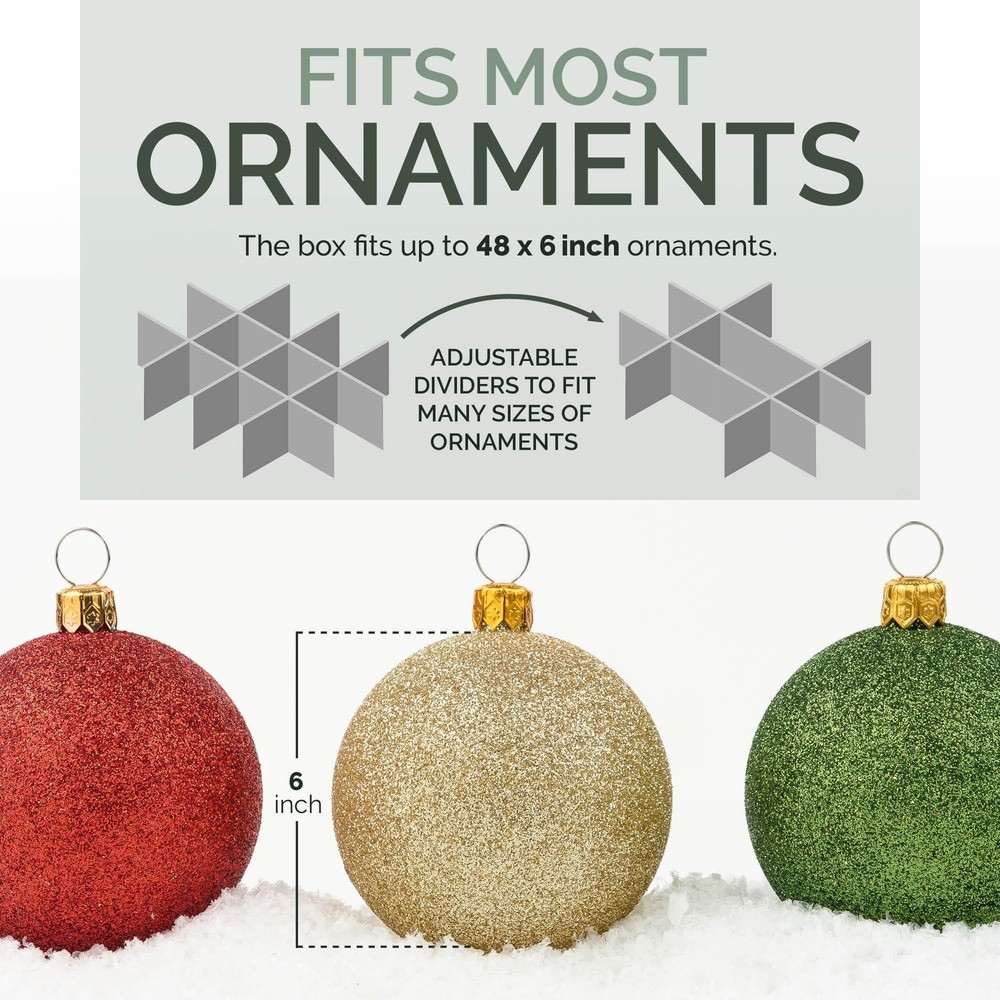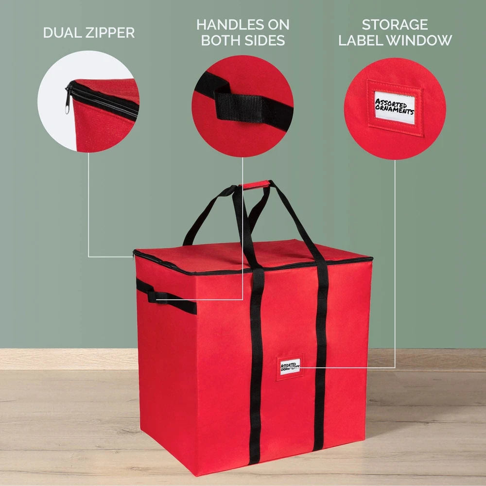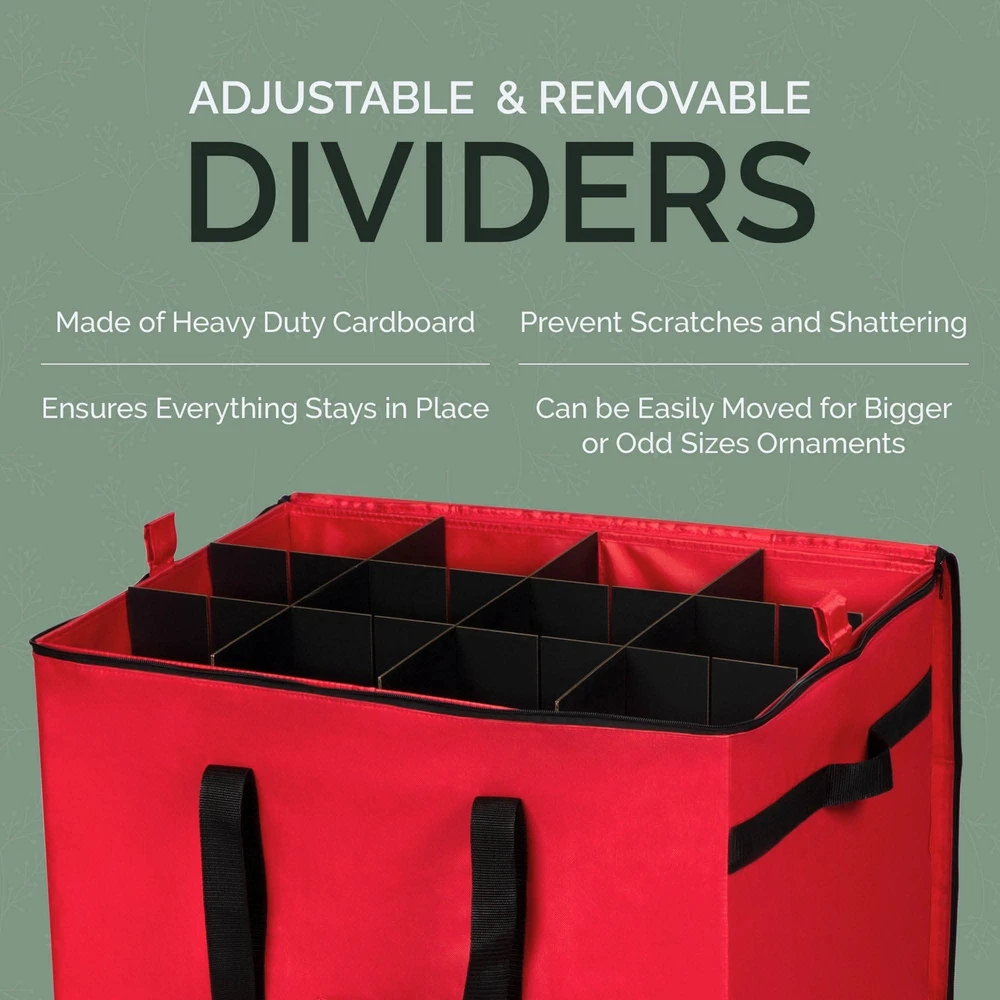 Christmas Extra Large Ornament Storage Container - Box Stores Up to 48 – 6” Ornaments – With 4 Individual Trays -Heavy Duty 600D Tear Resistant Material, Zippered, Adjustable Dividers. Product Details Size: 48 6" Ornaments Color: Red Brand: HOLDN’ STORAGE MPN: 6445248 UPC: 850027756479 EAN: 0850027756479 Brand: HOLDN’ STORAGE Material: Tear-Resistant 600D Color: Red Product Dimensions: 24.75"L x 18.75"W x 24.5"H Special Feature: Stackable, Adjustable Dividers, Zippered Lid, Impact Resistant Recommended Uses For Product: Decorations Closure Type: Zipper Shape: Rectangular Number of Items: 1 Size: 48 6" Ornaments Brand: HOLDN’ STORAGE Material: Tear-Resistant 600D Color: Red Product Dimensions: 24.75"L x 18.75"W x 24.5"H Special Feature: Stackable, Adjustable Dividers, Zippered Lid, Impact Resistant Recommended Uses For Product: Decorations Closure Type: Zipper Shape: Rectangular Number of Items: 1 Size: 48 6" Ornaments Number of Sets: 1 UPC: 850027756479 Manufacturer: HOLDN’ STORAGE Part Number: 6445248 Item Weight: 10.33 pounds Item model number: 6445248 Style: Modern Pattern: Solid Number Of Pieces: 1 Special Features: Stackable, Adjustable Dividers, Zippered Lid, Impact Resistant Included Components: Carry Handles Batteries Included?: No Batteries Required?: No Date First Available: September 15, 2022 600D Tear resistant TEAR RESISTANT 600D MATERIAL: This Christmas Ornament Storage Container will keep your decorations safe and secure. The chest is made of premium quality 600D Tear-Resistant Material. The storage container features durable zippers for easy opening and closing and 4 individual stackable trays that can hold up to 48 - 6-inch ornaments. EASY TRANSPORT-DUST PROOF DESIGN: This Christmas Ornament Storage Container comes with 4 individual trays to make your tree decoration fun and hassle free. Container measures 24.75 W x 18.75 D x 24.5" H. The durable cardboard dividers can be adjusted to store big or small or oddly shaped ornaments into the cubes. No need for multiple containers. Recommended for Extra Large Ornaments. STURDY HIGH-QUALITY CONSTRUCTION: Engineered for a lifetime of quality and service this Christmas Ornament Storage Box is made of highly durable, heavy-duty cardboard, a non-tear 600D exterior. This holiday storage container preserves your ornaments from dirt, dust and debris while the dividers prevent them from bumping into each other preventing breaks. Recommended for Extra Large Ornaments. CHEERFUL & FUN HOLIDAY COLORS: The storage container comes in cheerful holiday colors and includes a clear identification card slot so you can label it and readily identify it from your other storage boxes. Durable handles allow you to comfortably carry the container or the tray anywhere. Unlike other trays, ours have side walls ensuring that the ornaments won't slide off
