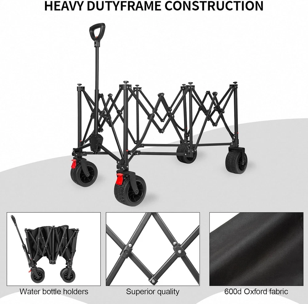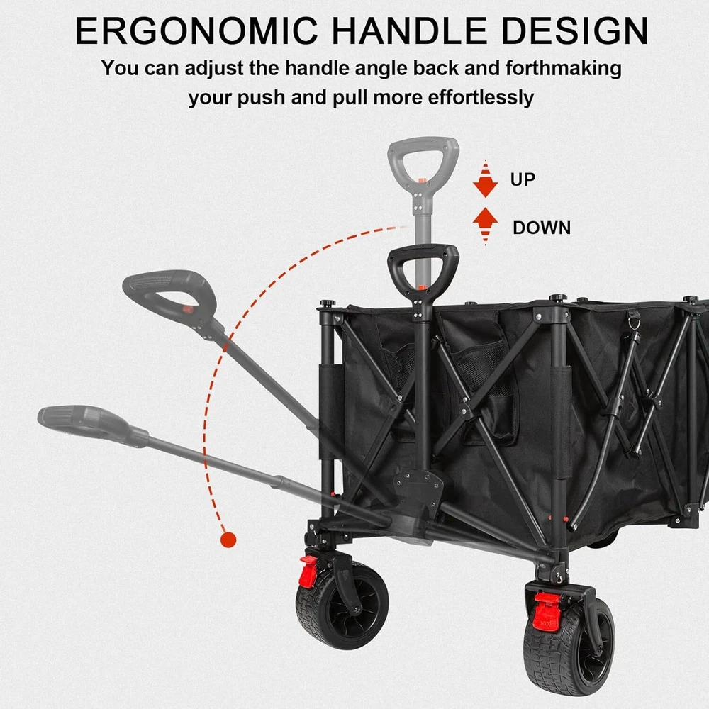 Description Features: Large 300L carrying capacity, this foldable wagon is a perfect cart for carrying all goods. Max loading weight is up to 440LBS. Big Size 4 inch Width Detachable Wheels and Two brakes-Our folding wagon cart equipped all-terrain off-road wheels that are thickened and mud-resistant, making it the perfect choice even in muddy road condition. The angle-adjustable handles provide ergonomic comfort during use, while the 2 brakes on the front which stop the cart easily when not in use. Solid and Durable-Made of a heavy-duty iron frame, the structure welded is absolutely , and it will not fade and rust when used outdoors for a long time. Foldable and Compact-The fabric material is made of 600D Oxford fabric and PVC coating to , easy to clean. Multifunction uses-It's suitable for family outings, gardening, outdoor concerts and movies, sporting events, or anywhere you want, It's a great outdoor utility wagon as a camping wagon, fishing wagon, or pet wagon. Product Details: Product Dimensions: 42.5"D x 27"W x 24.5"H Brand: Prodico Material: Carbon Steel Color: Black Special Feature: Adjustable Handle, Heavy Duty, Collapsible, Foldable Handling We will ship all orders within 1 business day of payment. Delivery We Do Not Ship Outside of the Continental US. Return Policy All items qualify for returns within 30 days of receipt. Buyer is responsible for return shipping on any item that is not damaged. Feedback We take our reputation seriously, we buy and sell online, so we understand the value of trust. If you are unsatisfied with your order, please contact us and we will work with you to resolve it to your satisfaction.