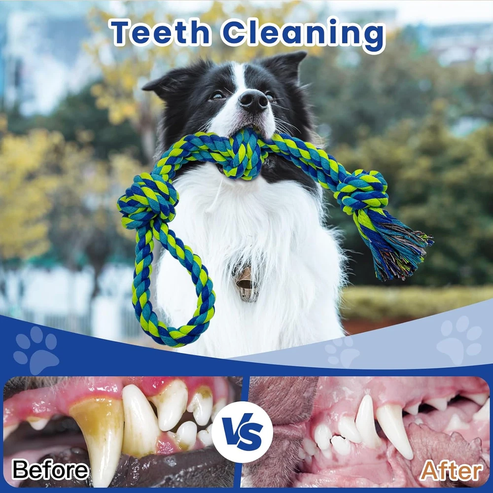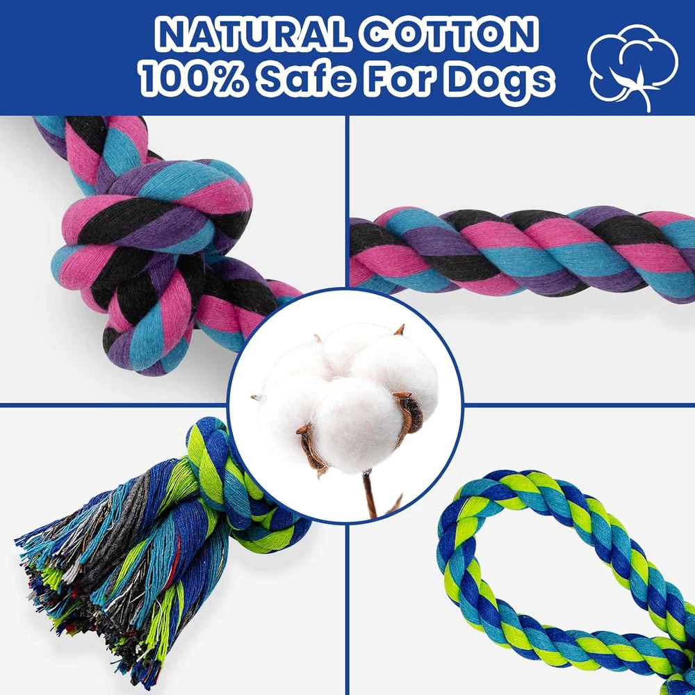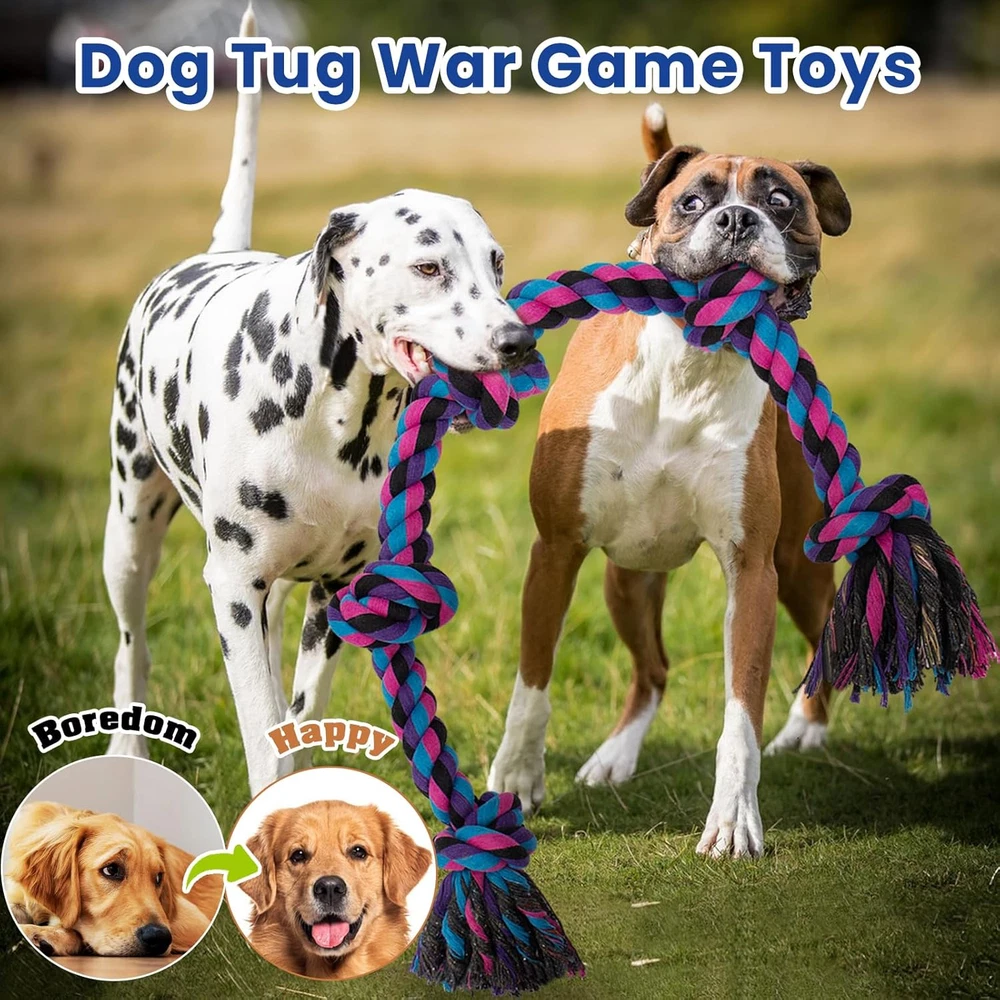 XL Rope Chew Toy: Value 2 Pack, 36 inches of 5 knots and 21.5 inches of 3 knots, intended for large and medium dogs, the knots of the dog chew rope make it easier to biting,chewing, shaking and tugging Safe and Durable: Dog chew toy set is made of high-quality 100% natural cotton, safe and durable. Tightly woven, wear-resistant, and sturdy construction allowing the dog toy to withstand rough play and aggressive chewing Teeth Cleaning: Rope dog toys can safely clean the teeth of dogs. The natural cotton can gently floss in between dog's teeth for deeply cleaning, maintain dog's oral health, and make the teeth shine fresh Interactive Dog Toys: This dog rope toy is perfect for tug of war. Enjoy a tug a war game with the strong dog toy for aggressive chewers. You can play various interactive games with the dog, transfer dog's sight from furniture and shoes to chew toys. It will become the best toy for our friends Perfect Dog Gift: Colorful design is perfect as a birthday or holiday gift for your dogs. It's more than just entertainment, it's also a means of exercise that helps keep our canine companions healthy. Rope dog toys are consumable and not truly indestructible. If your dog is a very aggressive chewer, we recommend play with supervision. If you are not satisfied with the use, you can contact us at any time and we will respond within 12 hours Product Description
